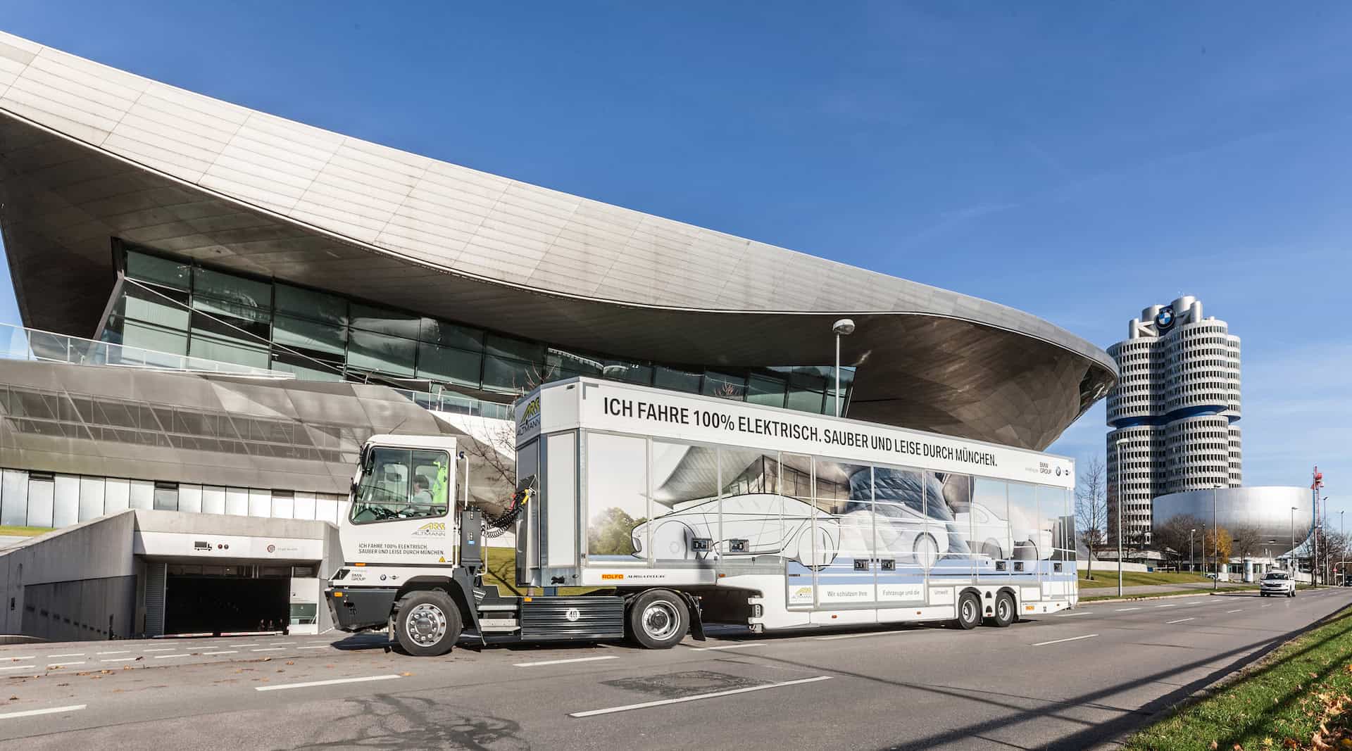 With its first e-truck, logistics service provider ARS Altmann AG transports new cars on a 15-km route through Munich: on its way from the town of Garching north of the city to the BMW Welt, the truck is loaded with vehicles to be handed over to customers; on the way back, it transports finished vehicles from the BMW plant, which will later be dispatched from the Garching site to the European sales network. A special feature of the new e-truck is its covered semitrailer.