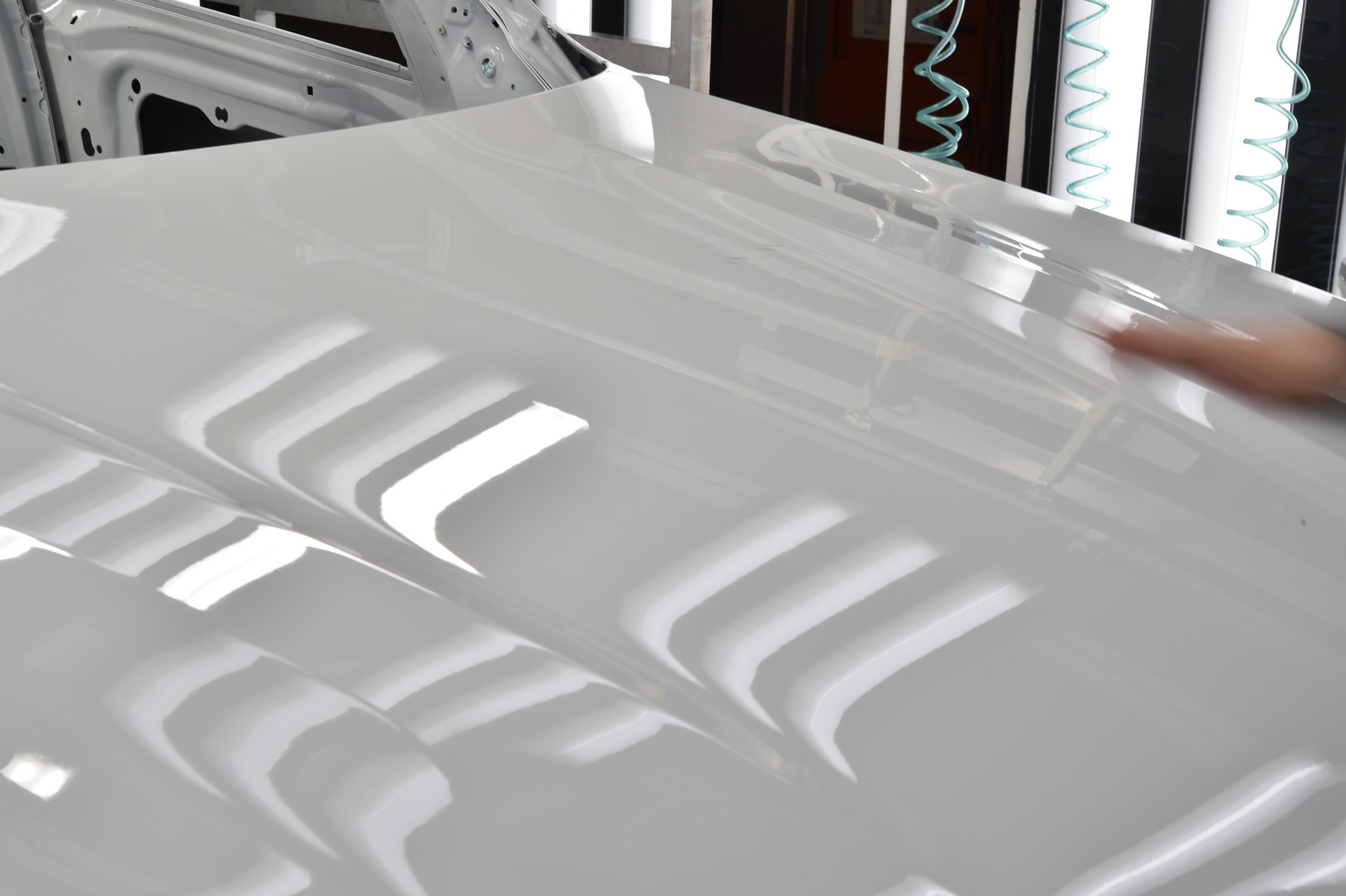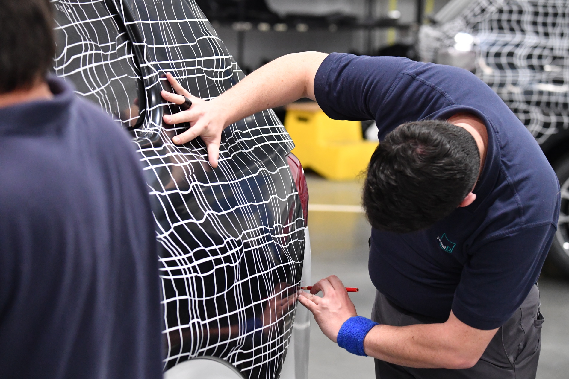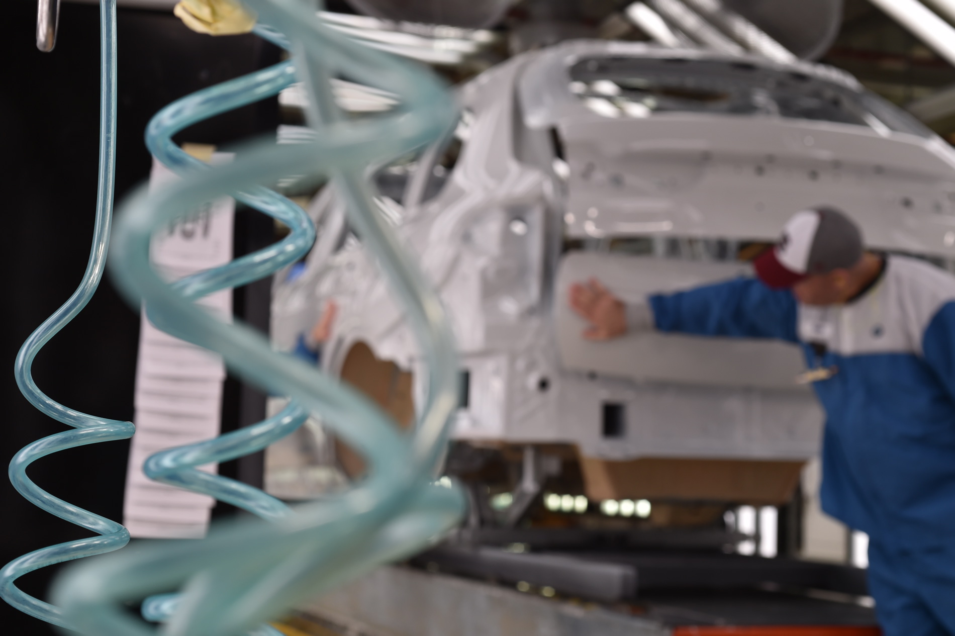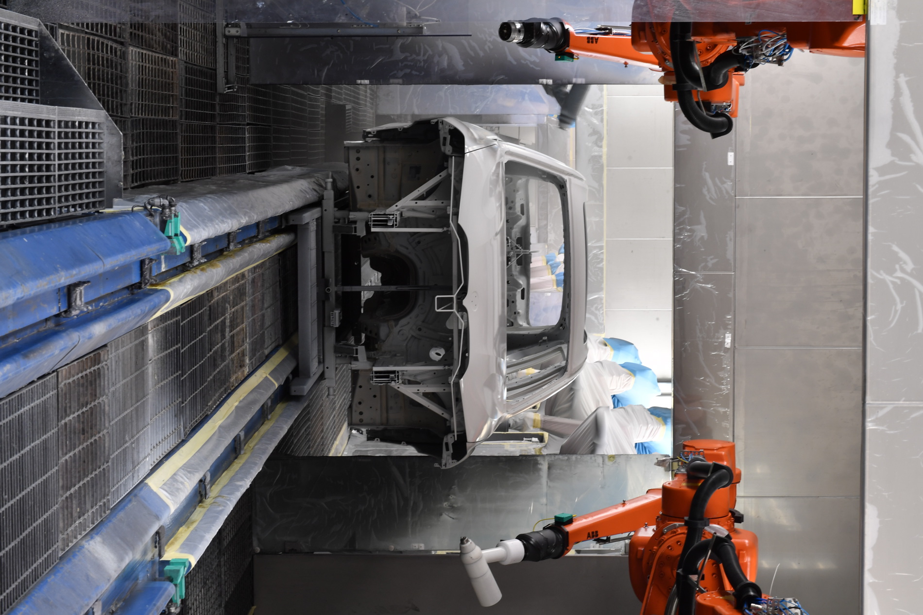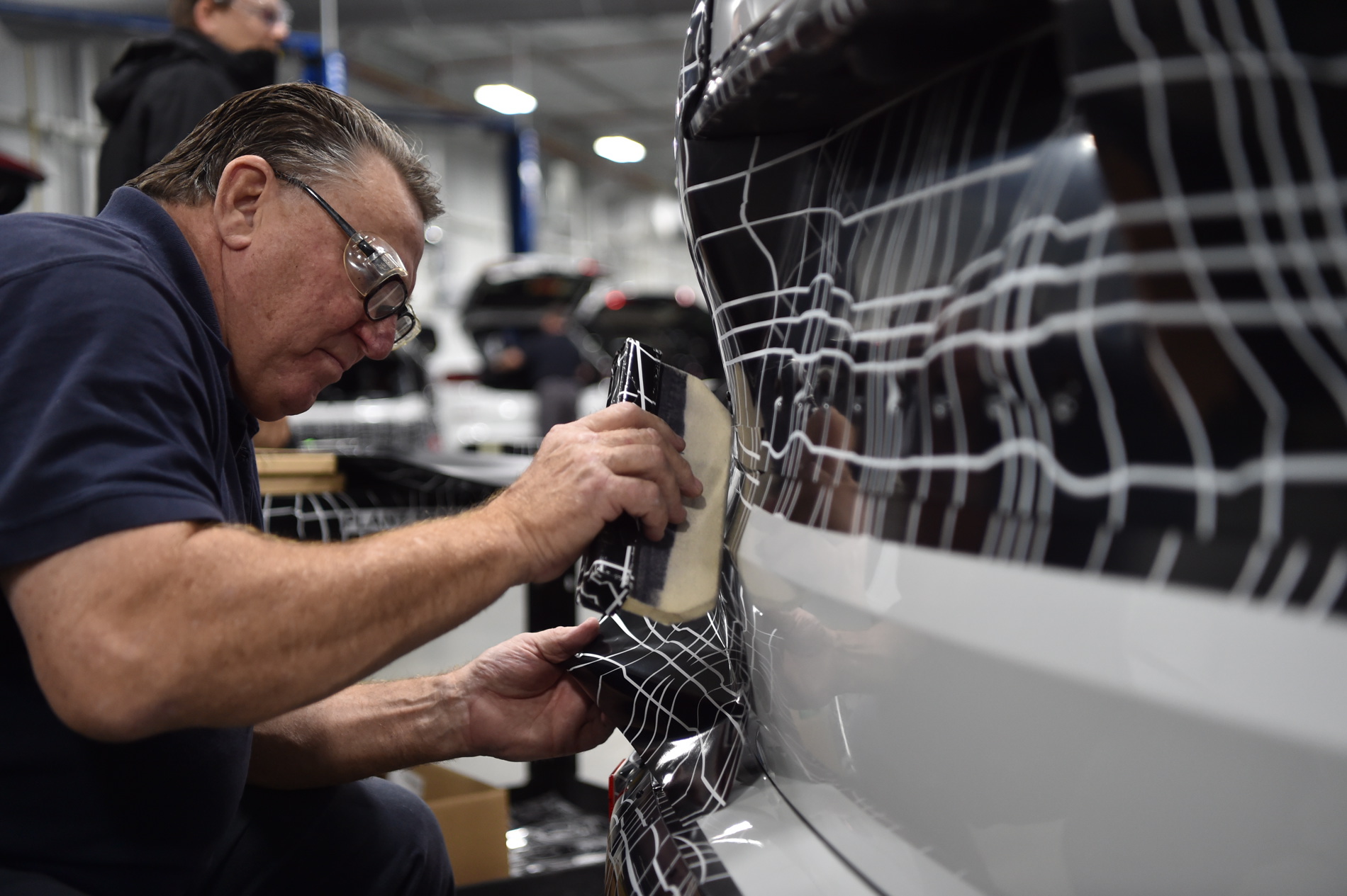 The pre-production model is fitted with its camouflage wrap while still at the plant. The conspicuous striped patterns are designed to help conceal the new SAV’s final look as far as possible.