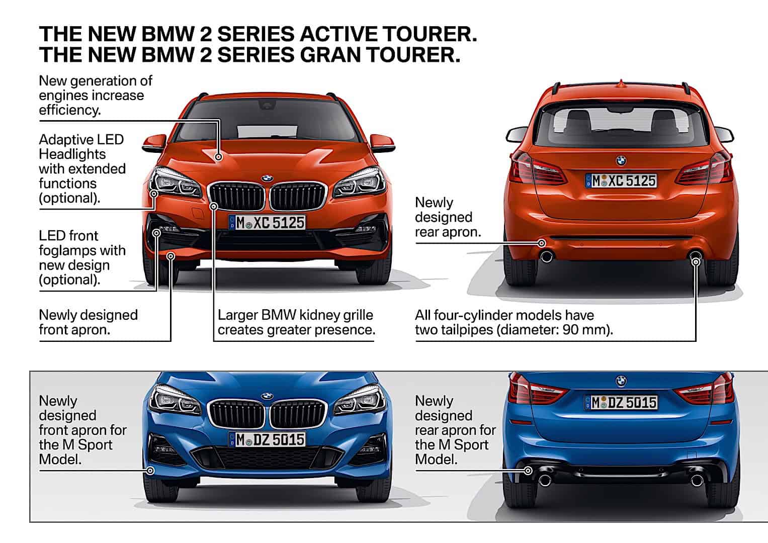 Under the hood the engines got mild tweaks to improve their outputs and and be more efficient. BMW 2 Series Active Tourer engines develop outputs from 109 hp to 231 hp while the power units for the BMW 2 Series Gran Tourer go from 109 hp to 192 hp. All diesel engines will employ exhaust gas treatment technology including a diesel particulate filter, NOX absorber catalyst and SCR (Selective Catalytic Reduction) system, which uses urea solution (AdBlue) injection to effectively reduce nitrogen oxides in the car’s exhaust gases. All four-cylinder diesels now feature BMW TwinPower Turbo technology incl. two turbochargers.