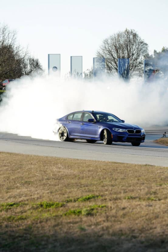 Mullins wastes no time and begins by quickly roasting the rear tires, getting them nice and smokey. Then, he quickly starts to drift the car around the small track they have set up. I’m not sure there’s ever a point when the M5’s rear tires aren’t spinning, as the screech of tires being turned into smoke and noise never ends. Thankfully, there are a lot of tires on hand, as shown in the video, because the M5 is very good at abusing them.