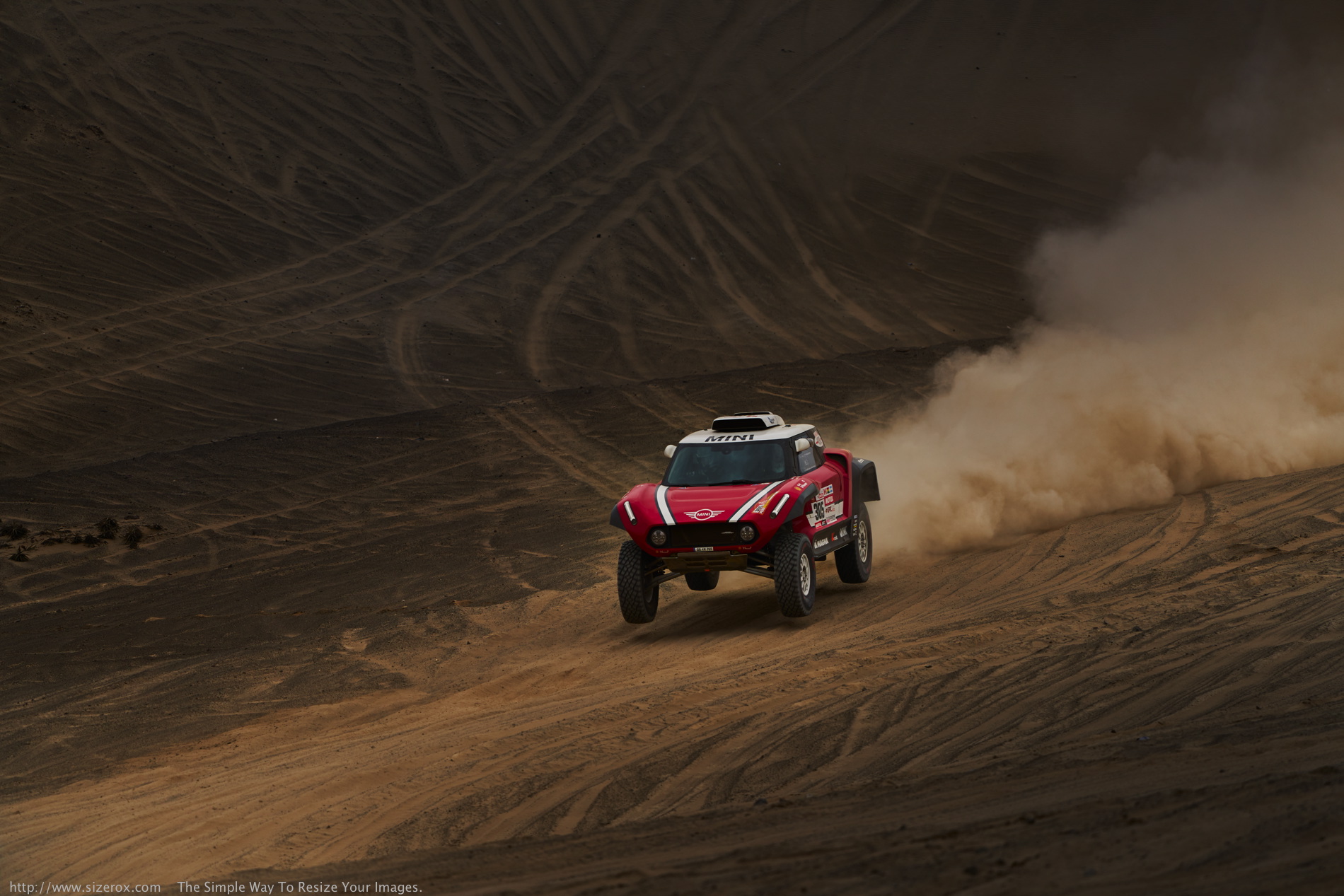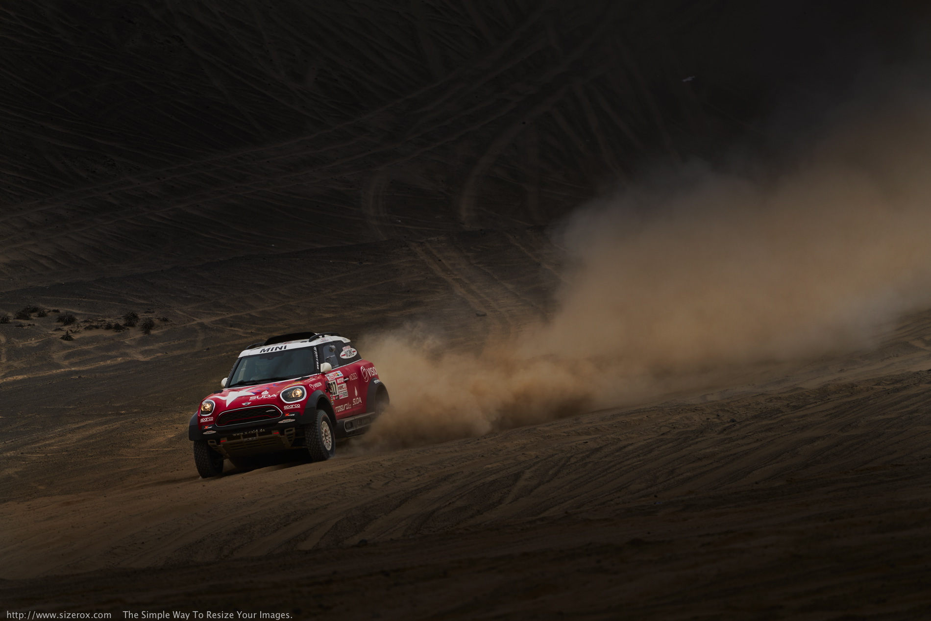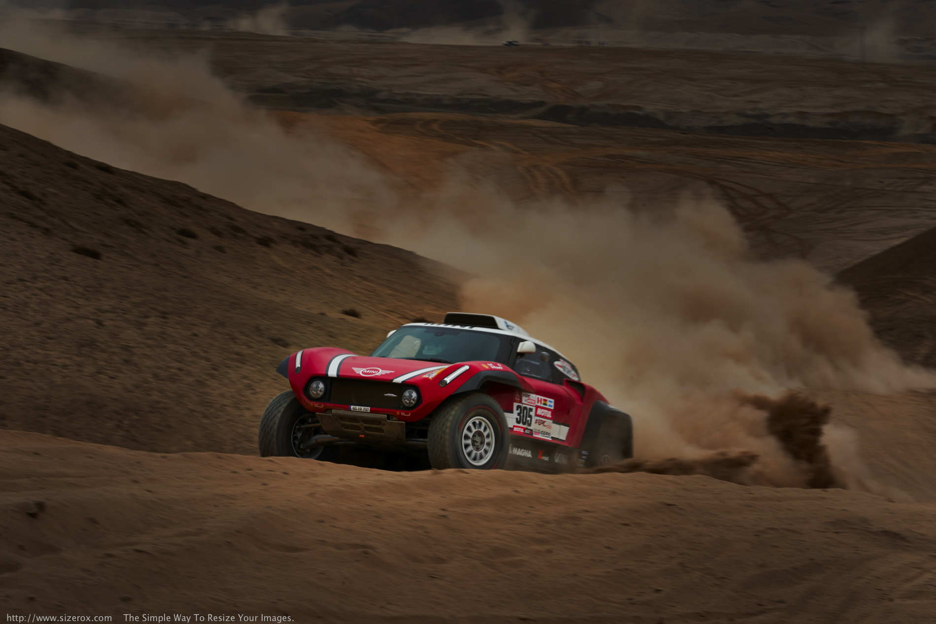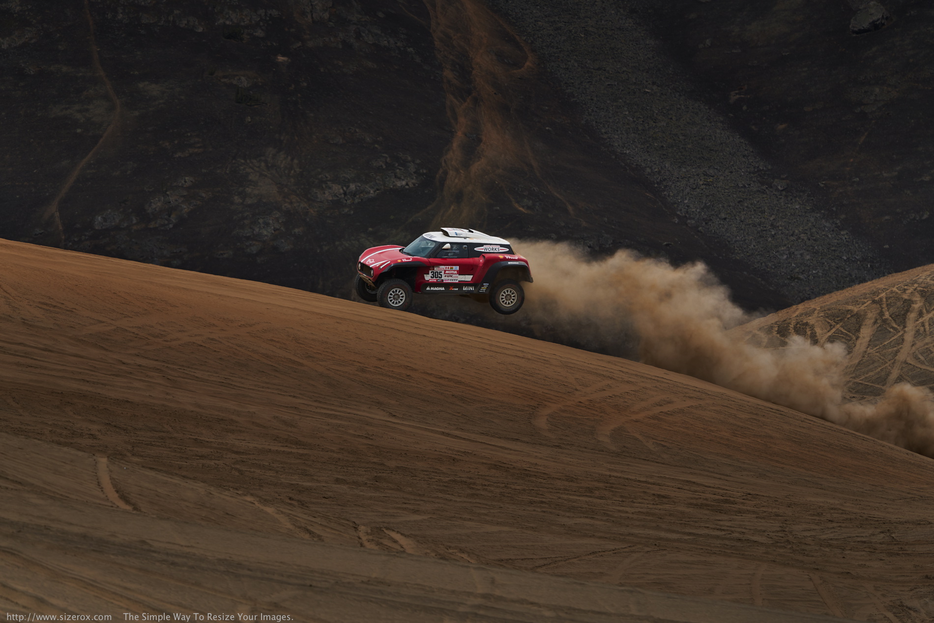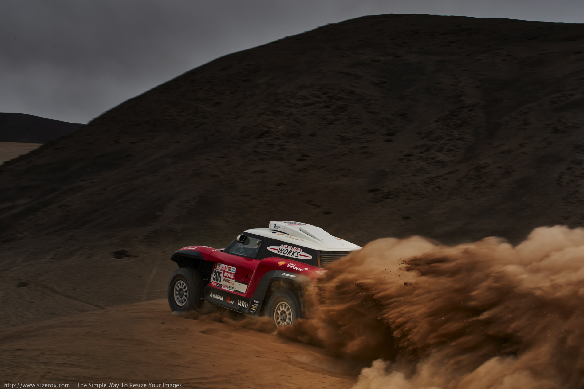 We jumped back into our front-wheel drive Countrymans and headed out to the desert, for another truly MINI experience. This time navigating the off the map, narrow sandy roads south of Pisco. After a true off-road experience which involved a Police bus blocking the road, allegedly involuntarily, we arrived at the Stage 2 checkpoint where we positioned ourselves in the long straight to see the Dakar cars flying through.