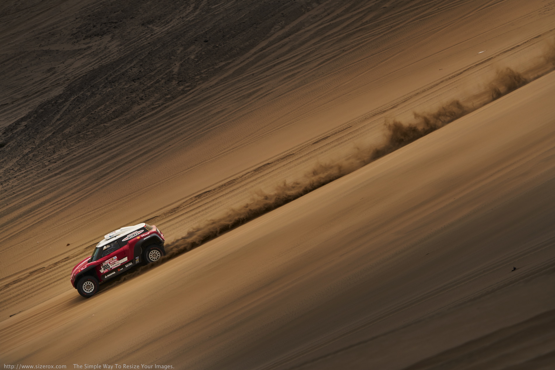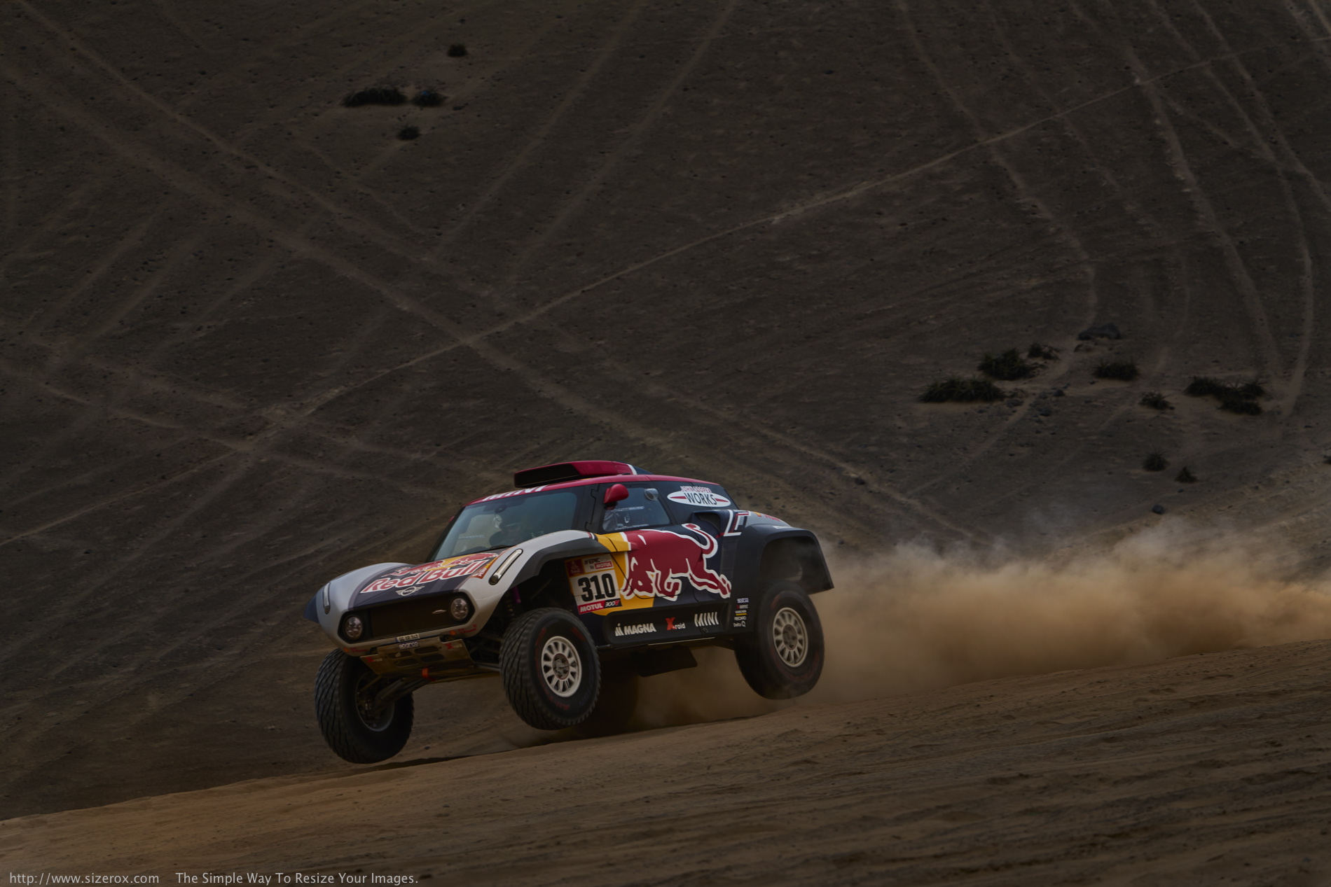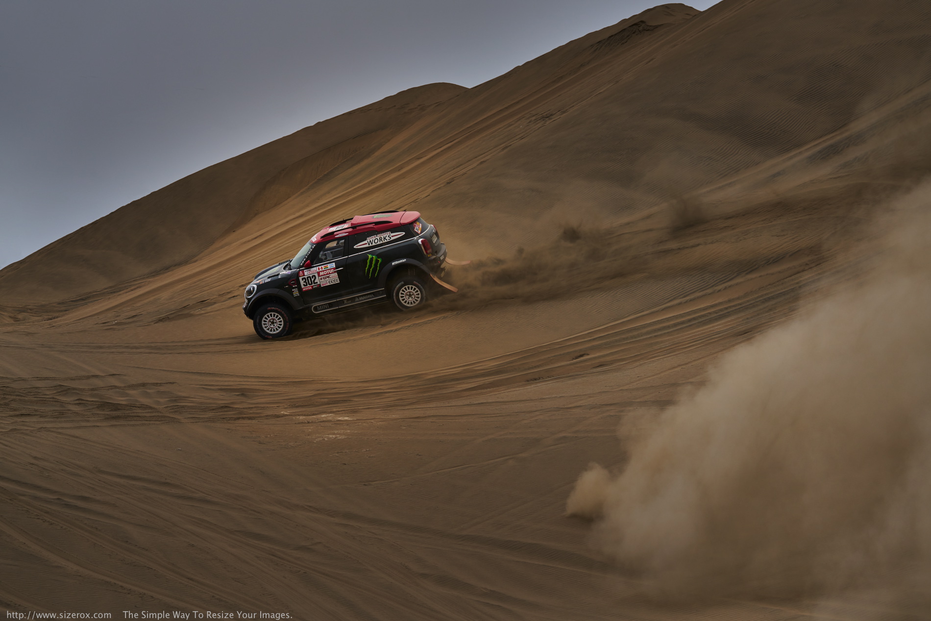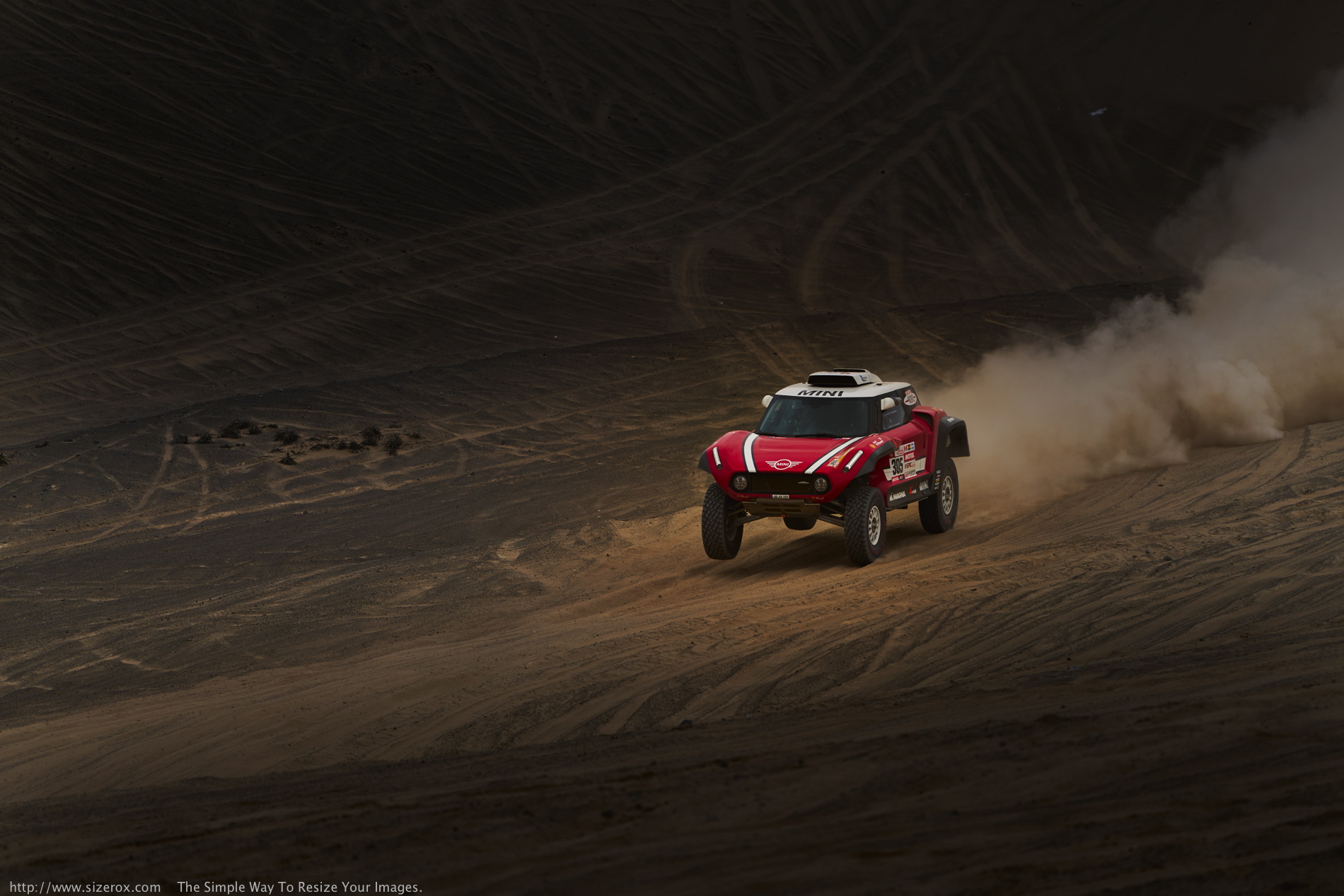 We jumped back into our front-wheel drive Countrymans and headed out to the desert, for another truly MINI experience. This time navigating the off the map, narrow sandy roads south of Pisco. After a true off-road experience which involved a Police bus blocking the road, allegedly involuntarily, we arrived at the Stage 2 checkpoint where we positioned ourselves in the long straight to see the Dakar cars flying through.