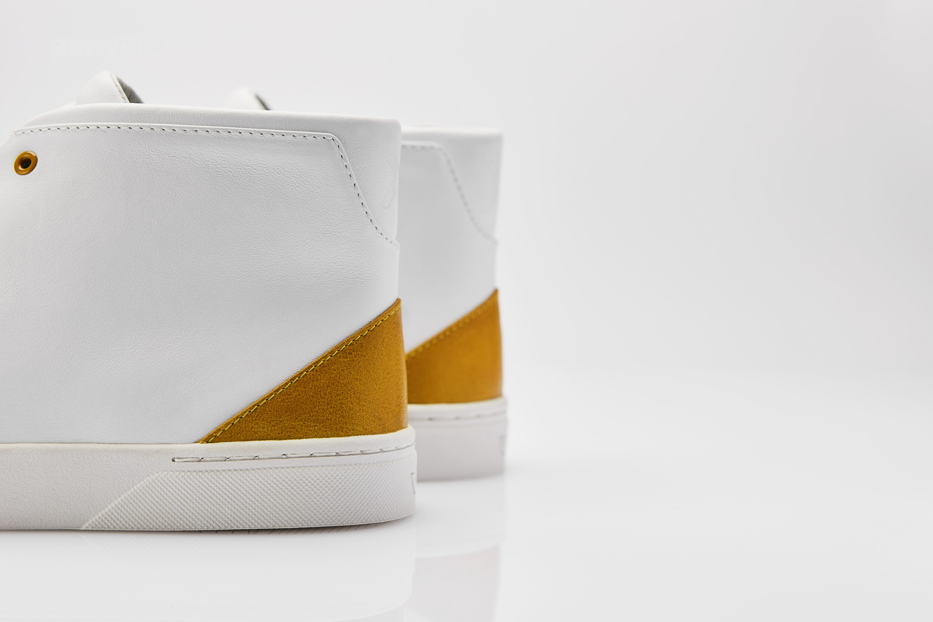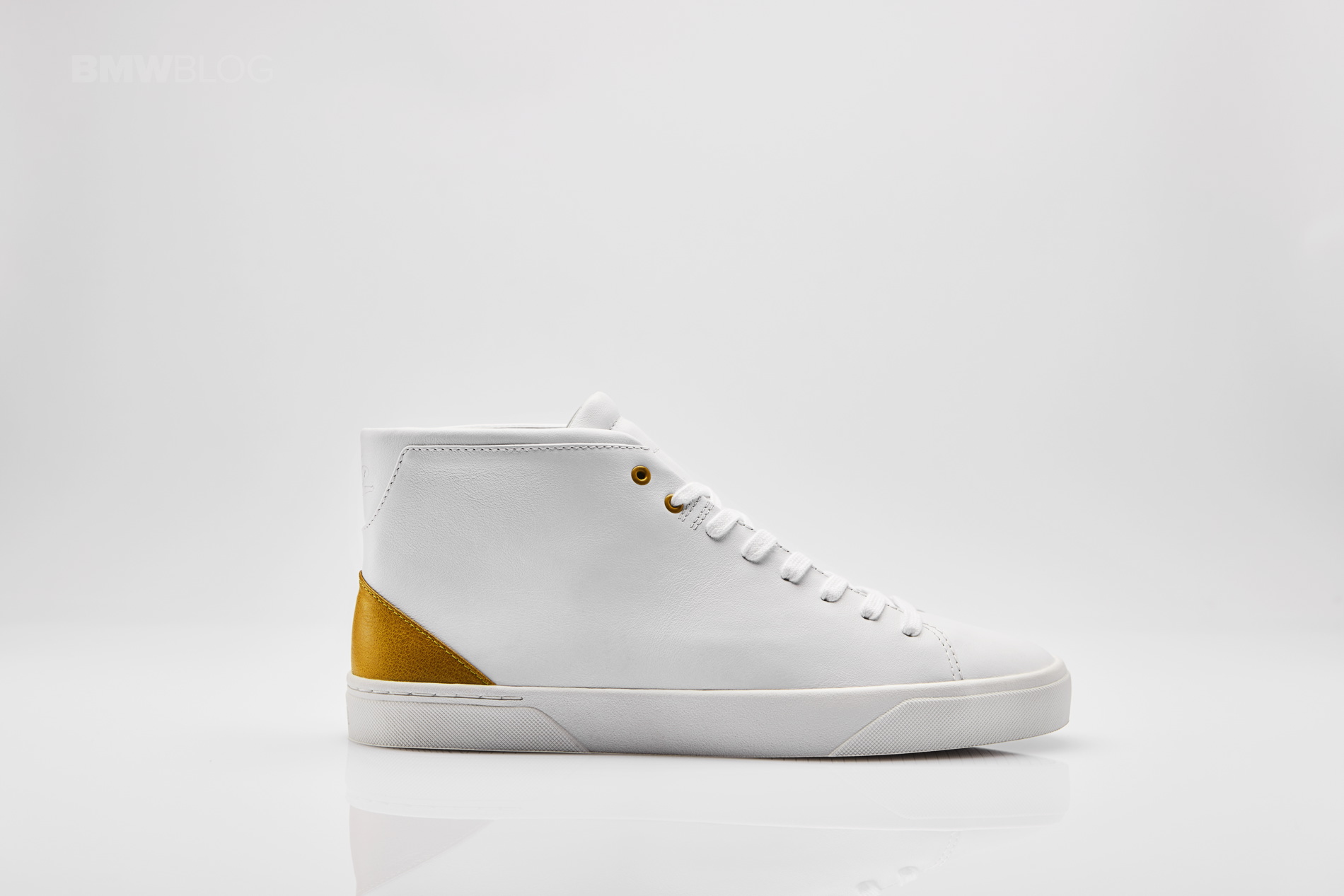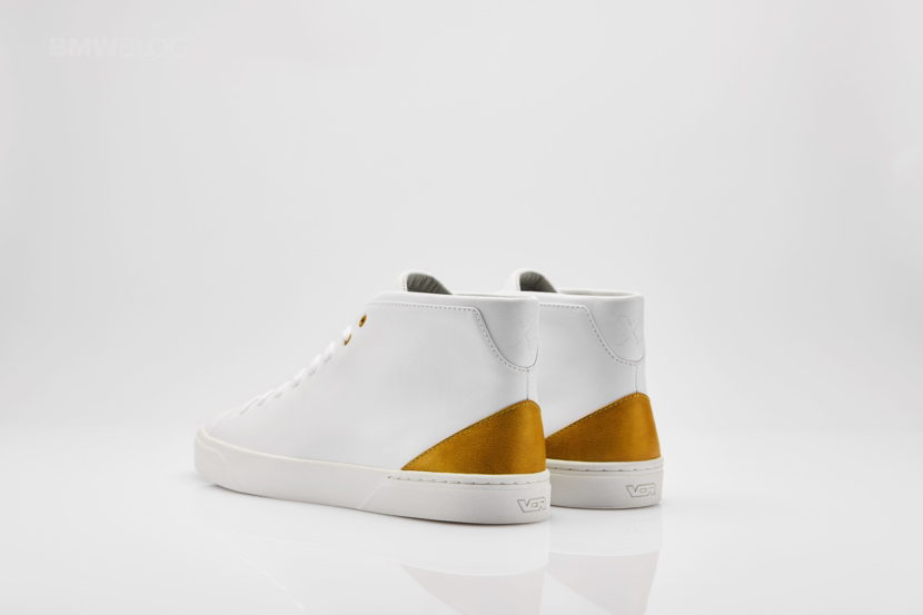 The white hightop sneaker feature a heel cap and eyelets in the Galvanic Gold, the positioning color of the BMW X2. There is also a subtle embossing with the word “X2” on the shaft end.