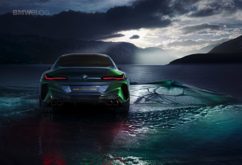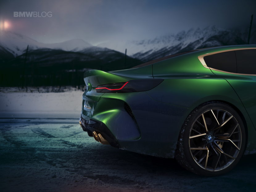 In the back, BMW Concept M8 Gran Coupe features a wide track and flared wheel arches with horizontal lines breaking up the rear end. At the outer edges, the slim, sculpted rear lights with black glass covers underscore the car’s wide stance on the road.