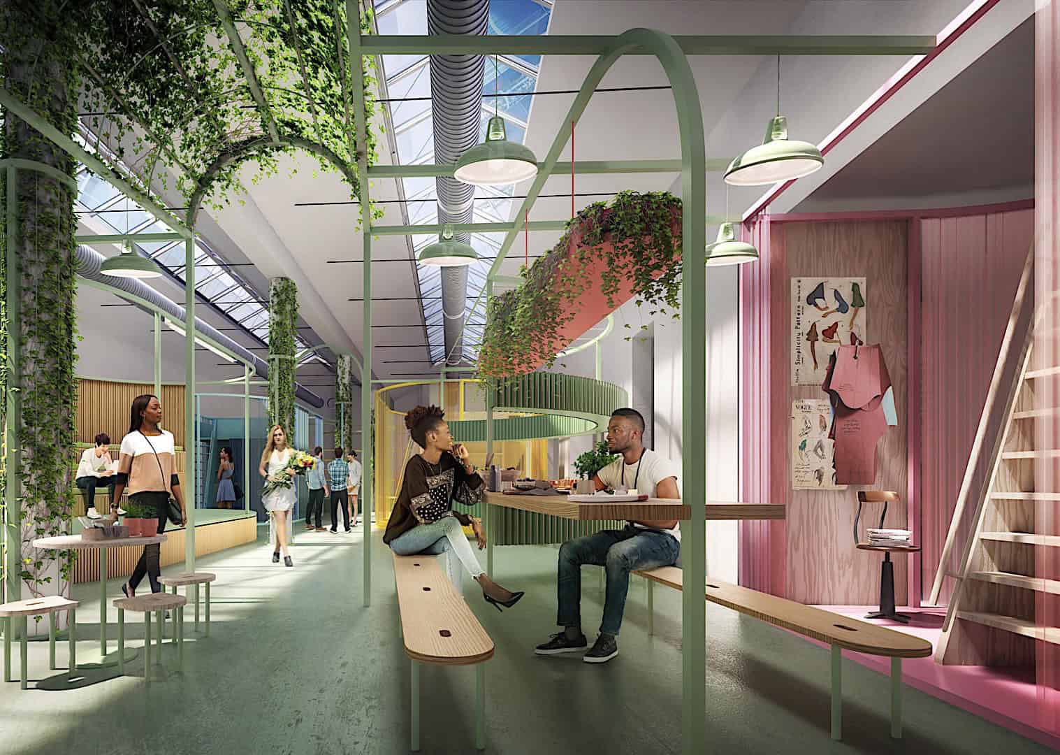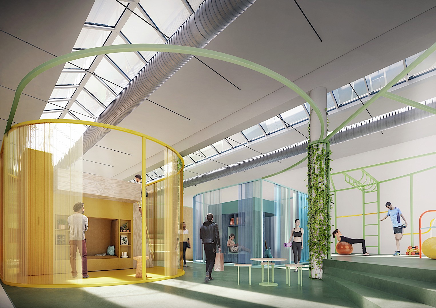 The MINI LIVING installation itself is housed in an adjacent room and showcases four example living space concepts along with a public area, such as a communal kitchen or outdoor gym. It all adds up to produce a self-contained micro-neighbourhood, while at the same time demonstrating that even the interior of an empty building can be put to good use for the future of urban architecture.