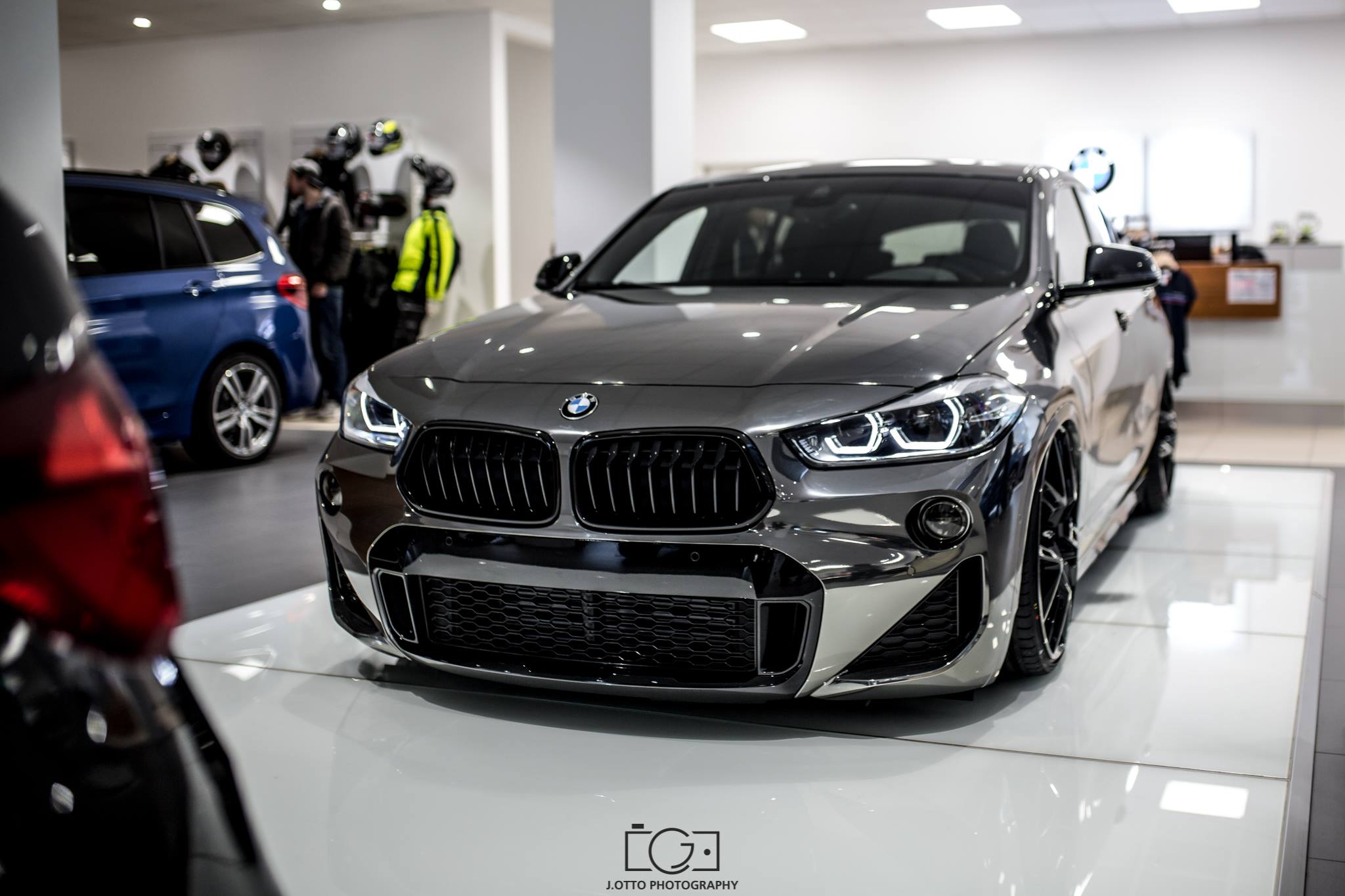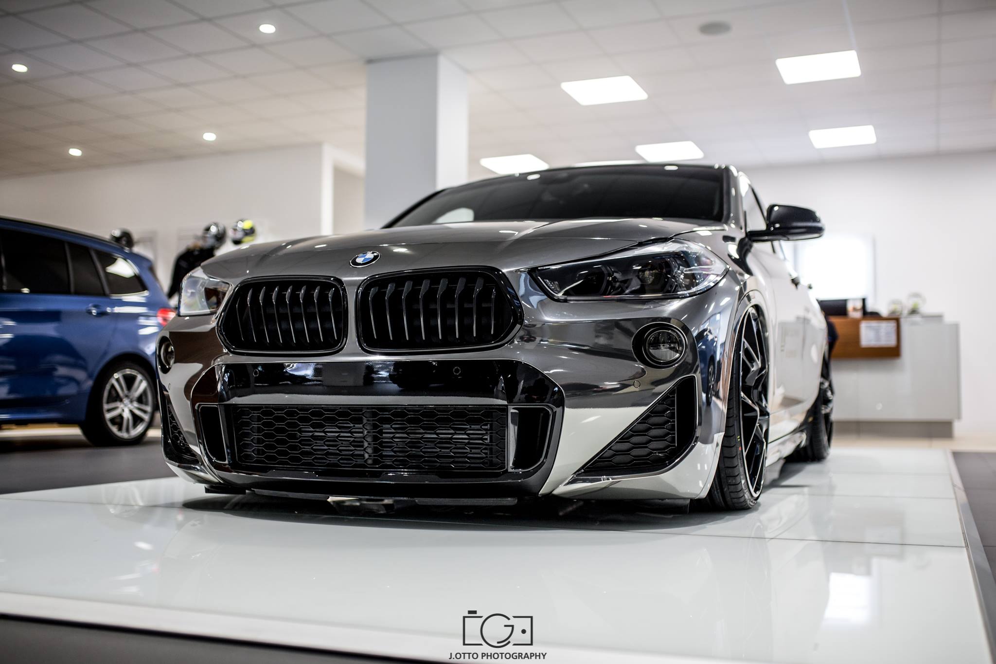Just in time for the dealer premiere of the new BMW X2, the car dealership Müller in Buchen Hettingen was also able to present the first tuned model. Responsible for the project is the Maxklusiv GmbH, which has extensively revised the lifestyle SUV. Two changes stand out immediately: the paintwork covered by a full wrap in black and chrome, and the extremely low stance.