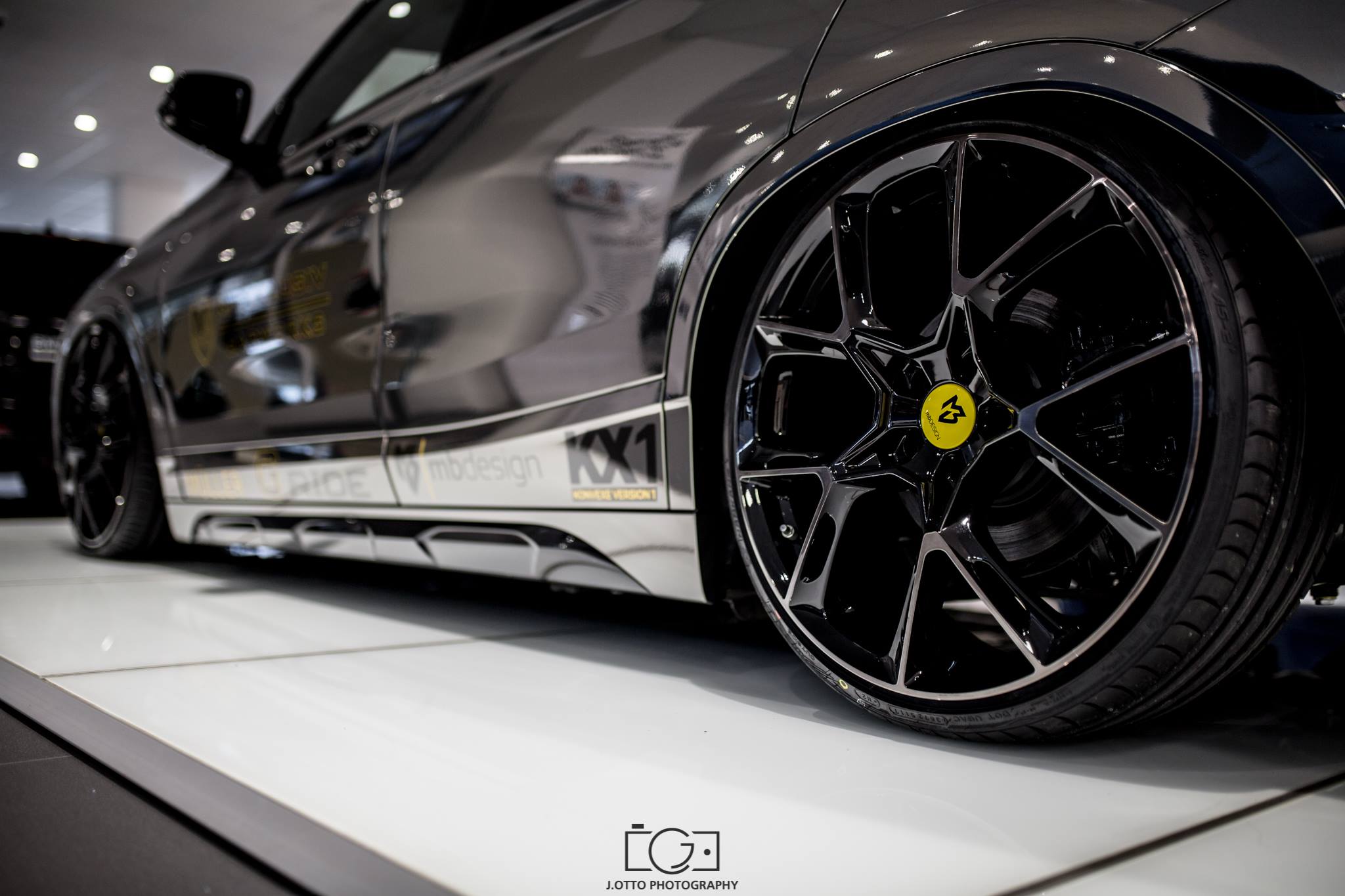 The impressive lowering is possible thanks to the G-Ride air suspension, which reduces the ground clearance of the BMW X2 to a minimum. At the touch of a button, the suspension brings the tuning X2 back up a bit, making the X2 suitable for everyday driving. The 21-inch alloy wheels from mbDesign are coated with a clear paint, which closely follows the shiny chrome foil of the vehicle.