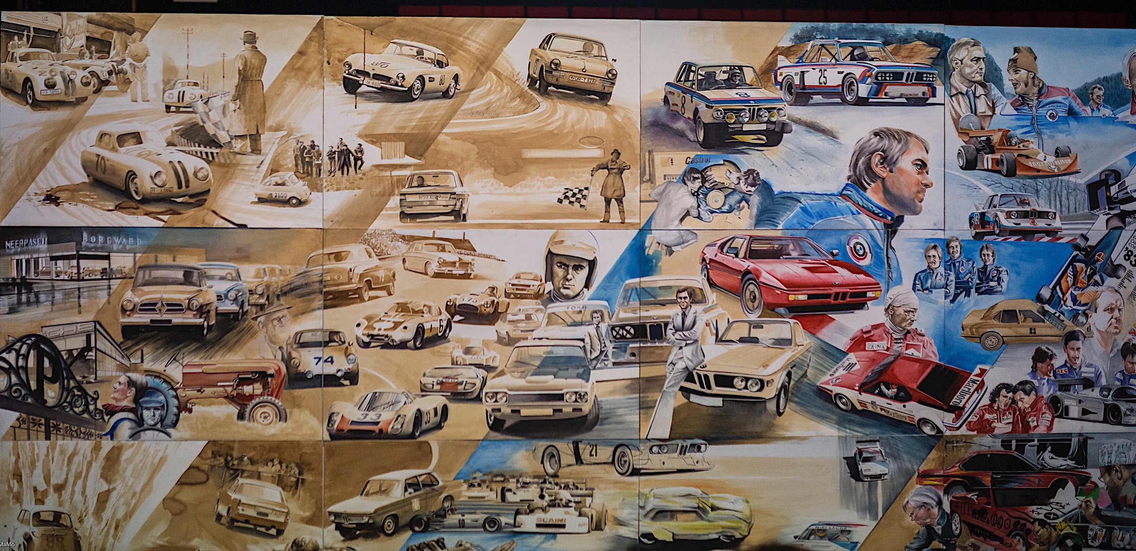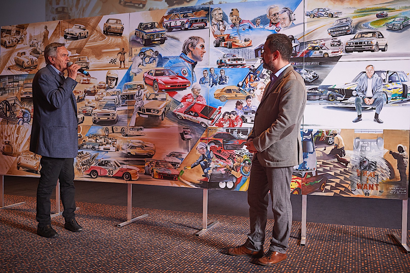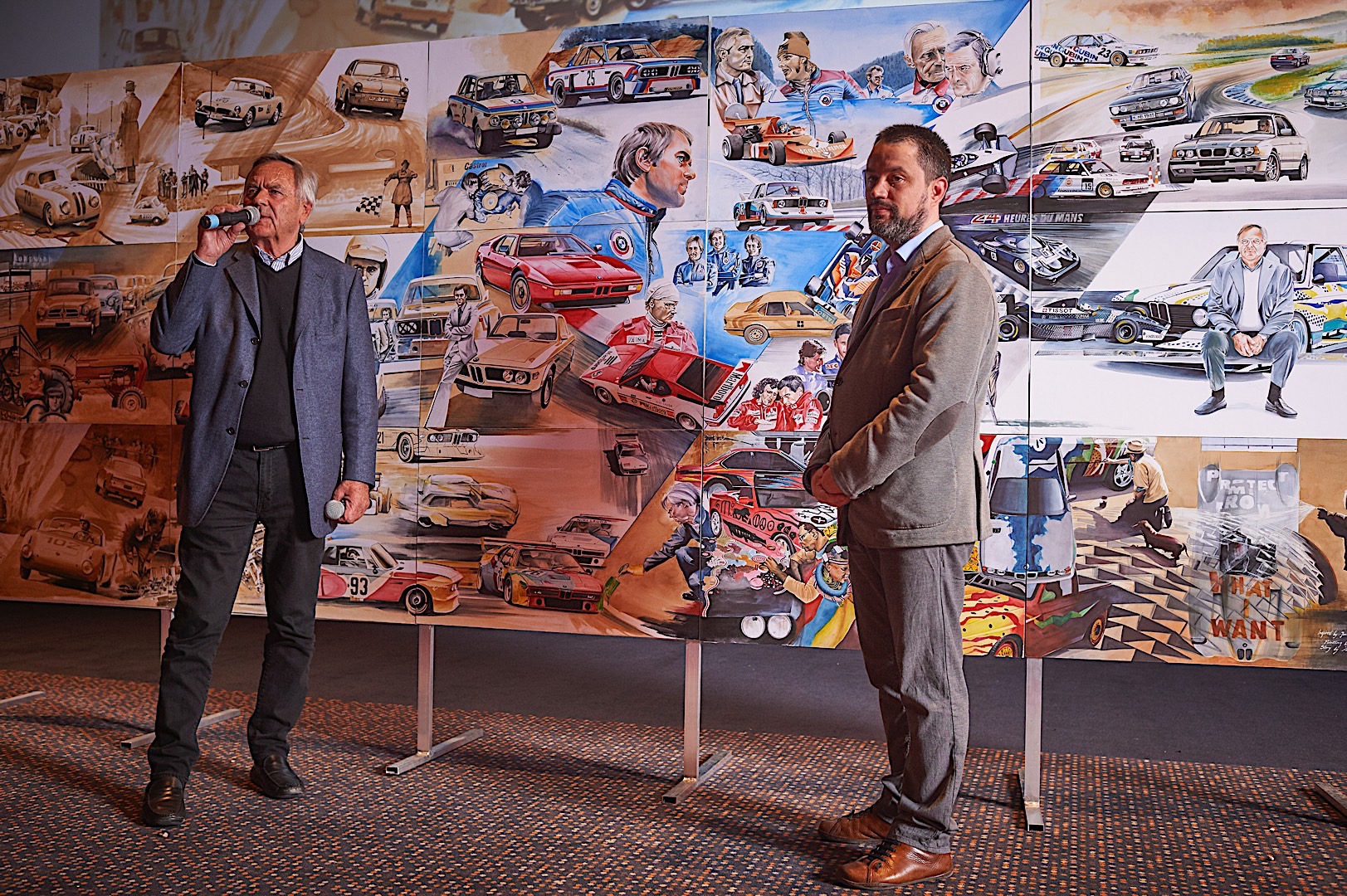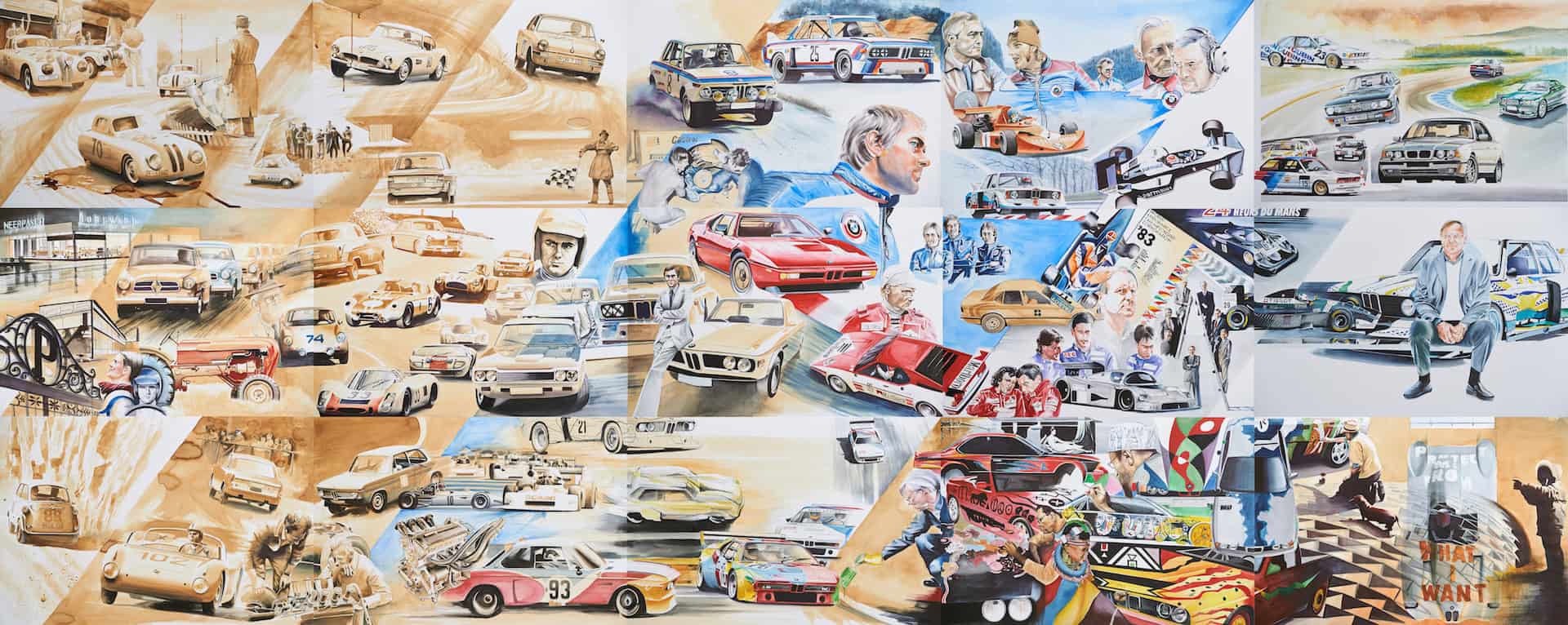 Standing tall at 1.8 meters by 4.5 meters in size, it covers the impressive CV Mr. Neerpasch put together during his lifetime. The work follows two stories that spread between the 1940s and 1990s – the evolution of the BMW brand in parallel to the automotive career of Jochen Neerpasch. They highlight important milestones for both the company and Neerpasch and his personal career, such as racecar driving, the implementation of BMW Motorsport as a standalone company in 1972, establishing the first major junior team in BMW’s racing history, facilitating unique competitions such as the BMW M1 Procar Championship as well as recognizing the potential of the interaction of art and motorsport by helping HervĂ© Poulain kick off the first BMW Art Car by Alexander Calder in 1975 which amounted into a collection that still continues today.