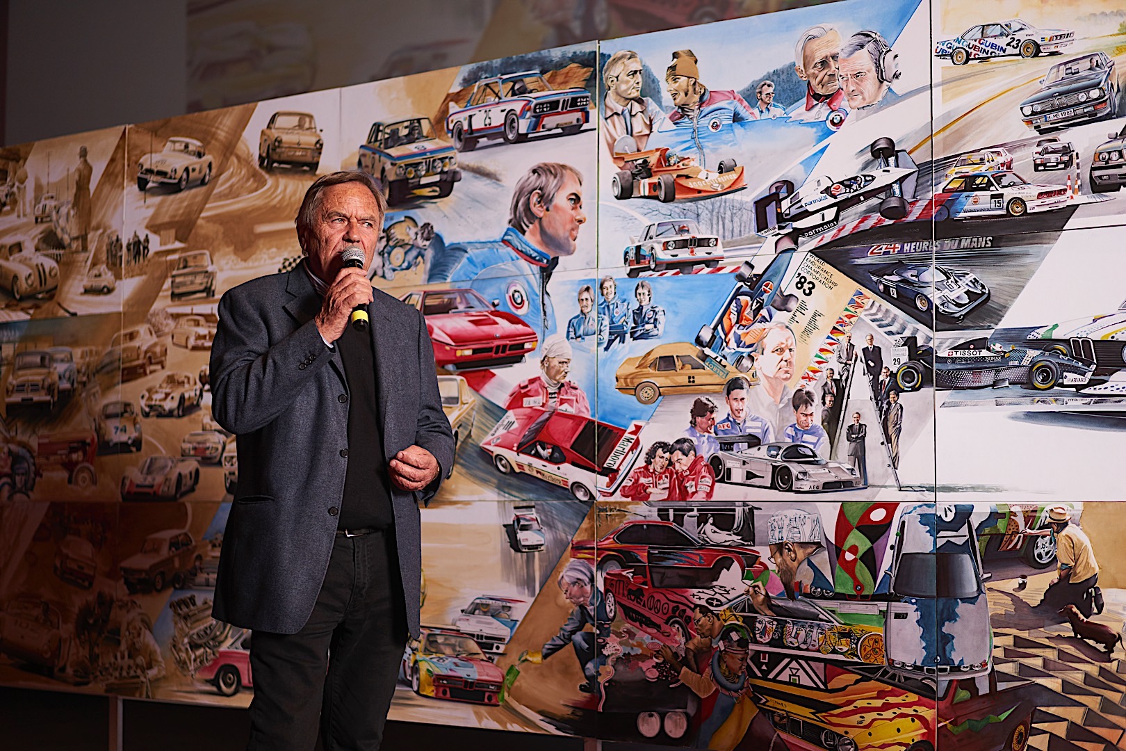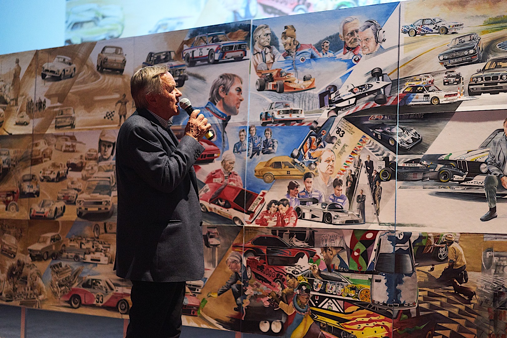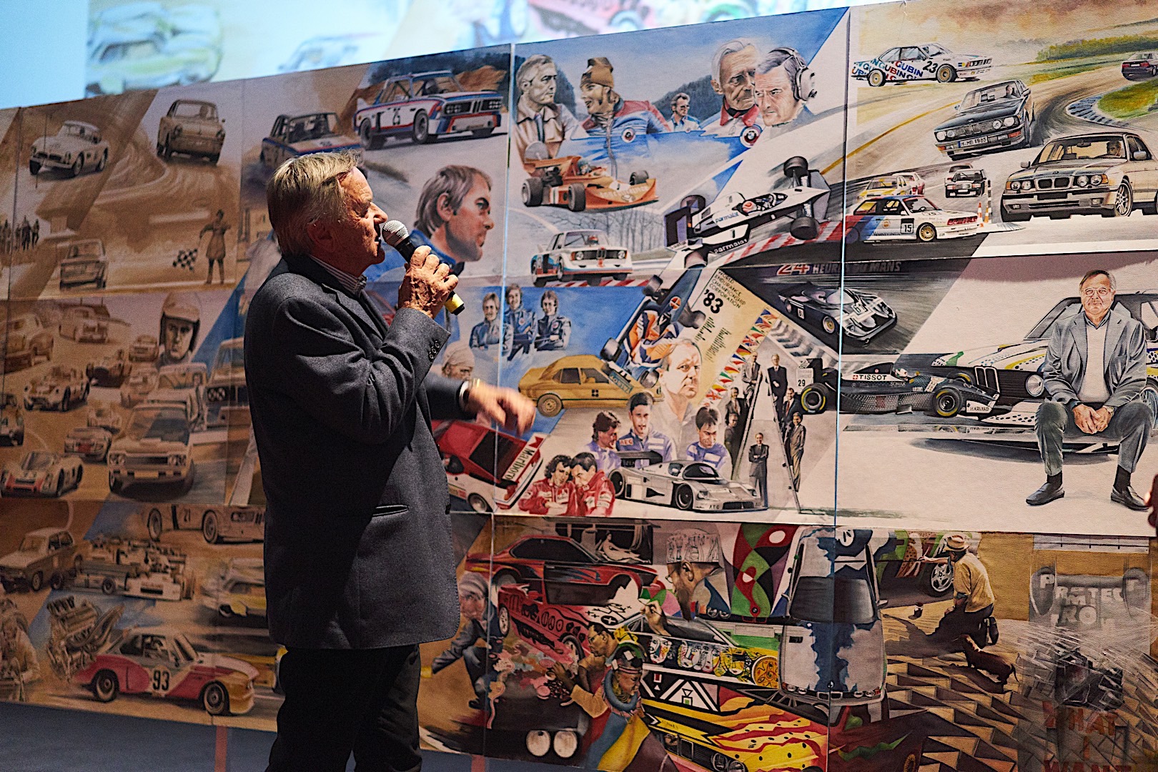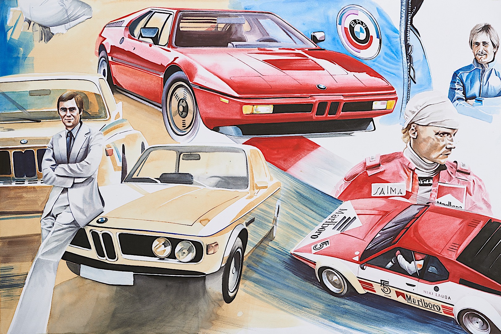 Standing tall at 1.8 meters by 4.5 meters in size, it covers the impressive CV Mr. Neerpasch put together during his lifetime. The work follows two stories that spread between the 1940s and 1990s – the evolution of the BMW brand in parallel to the automotive career of Jochen Neerpasch. They highlight important milestones for both the company and Neerpasch and his personal career, such as racecar driving, the implementation of BMW Motorsport as a standalone company in 1972, establishing the first major junior team in BMW’s racing history, facilitating unique competitions such as the BMW M1 Procar Championship as well as recognizing the potential of the interaction of art and motorsport by helping HervĂ© Poulain kick off the first BMW Art Car by Alexander Calder in 1975 which amounted into a collection that still continues today.