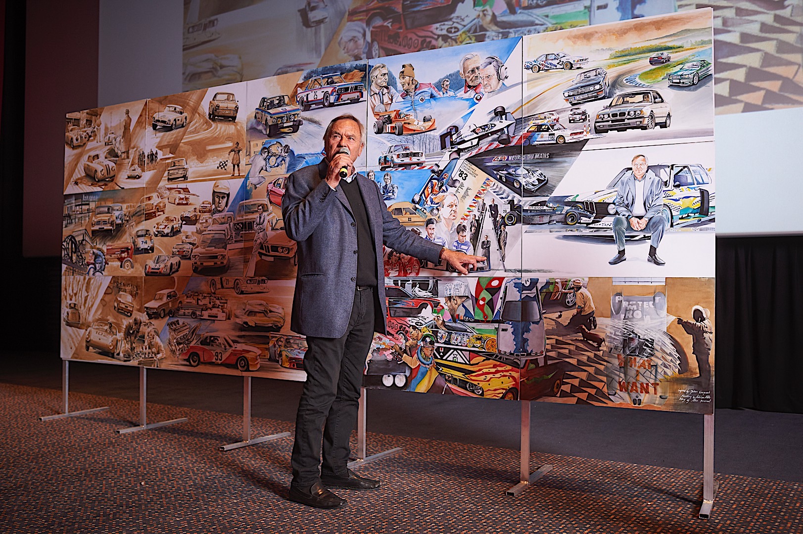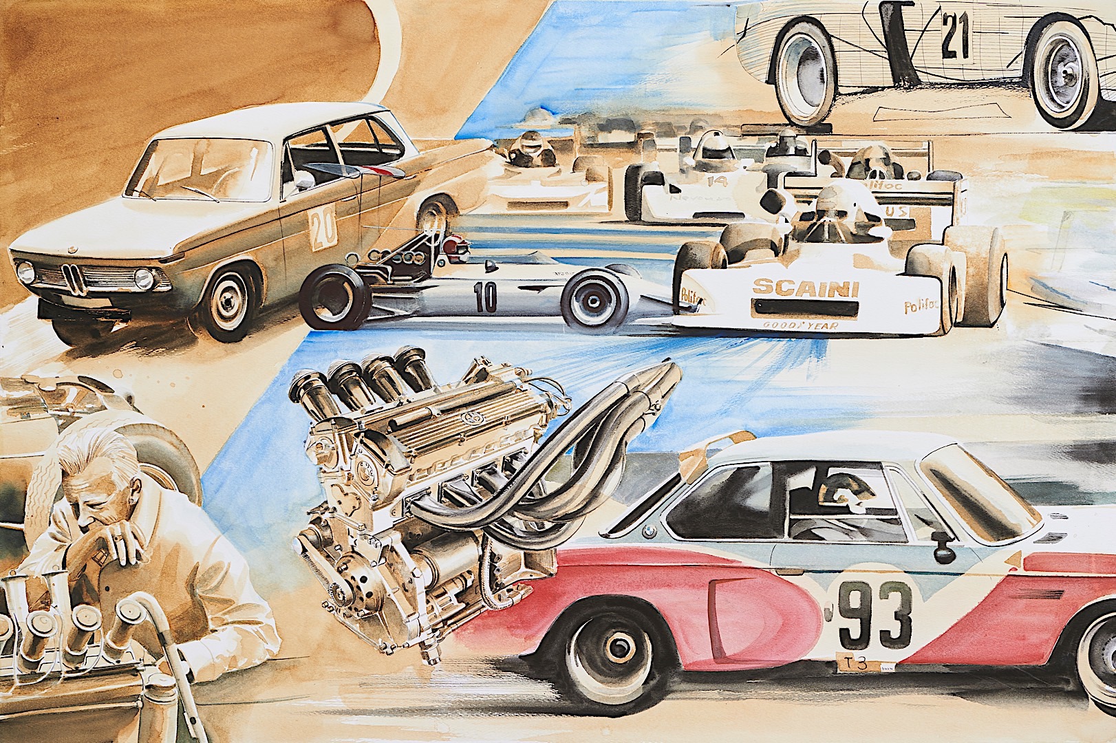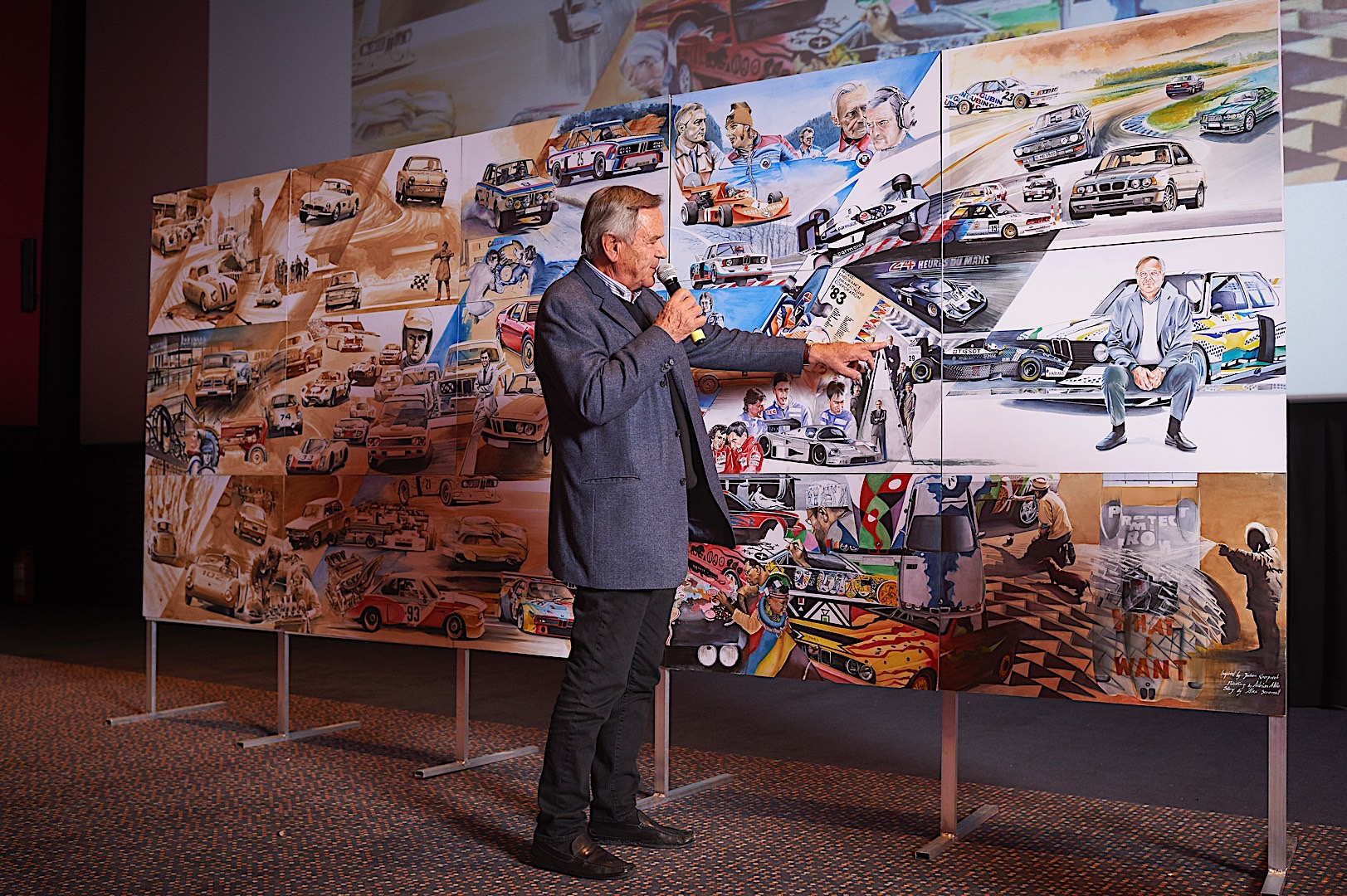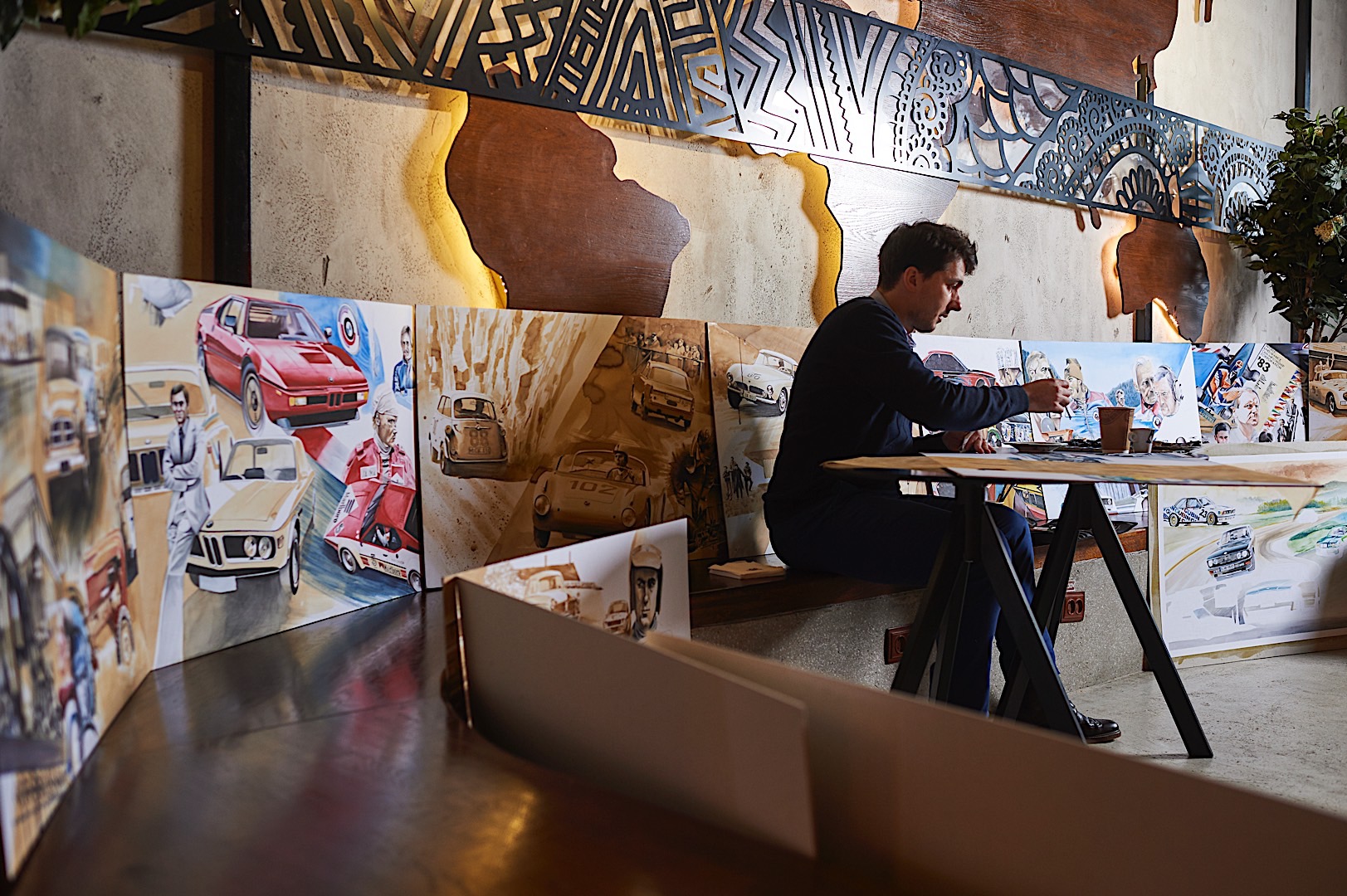 Standing tall at 1.8 meters by 4.5 meters in size, it covers the impressive CV Mr. Neerpasch put together during his lifetime. The work follows two stories that spread between the 1940s and 1990s – the evolution of the BMW brand in parallel to the automotive career of Jochen Neerpasch. They highlight important milestones for both the company and Neerpasch and his personal career, such as racecar driving, the implementation of BMW Motorsport as a standalone company in 1972, establishing the first major junior team in BMW’s racing history, facilitating unique competitions such as the BMW M1 Procar Championship as well as recognizing the potential of the interaction of art and motorsport by helping HervĂ© Poulain kick off the first BMW Art Car by Alexander Calder in 1975 which amounted into a collection that still continues today.