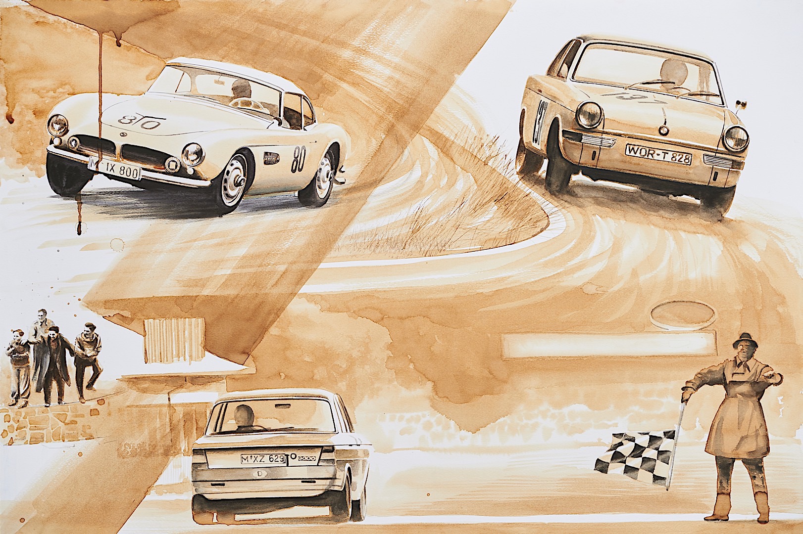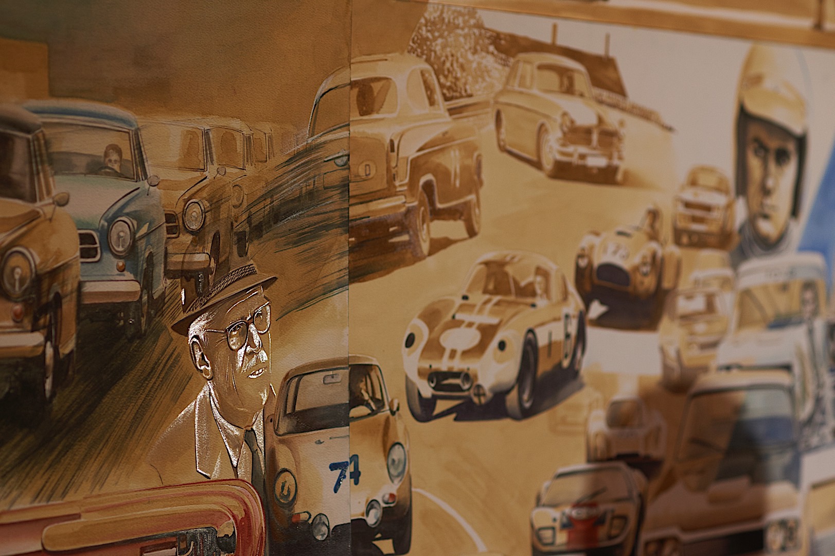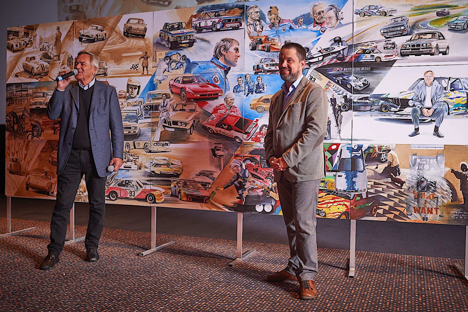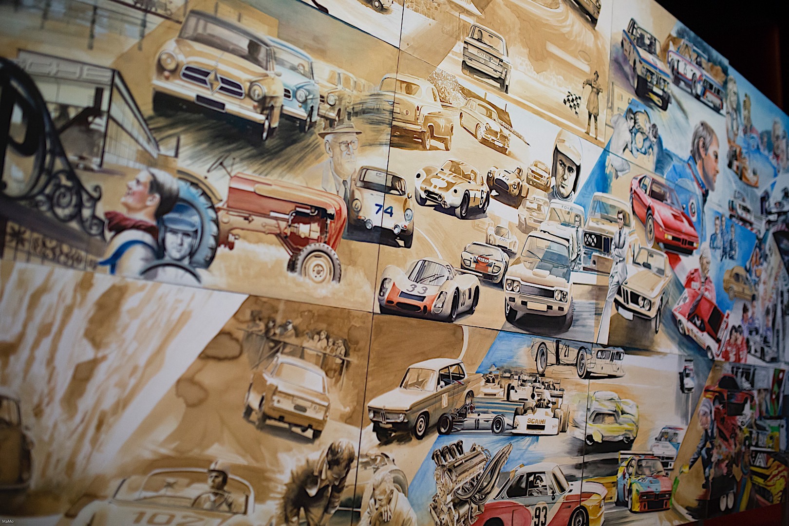 Standing tall at 1.8 meters by 4.5 meters in size, it covers the impressive CV Mr. Neerpasch put together during his lifetime. The work follows two stories that spread between the 1940s and 1990s – the evolution of the BMW brand in parallel to the automotive career of Jochen Neerpasch. They highlight important milestones for both the company and Neerpasch and his personal career, such as racecar driving, the implementation of BMW Motorsport as a standalone company in 1972, establishing the first major junior team in BMW’s racing history, facilitating unique competitions such as the BMW M1 Procar Championship as well as recognizing the potential of the interaction of art and motorsport by helping HervĂ© Poulain kick off the first BMW Art Car by Alexander Calder in 1975 which amounted into a collection that still continues today.