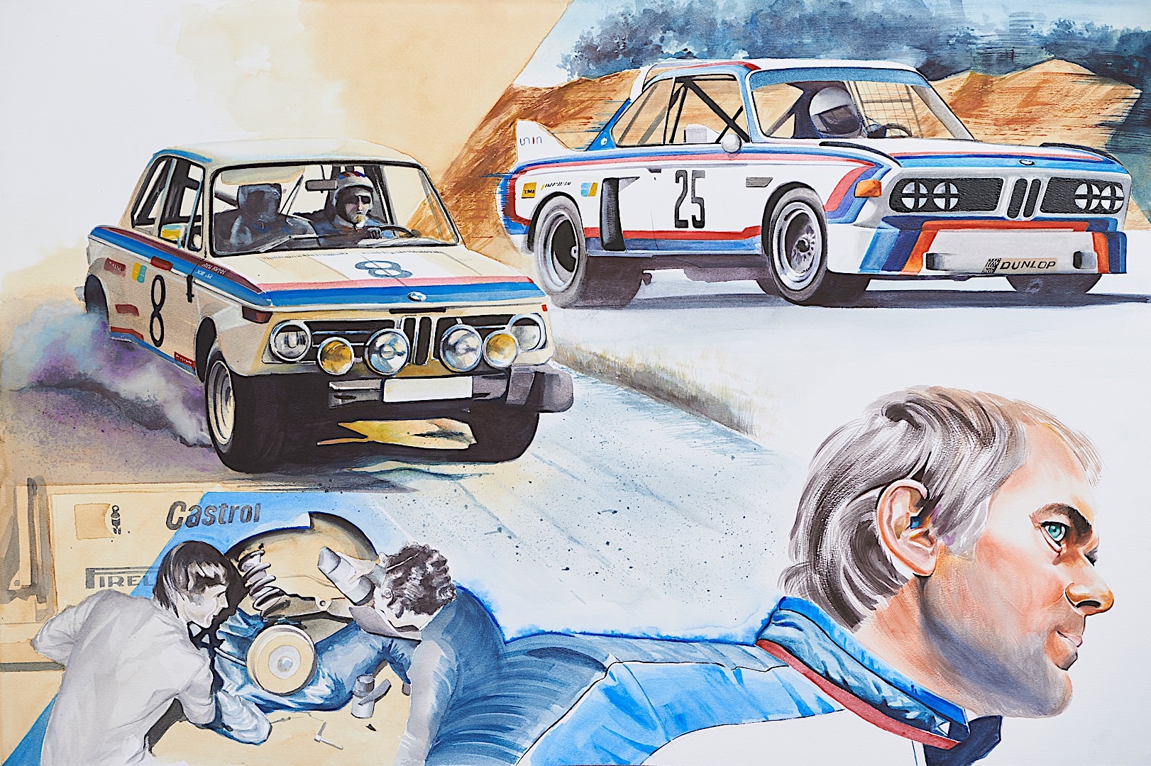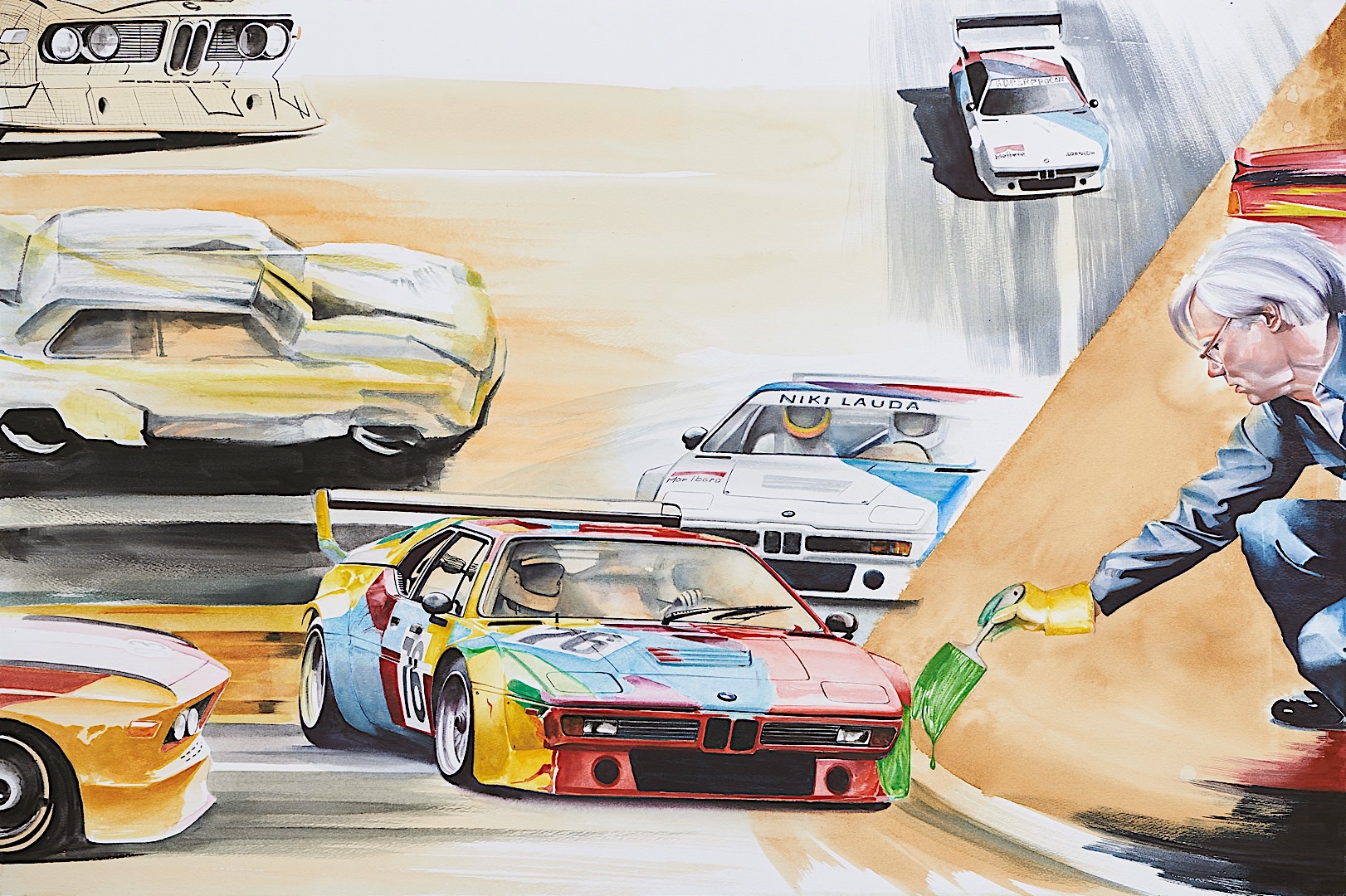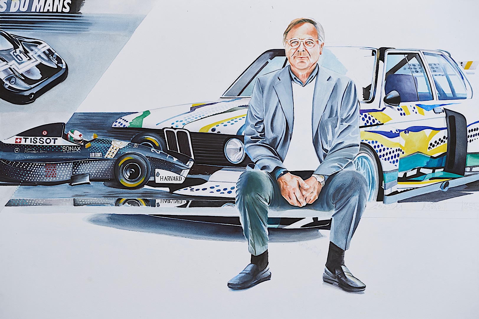 He was also the one that brought us the BMW Art Car program which saw artists like Andy Warhol and Alexander Calder sign off on racing cars wearing their designs and actually doing some racing on the track. It was a delight to see them both come to life and race on the world’s most well known tracks back in the day. As he talks about the project he also confesses that the Roy Lichtenstein art car was his favorite, which is why it as immortalized in the painting by Adrian Mitu. Looking at it you can also see how careful the artist was in making a true connection between each decade of Neerpasch’s life. If you pay attention you’ll notice that the Brabham F1 car blends into the Art Car designed by Roy Lichtenstein and this type of connection between one decade to another can be seen throughout the painting.