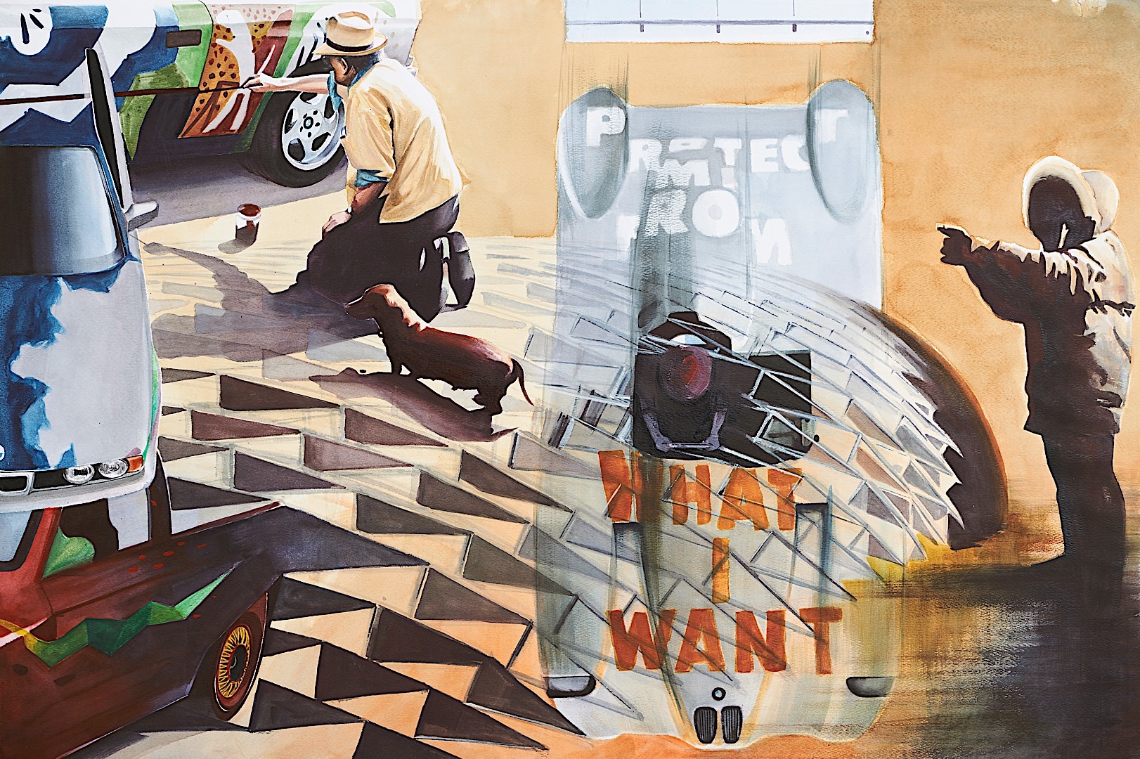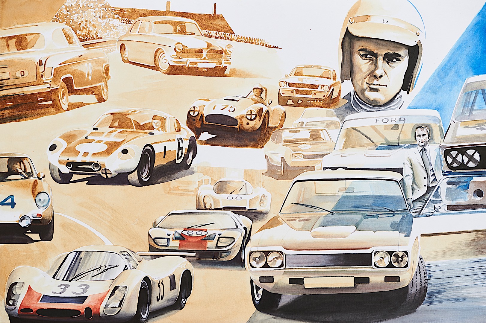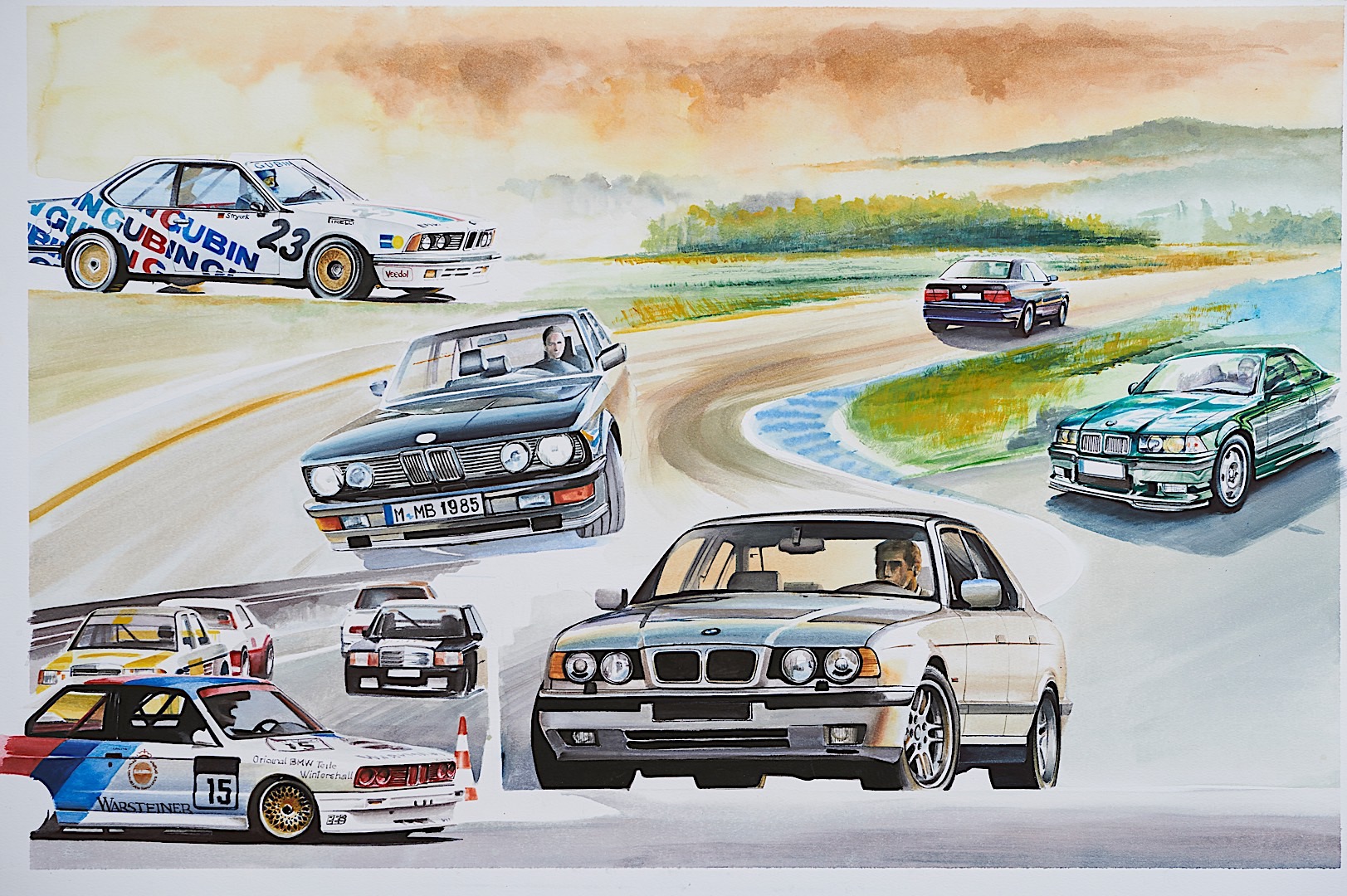He was also the one that brought us the BMW Art Car program which saw artists like Andy Warhol and Alexander Calder sign off on racing cars wearing their designs and actually doing some racing on the track. It was a delight to see them both come to life and race on the world’s most well known tracks back in the day. As he talks about the project he also confesses that the Roy Lichtenstein art car was his favorite, which is why it as immortalized in the painting by Adrian Mitu. Looking at it you can also see how careful the artist was in making a true connection between each decade of Neerpasch’s life. If you pay attention you’ll notice that the Brabham F1 car blends into the Art Car designed by Roy Lichtenstein and this type of connection between one decade to another can be seen throughout the painting.