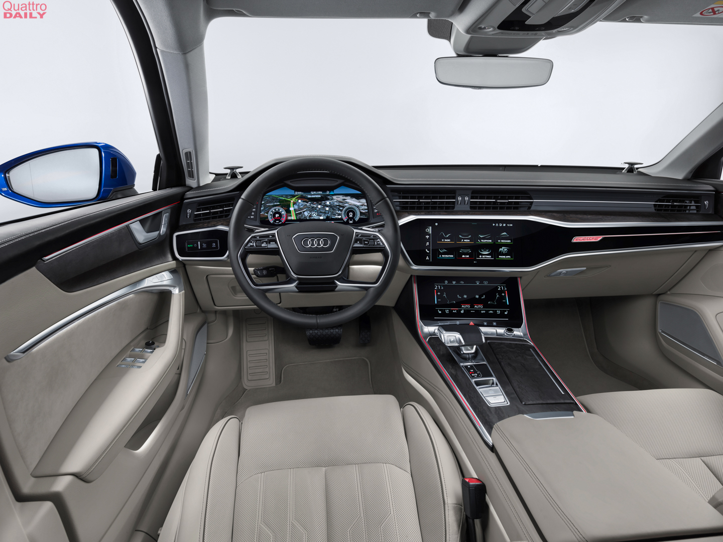 On the inside, it’s very typical of a modern Audi, so it’s very love-it-or-hate-it. It’s modern and simplistic yet very luxurious. We recently spent some time in the Audi A6 and it’s very, very nice on the inside. Build quality is superb, off the charts, really. I also really like the new touchscreen infotainment system, which works very well. Though, we only sampled it while sitting still on the NY Auto Show floor. We’ll have to actually test the car to determine how well it works on the move.