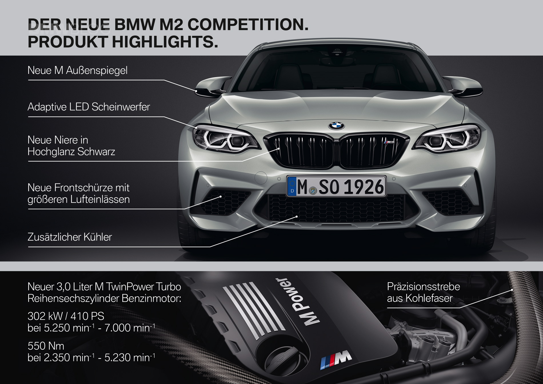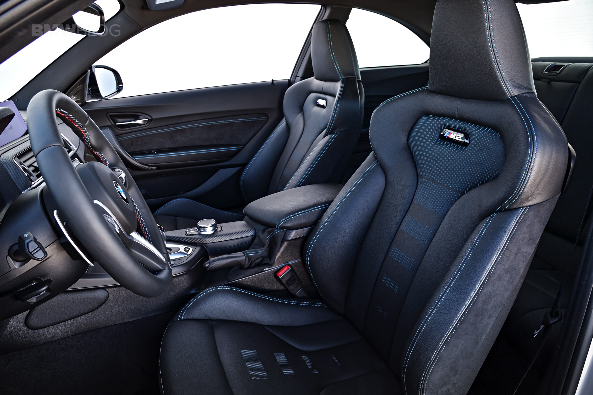 Under the hood lies a modified version of the same S55 engine that’s found in the BMW M3 and M4. So it’s a 3.0 liter twin-turbocharged inline-six engine that makes 410 hp and 406 lb-ft of torque. So it makes a bit less power than the standard M3 but the same amount of torque. We suspect the lower power figure is done so as to not infringe on the M3’s position in the M Division’s performance hierarchy. Though, its matching torque figure will make the M2 Competition an absolute weapon from stop-light to stop-light. Or it could just turn its rear tires to smoke. Time will tell.