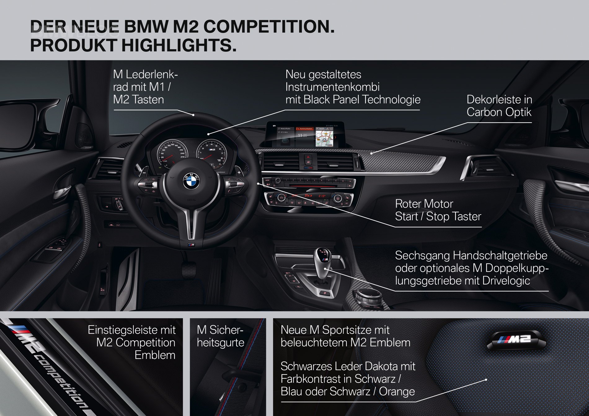 From the outside, the new BMW M2 Competition is certainly more aggressive than the standard car. It gets new Kidney Grilles, which are slightly larger and sharper-edged. These new grilles are not only more aggressive looking but they’re more functional, as they provide more airflow to help keep things nice and chilly. Those Kidney Grilles are also finished in Shadowline Gloss Black, as well are all the badges, much like the M4 Competition Package, making it seem more menacing. A new color is also available, Hockenheim Silver Metallic, along with Sunset Orange, which was previously available on other BMWs but new to the M2.