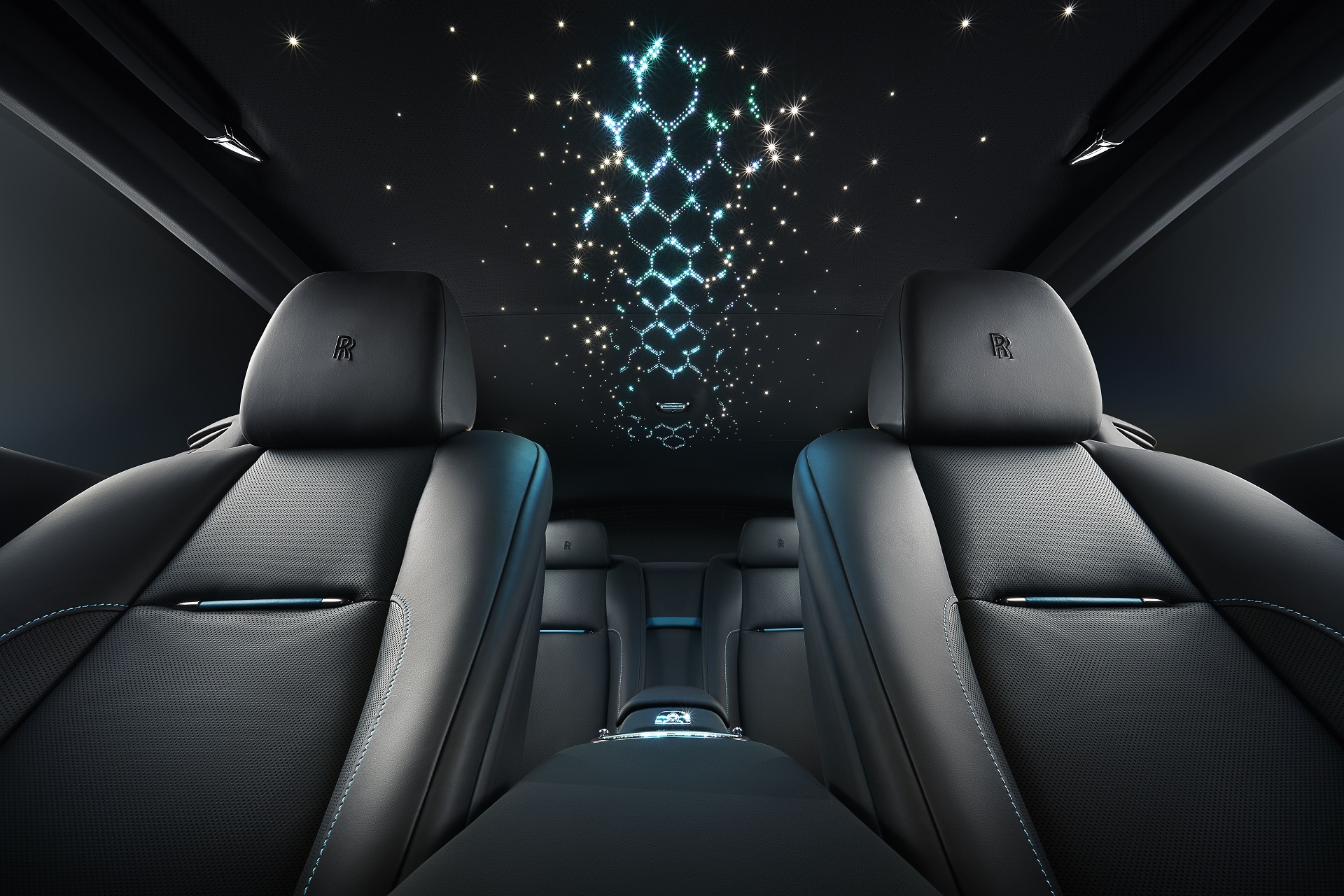 Perhaps one of the most captivating expressions of technical craft is the interpretation of the diamond theme on the starlight headliner of Wraith Adamas. 1,340 individual fiber optic lights are configured as though forming the molecular structure of carbon as it becomes a diamond, presenting a motif reminiscent of a powerful spine running through the interior cabin. Available in either hue, coordinating perfectly with either color scheme, the starlight headliner for the first time incorporates graded shading, using varying tones of the chosen color palette to accentuate the subject.