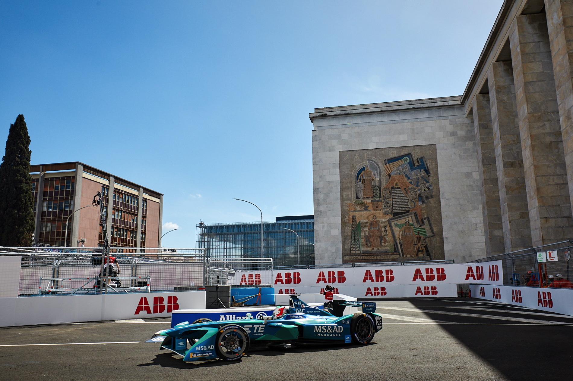 As soon as I arrive on the premises of the grandiose Piazzale Delle Nazioni Unite and its Roman architecture, one thing stands out immediately – the ePrix has gotten bigger, with more security around the circuit, more bridges to connect the different venues and interesting enough, a large number of journalists. At my first ePrix in Berlin, in 2016, the media room was setup outside in a closed-off tent, with tables and chairs likely sitting no more than 30 people, in contrast to the large room inside this Roman palace filled with hundreds of journalists and photo reporters genuinely interested in the the press conference and the drivers.