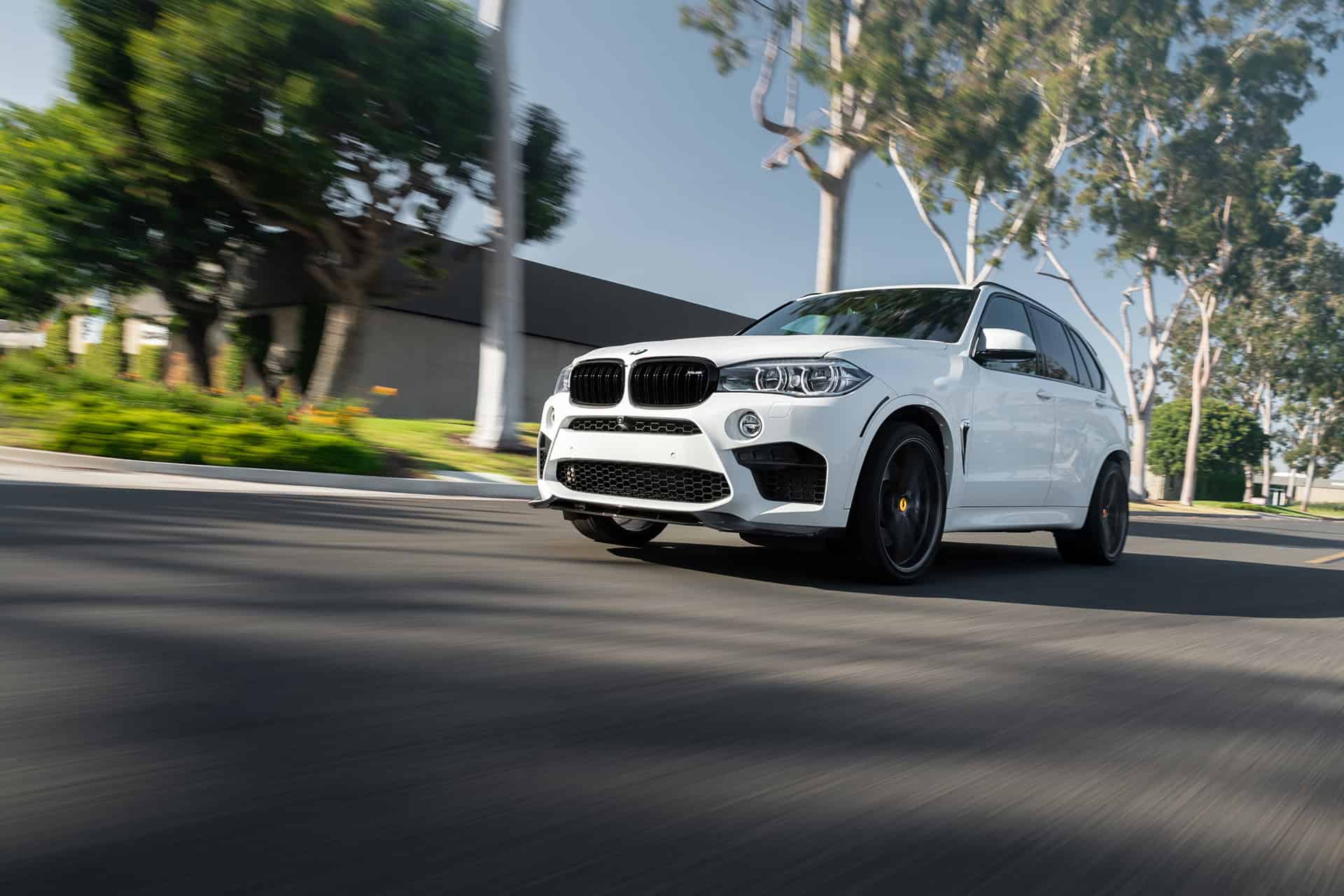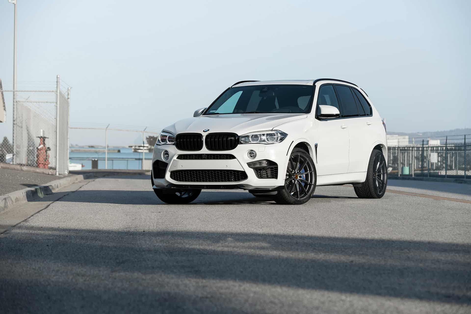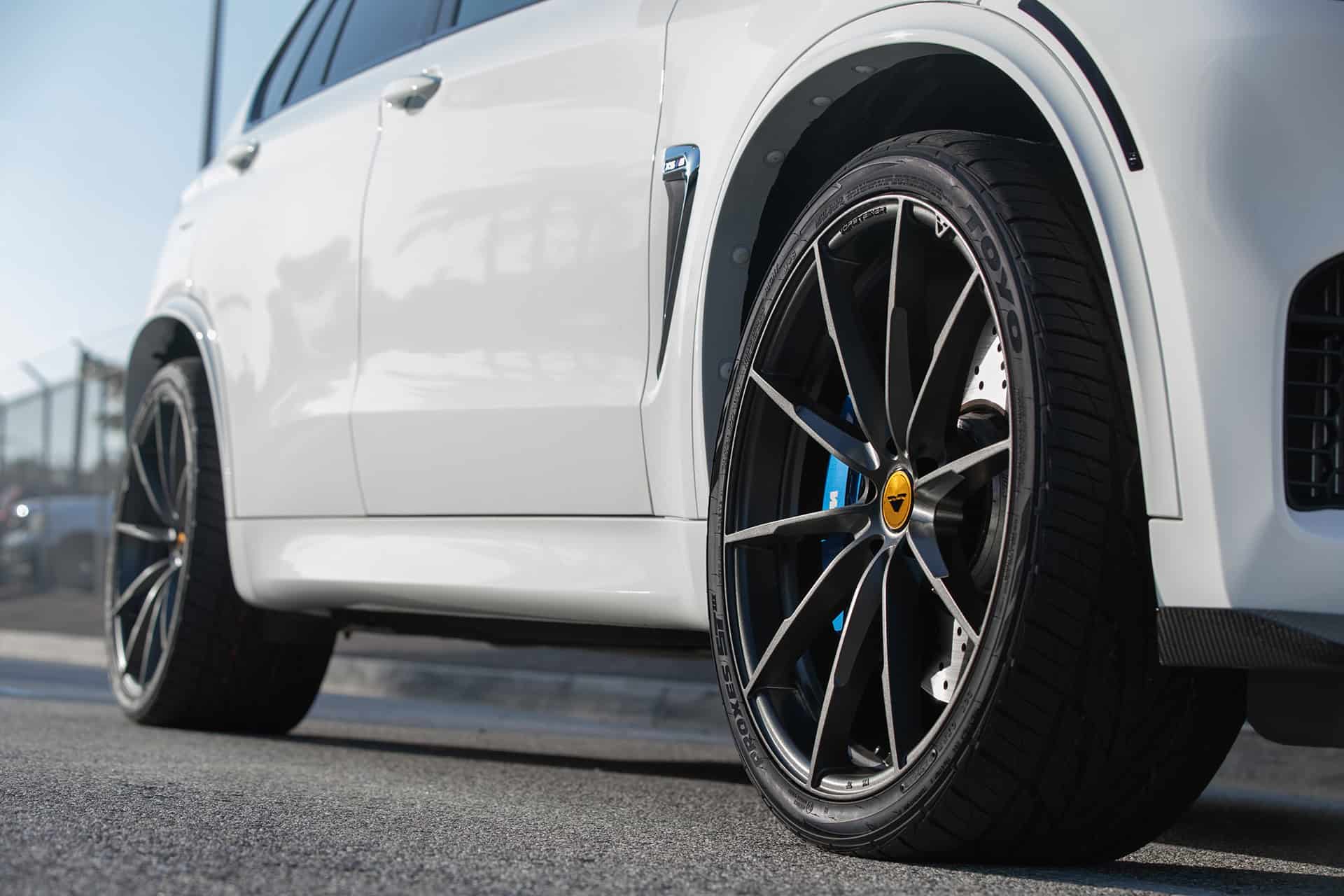 Additionally, this Alpine White BMW X5 M is equipped with a set of Vorsteiner V-FF109 flow forged wheels. These lightweight wheels are sized 22×10 and 22×11 in the front and rear, respectively. The wheels feature a Carbon Graphite finish, giving the entire wheel setup a nice contrasting touch against the Alpine White exterior of the vehicle itself. The wheels come with Toyo Proxes ST tires, sized 295/30/22 in the front and 335/30/22 in the rear.