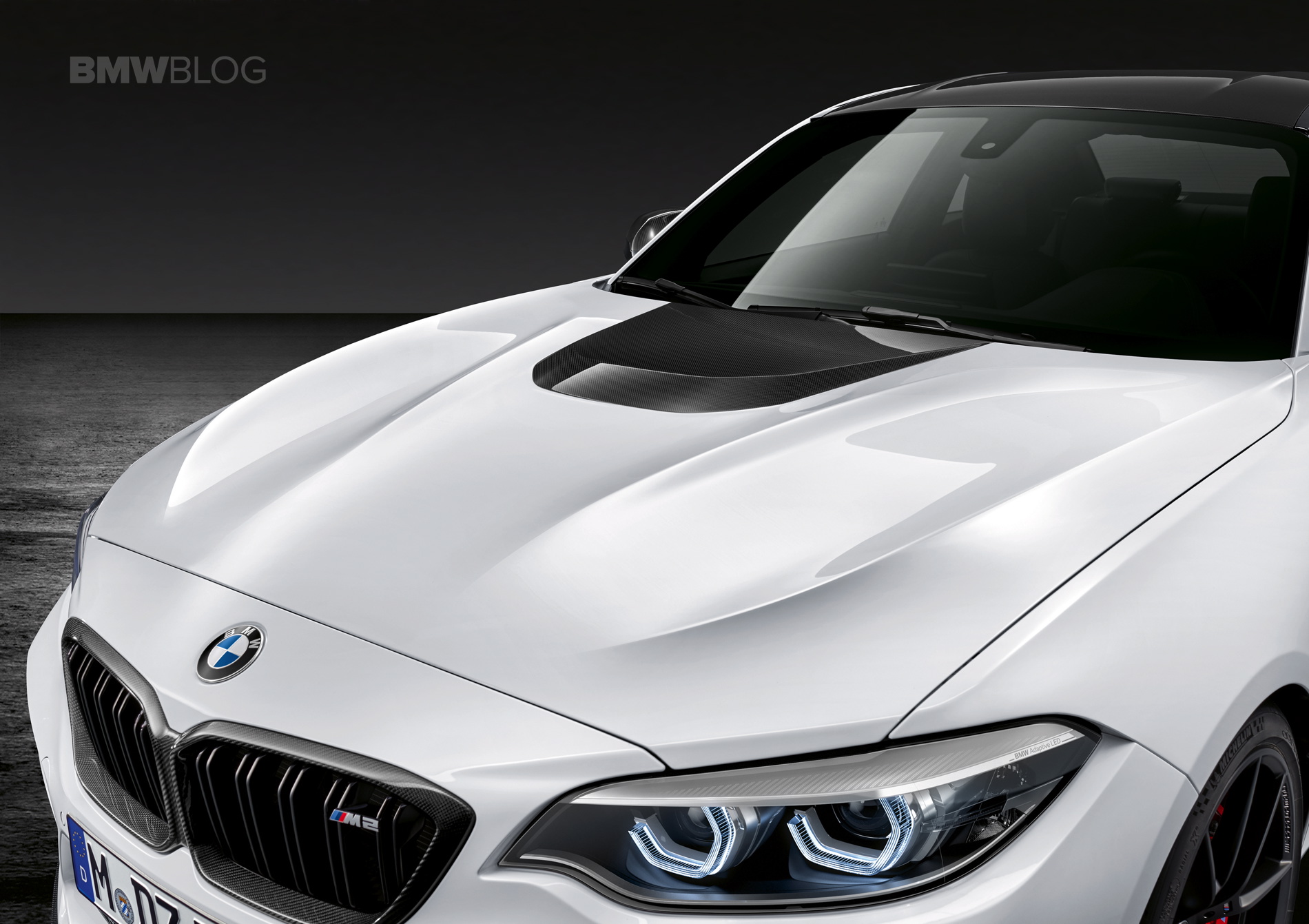 The newly developed M Performance bonnet is made of carbon fiber with partially visible varnished carbon fiber and for the first time the BMW M2 Competition boasts a powerdome.