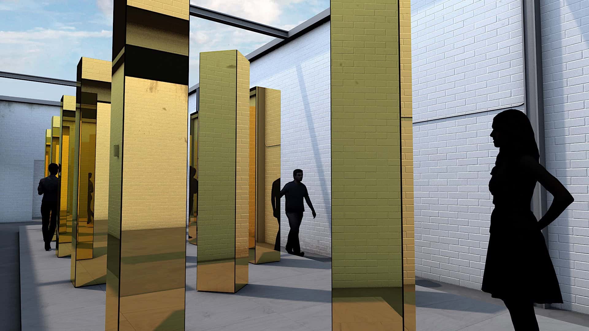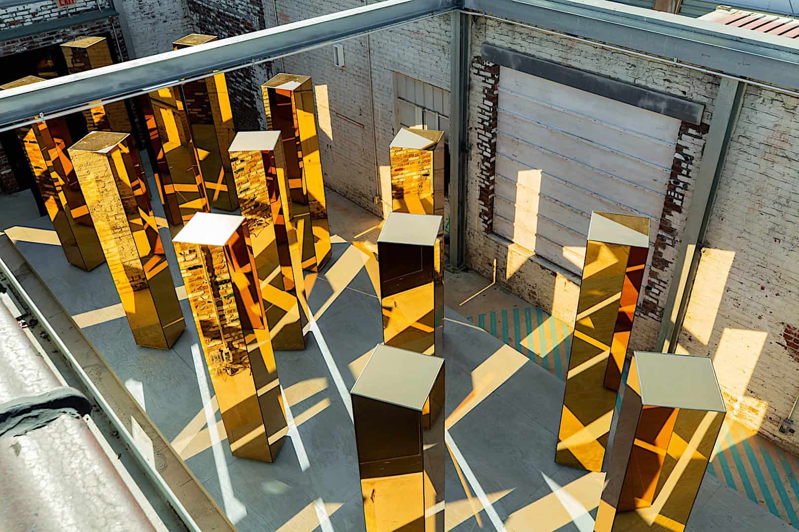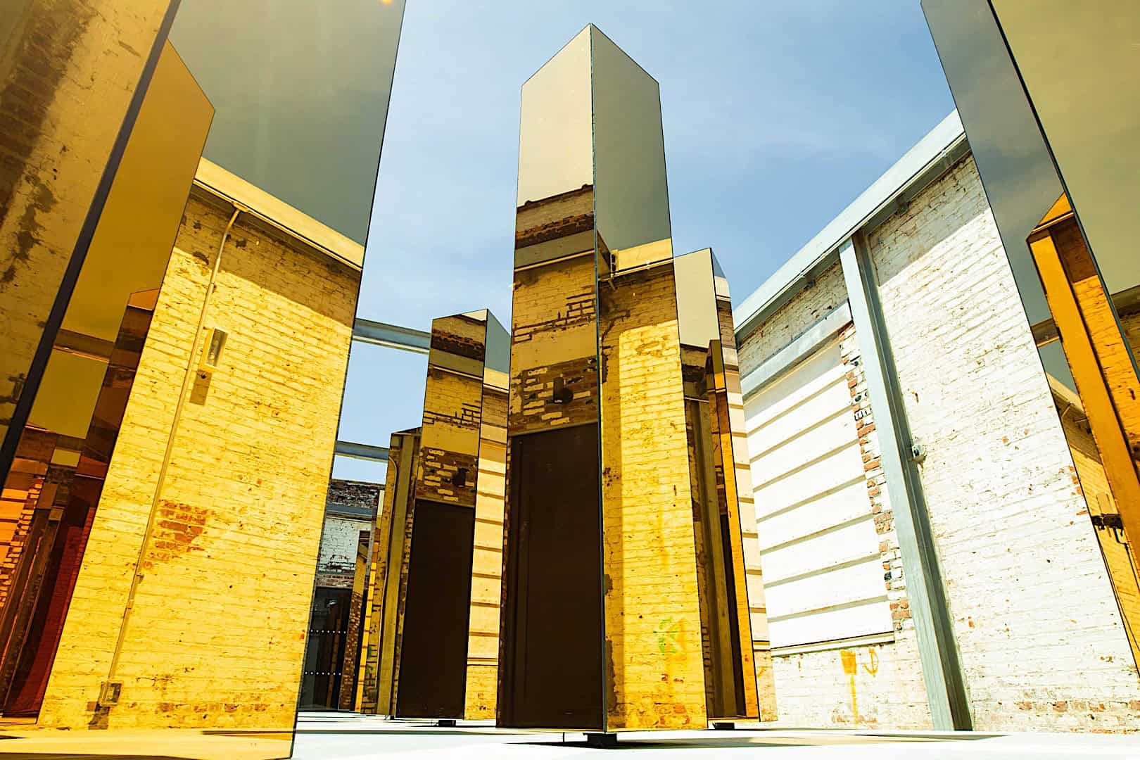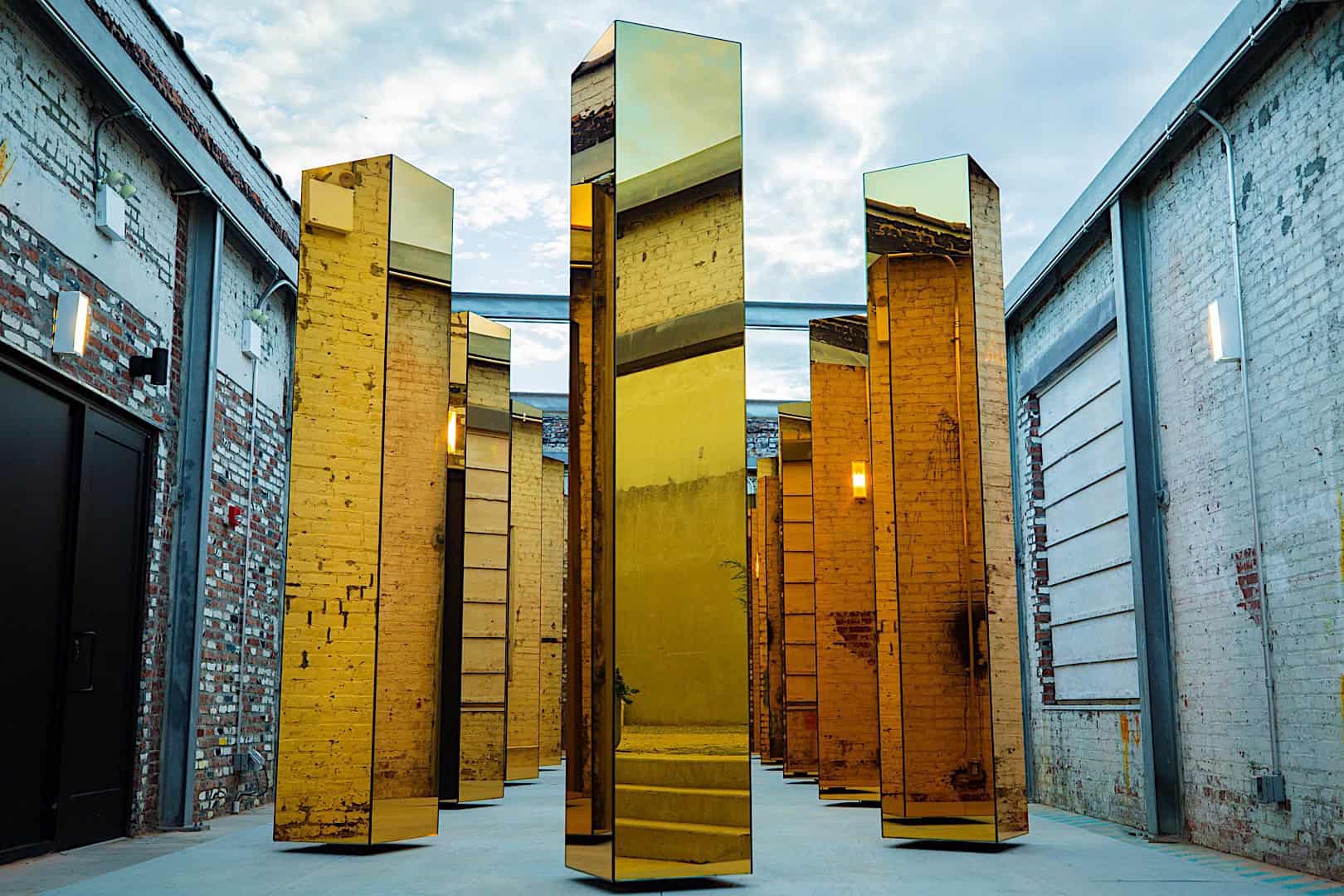 The modular system of revolving mirrored columns showcases a dynamic composition of movement, light, shadow and reflection. The seemingly organic behavior is poetically linked to the dynamic activity of New York City. Spirit of the City was created exclusively for the outdoor courtyard at A/D/O. It will open to the public May 18, 2018 and will be on view through September 2nd. Rising over the visitor, each nine-foot column is intended to challenge personal perception while eliciting a visceral and electrifying reaction similar to the thrill one might experience when exploring a new city.