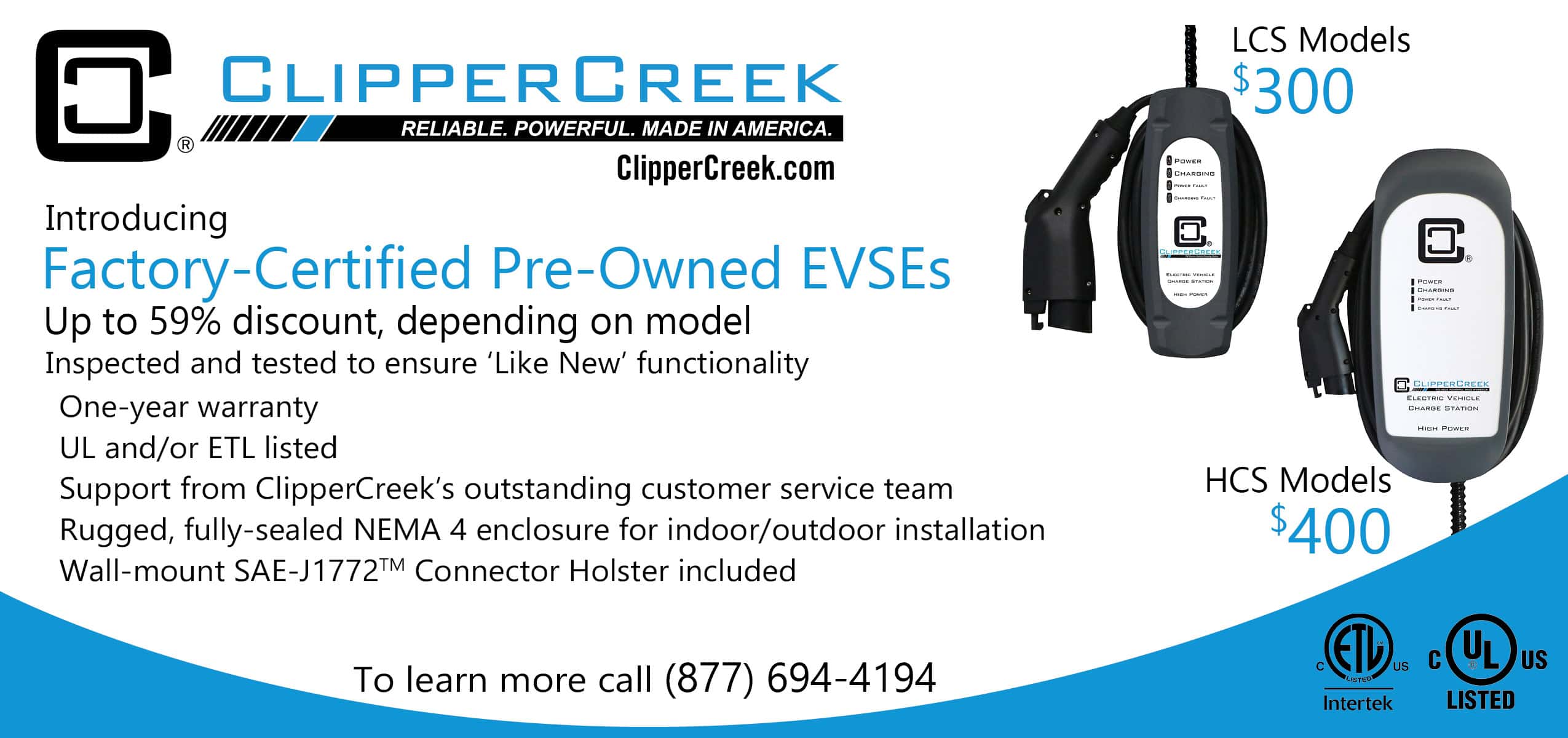 Like nearly everything else in the world, the pre-owned market for electric vehicles charging stations is trying to capture a new clientele. Our partner ClipperCreek has just announced the sale of factory-certified, pre-owned HCS and LCS series charging stations. The electric vehicle charging stations are factory tested and certified by ClipperCreek and come with a one-year warranty. Pricing starts at just $300. Pre-owned LCS charging stations are $300, a savings of up to 42% off the price of a new LCS. HCS models are available for $400, a savings of up to 59%.