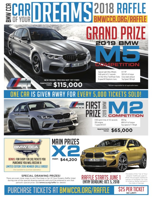 Ticket sales for the BMW CCA Car Of Your Dreams Raffle will end on Friday, October 5, at 5:00 p.m. EDT, and the winners will be drawn in late October at Taylor BMW in Augusta, Georgia. To learn more about the raffle—and to purchase tickets!—visit www.bmwcca.org/raffle