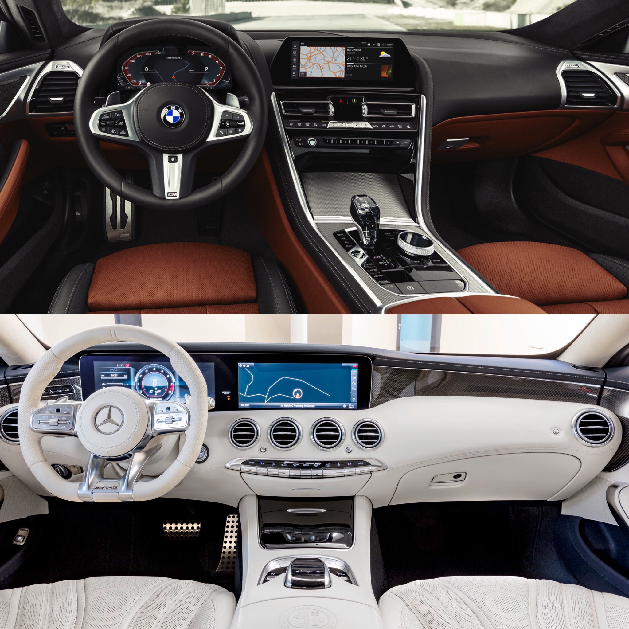 On the inside, it gets tough again. The BMW M850i, with its waterfall center stack, console-mounted gear lever and simplistic design, looks sportier and more thrilling. While the AMG S63, with its column-mounted shift lever, merged screens and circular air vents, looks a bit classier and more luxurious. In terms of sheer presence, the AMG wins it but in terms of which makes me wanna get in and drive, the BMW wins. So it’s tough to call. Though, I’m going to go with BMW here again, for a couple of reasons. The first is that the dual merged screens on the AMG looks a bit cheap, as if Mercedes just glued a massive tablet to the dash, and column-mounted shift levers belong in old Buicks, not fire-breathing AMG products.