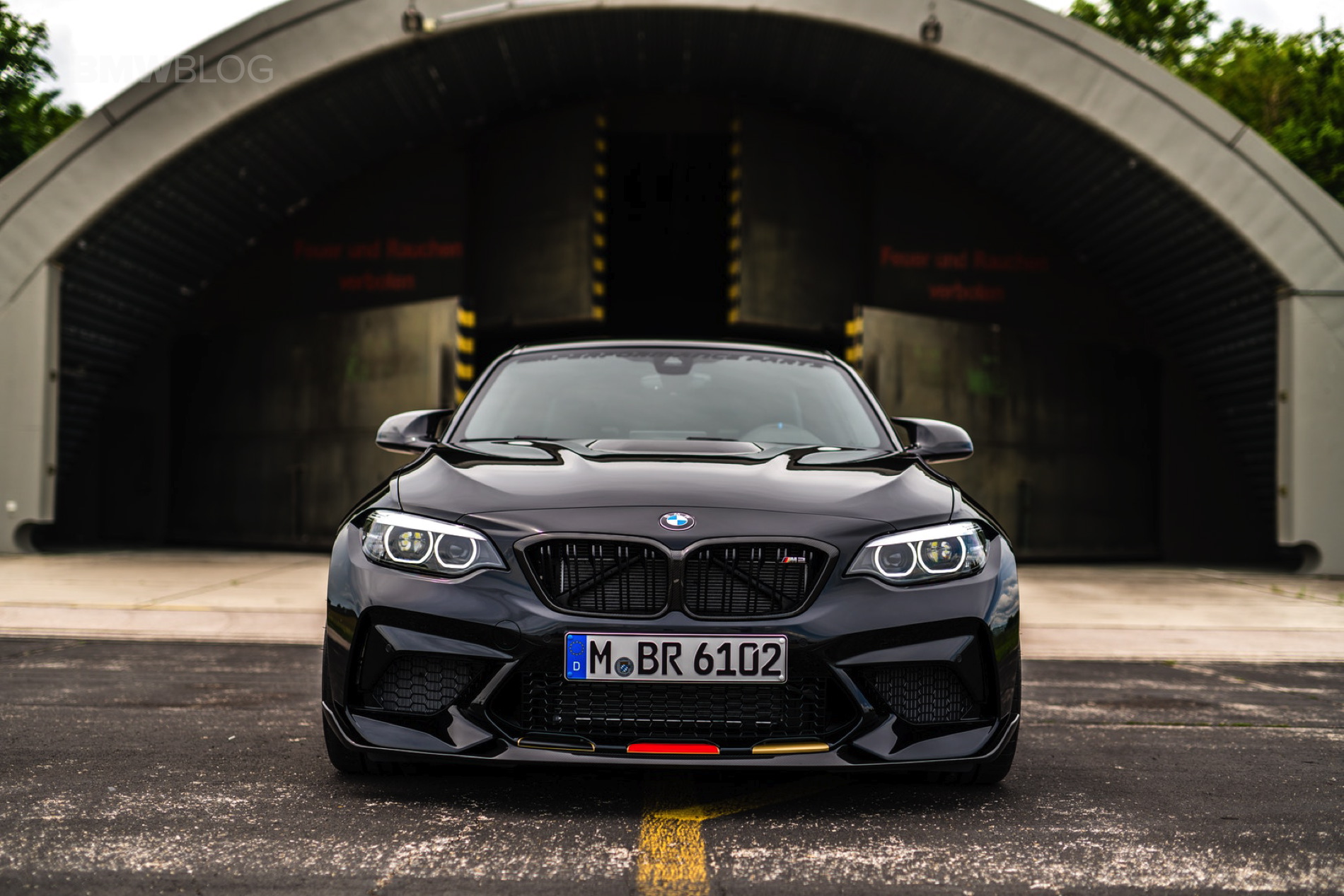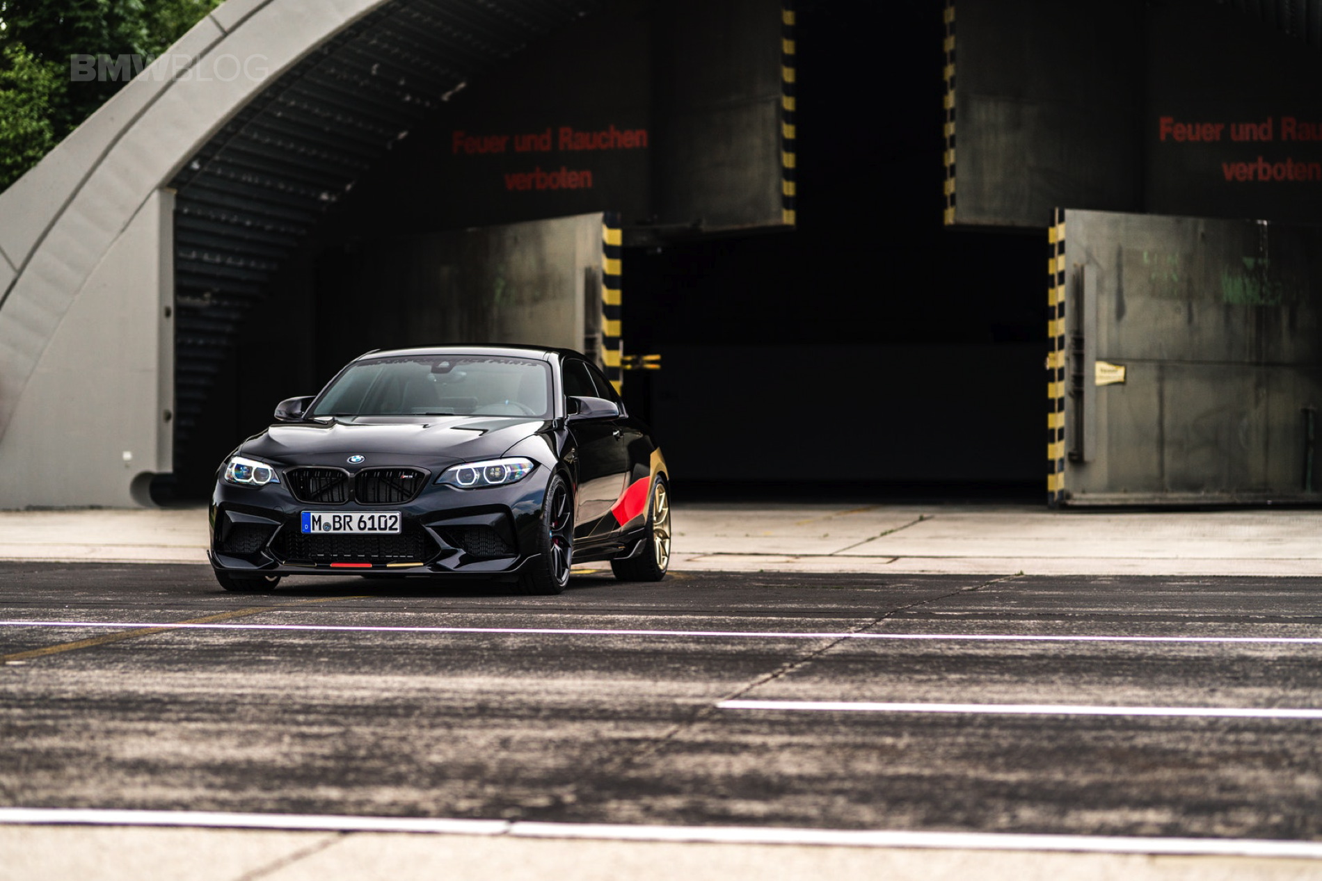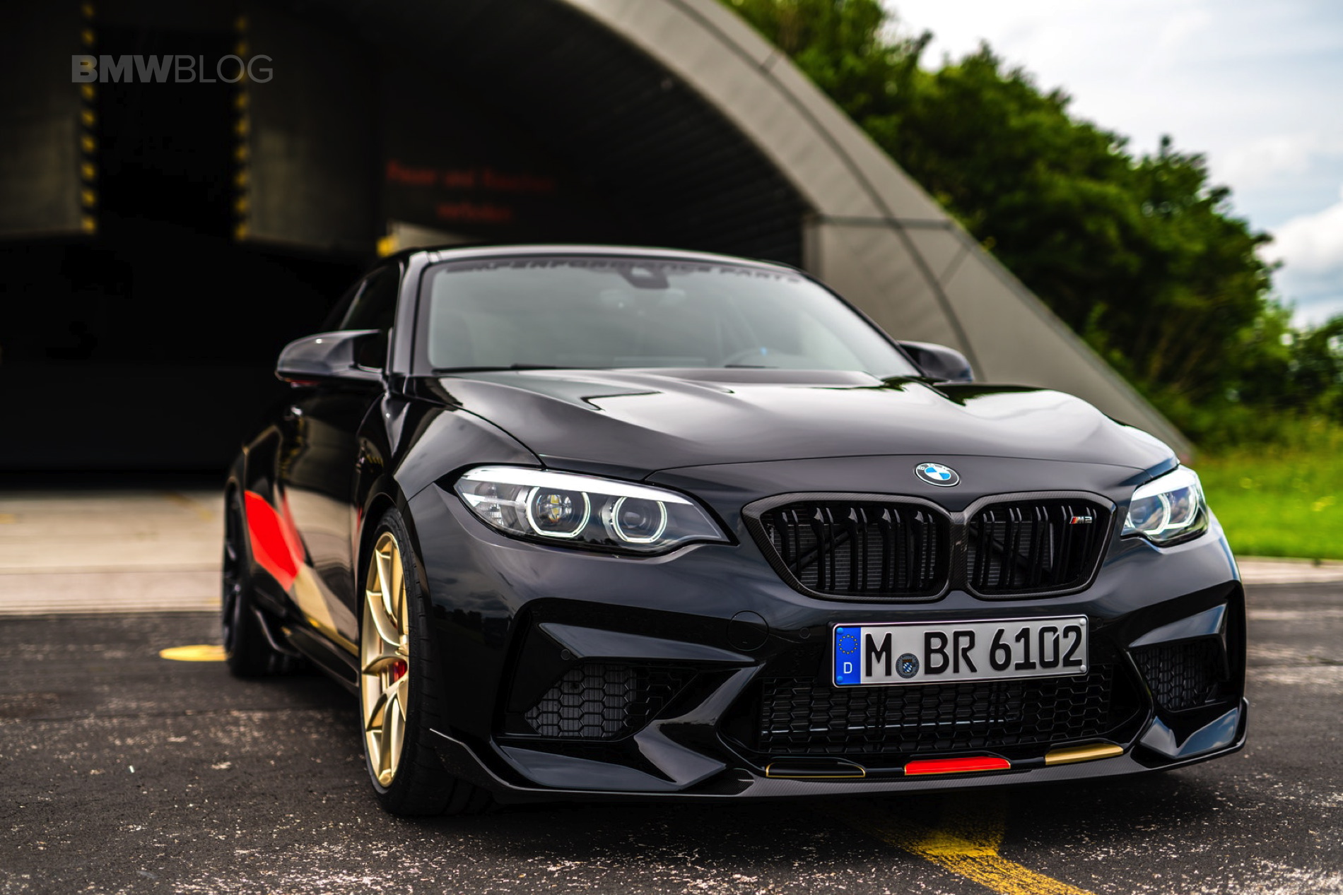 In addition to the German decals, the BMW M2 Competition  also carries a few other tuning components from the BMW M Performance range. Among other things, the bonnet, rear wing and rear diffuser made of carbon were installed, but even more attention should be paid to the wheel combination: The 19-inch Y-spoke 763 M light-alloy wheels are on the front axle in Jet Black while the rear axle features the same wheels in Frozen Gold. Both variants can be ordered regularly at BMW M Performance, and the golden rims have been available for a few months now.