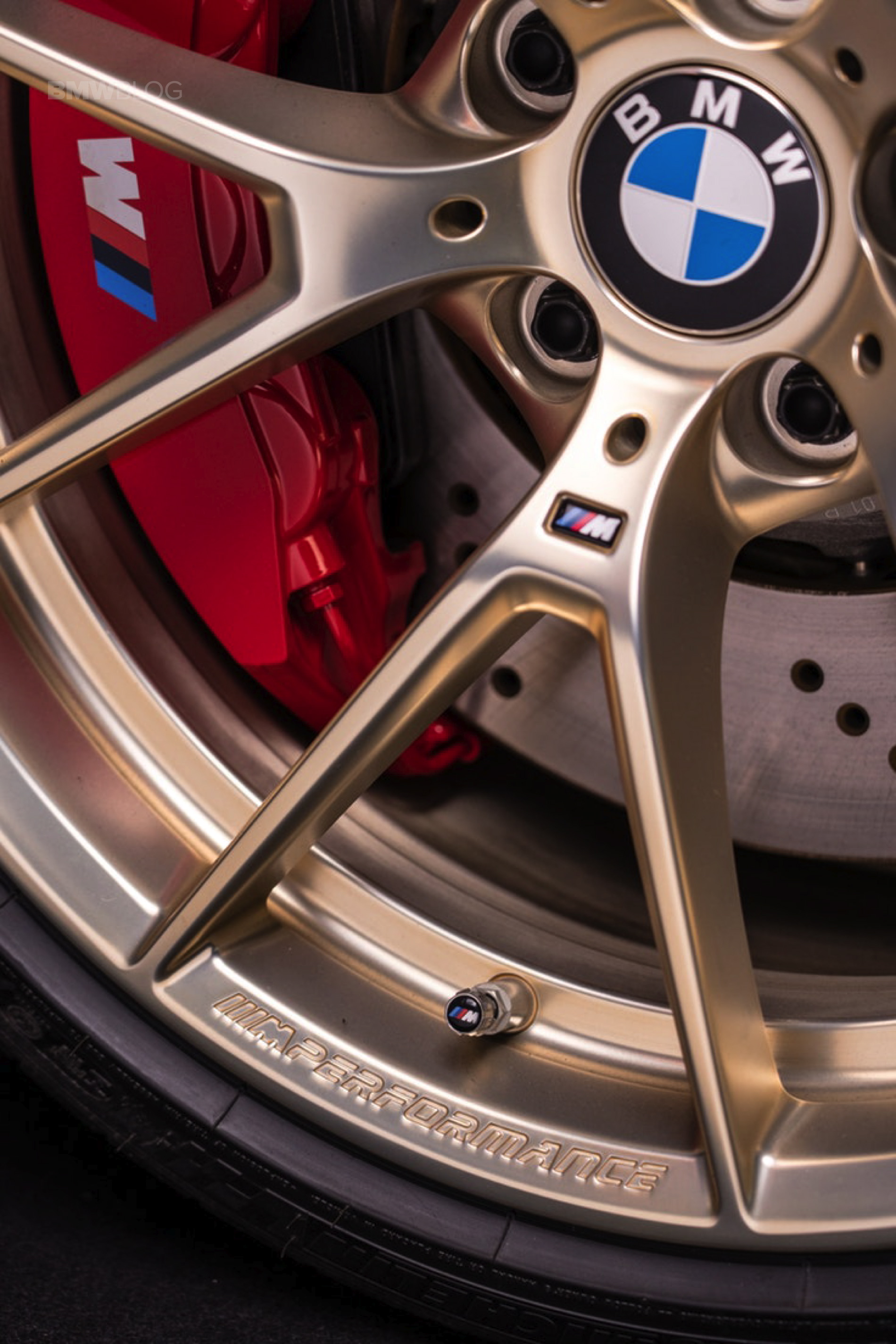 Behind the eye-catching wheels, the M sports brake system is clearly recognizable by its red brake calipers and fits perfectly with the black-red-gold look of the show car. Compared to the standard brakes, the perforated and ventilated compound brake discs are even larger. They are clamped on the front axle by 6-piston calipers and at the rear by 4-piston calipers.