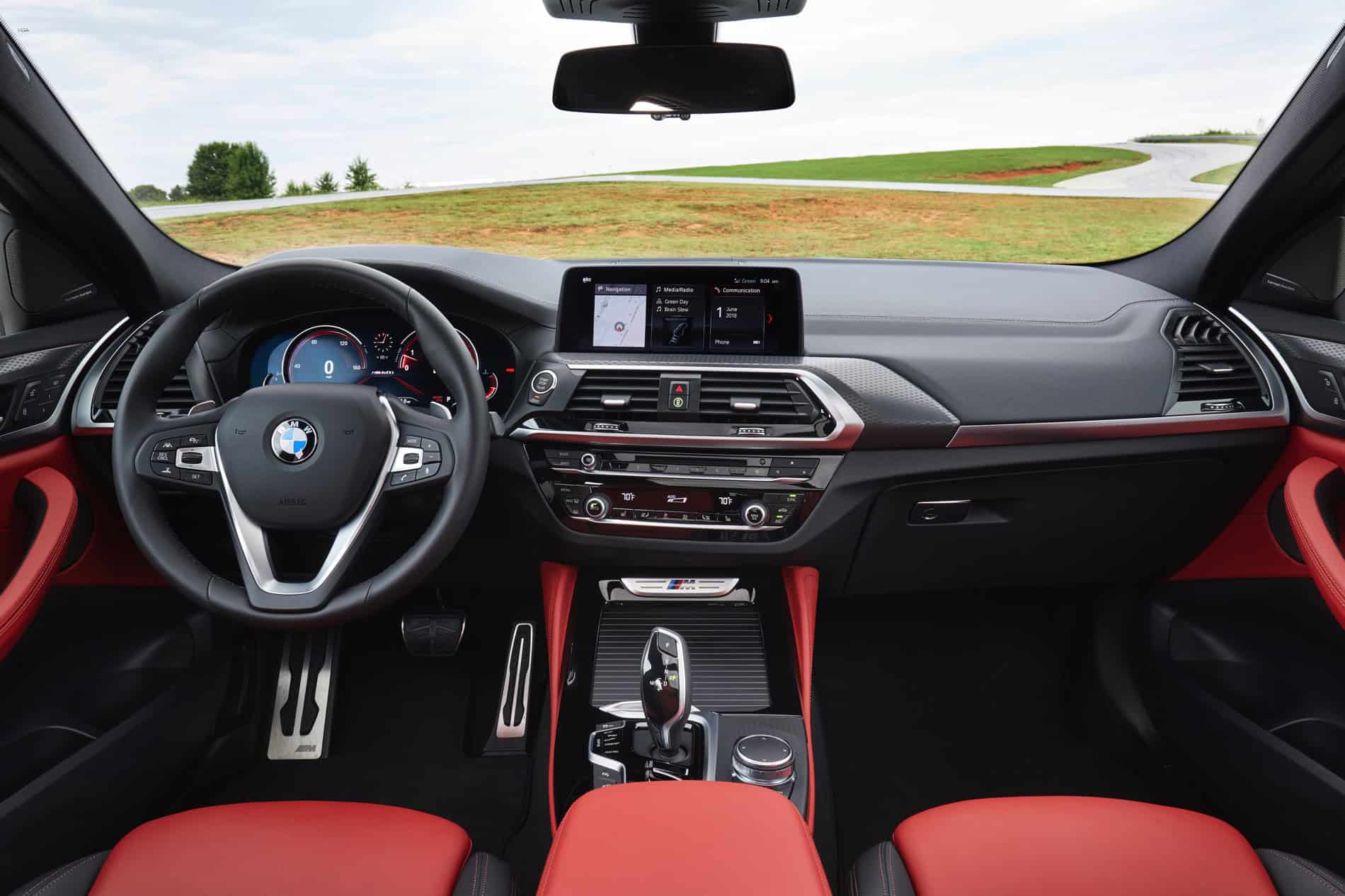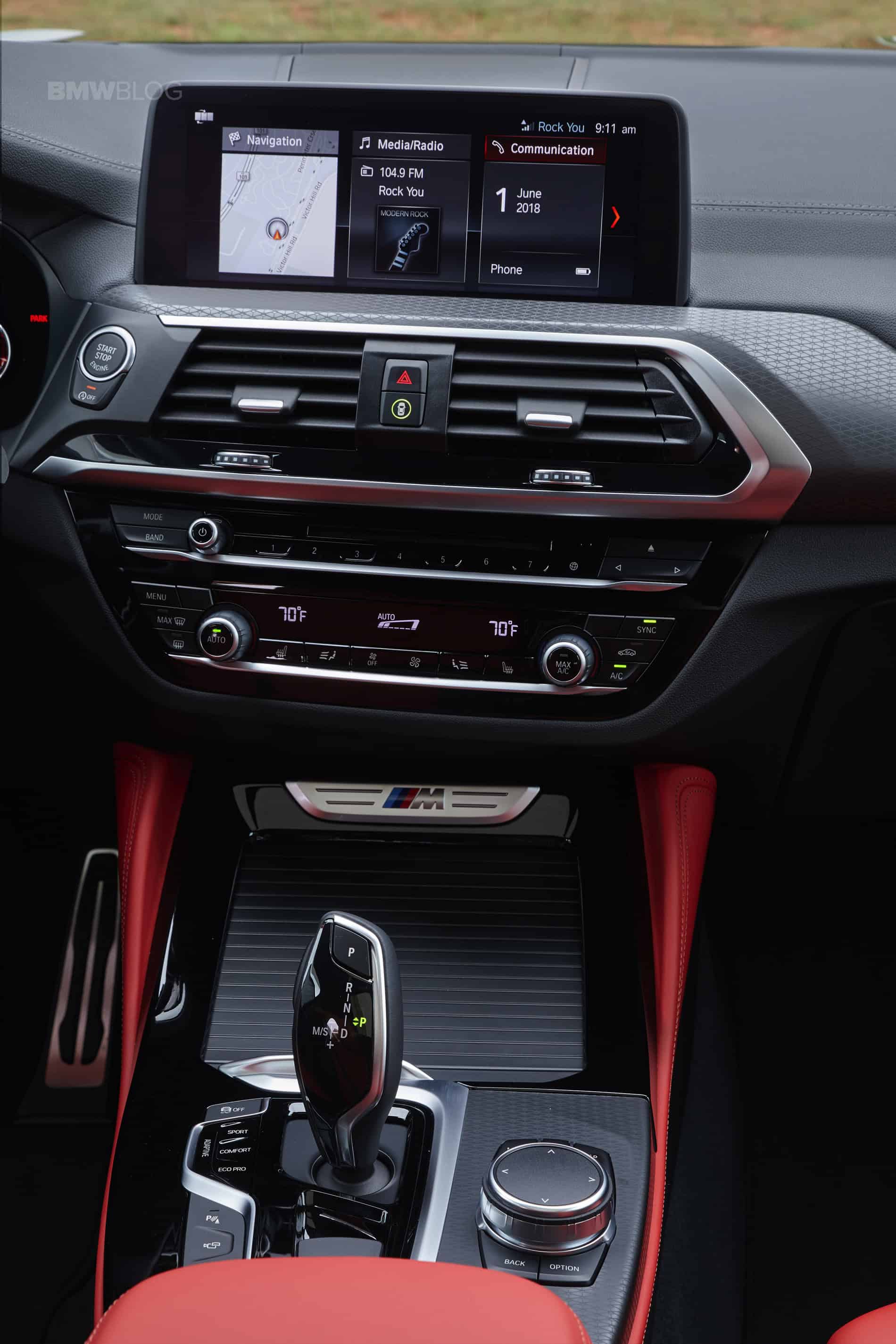 Inside is where the first X4 shows its age, and while the new generation G02 X4 follows on the steps of its X3 brother, the quality of finishes and materials inside the cabin is what stands out immediately. It’s also better looking, and it can be had with BMW’s Individual treatment. The sport seats are standard on the X4 M40i and there is also a new optional Vernasca leather. There’s also a new color option, Tacora Red, as well as black leather available with either blue or red contrast stitching. Unfortunately the car we drove lacked the Sports Steering wheel which according to BMW is stuck in the regulators’ purgatory and will arrive in the future.
