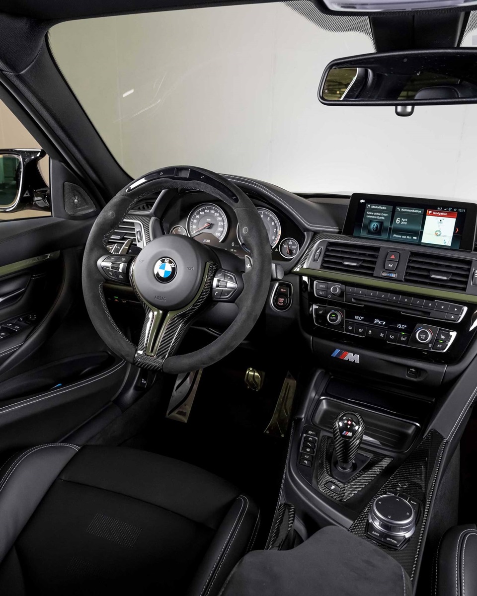 Under the hood hides the same 3-liter straight six S55 engine we’ve grown used to but in Competition Package guise which means it develops 444 HP and 550 Nm (406 lb-ft) of torque. It will take the car to 100 km/h (62 mph) in 4 seconds flat if equipped with the 7-speed DCT which this car has. A look inside will prove it while also showing you the vast amounts of carbon fiber decking the cabin and the M Performance steering wheel.