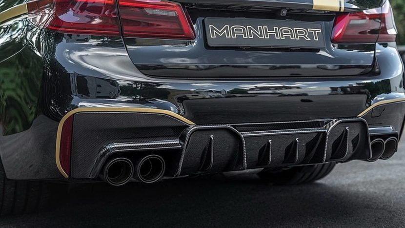 Compared to the standard diffuser of the F90, the new MANHART full carbon diffuser is an absolute statement. Clearly aiming towards the American and Middle Eastern market the MANHART diffuser is quite flamboyant for a german product. By its exaggerated fins and the fact that it is one big carbon panel, going over the cars full width, it turns the F90’s calm rear end into a real eye catcher.