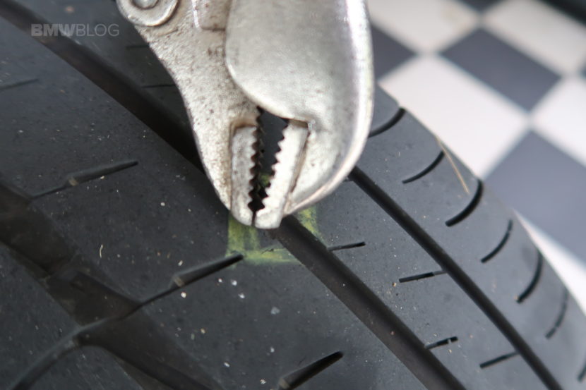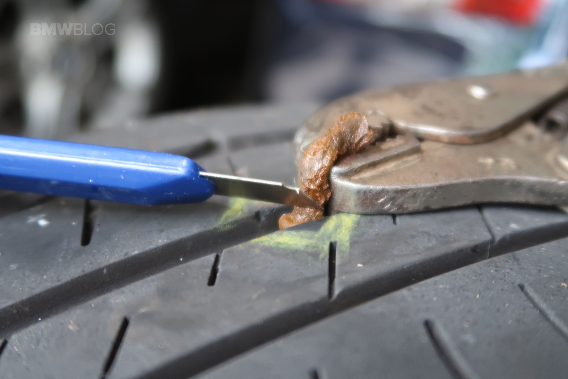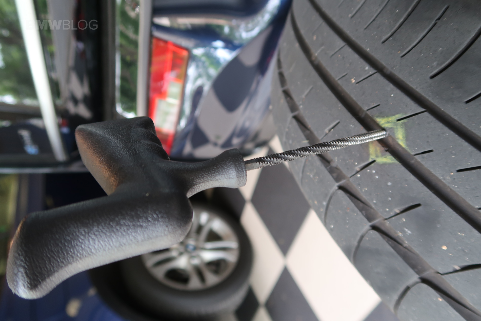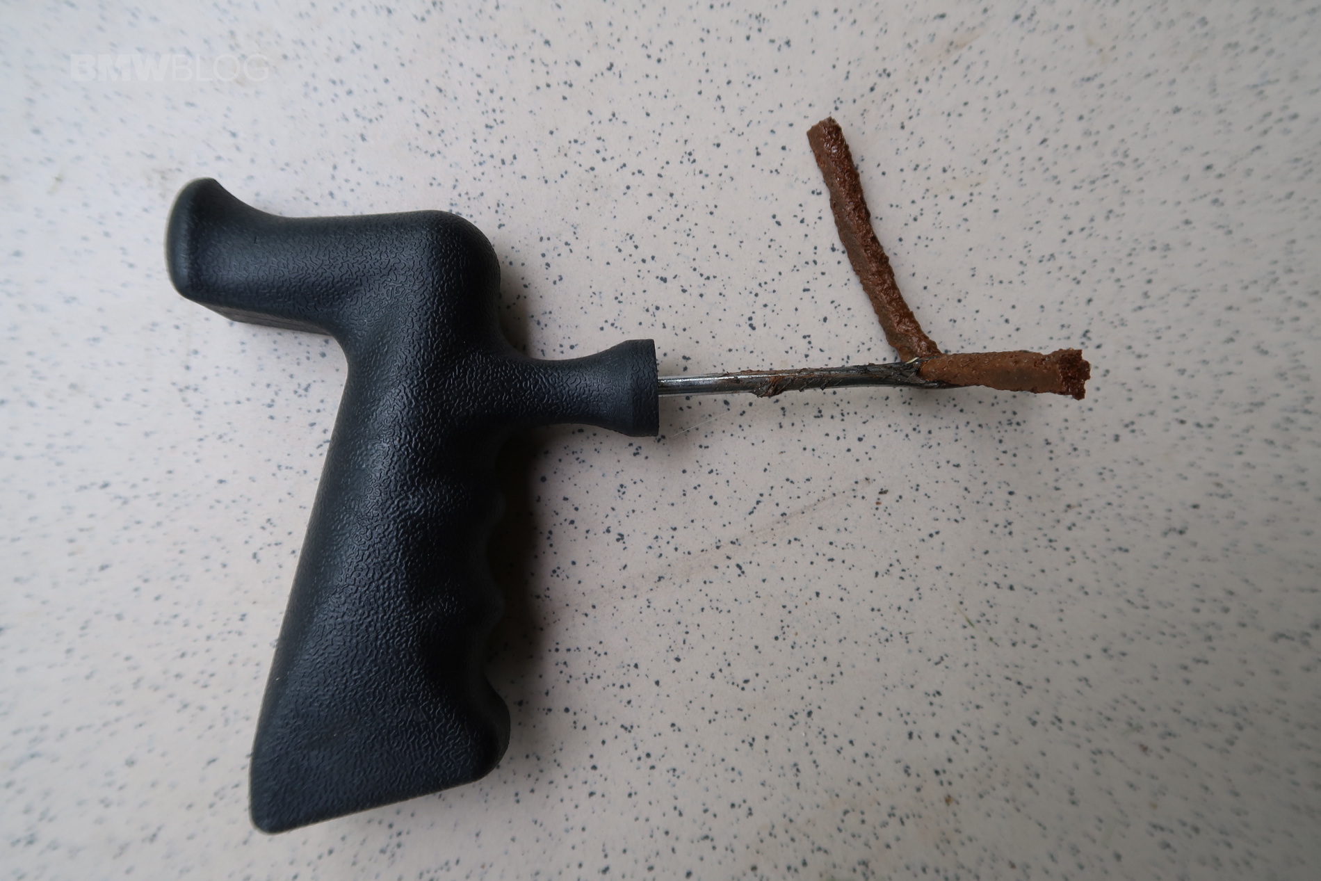 Briefly describing the repair process, use a pair of pliers to wiggle the offending screw or nail until it comes out. Once out, you will hear an immediate hiss of air. Then grab the rasp to enlarge and make the hole uniform for the upcoming plug. Next lubricate the rasped hole with the white grease provided.