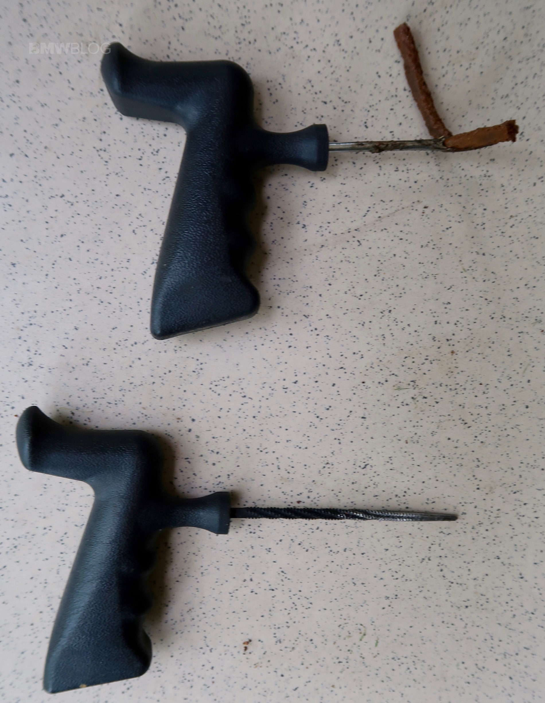Make sure to put tire plug in the needle style tool with only 1/3 through loop – meaning don’t center the plug on the tool. It needs to be offset 1/3, 2/3rds. Then jam the thing home in the rasped out hole and pull the tool back out fast so the plug seats. Next cut off the excess sticking out.