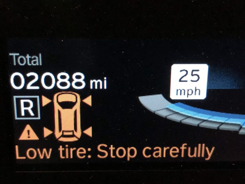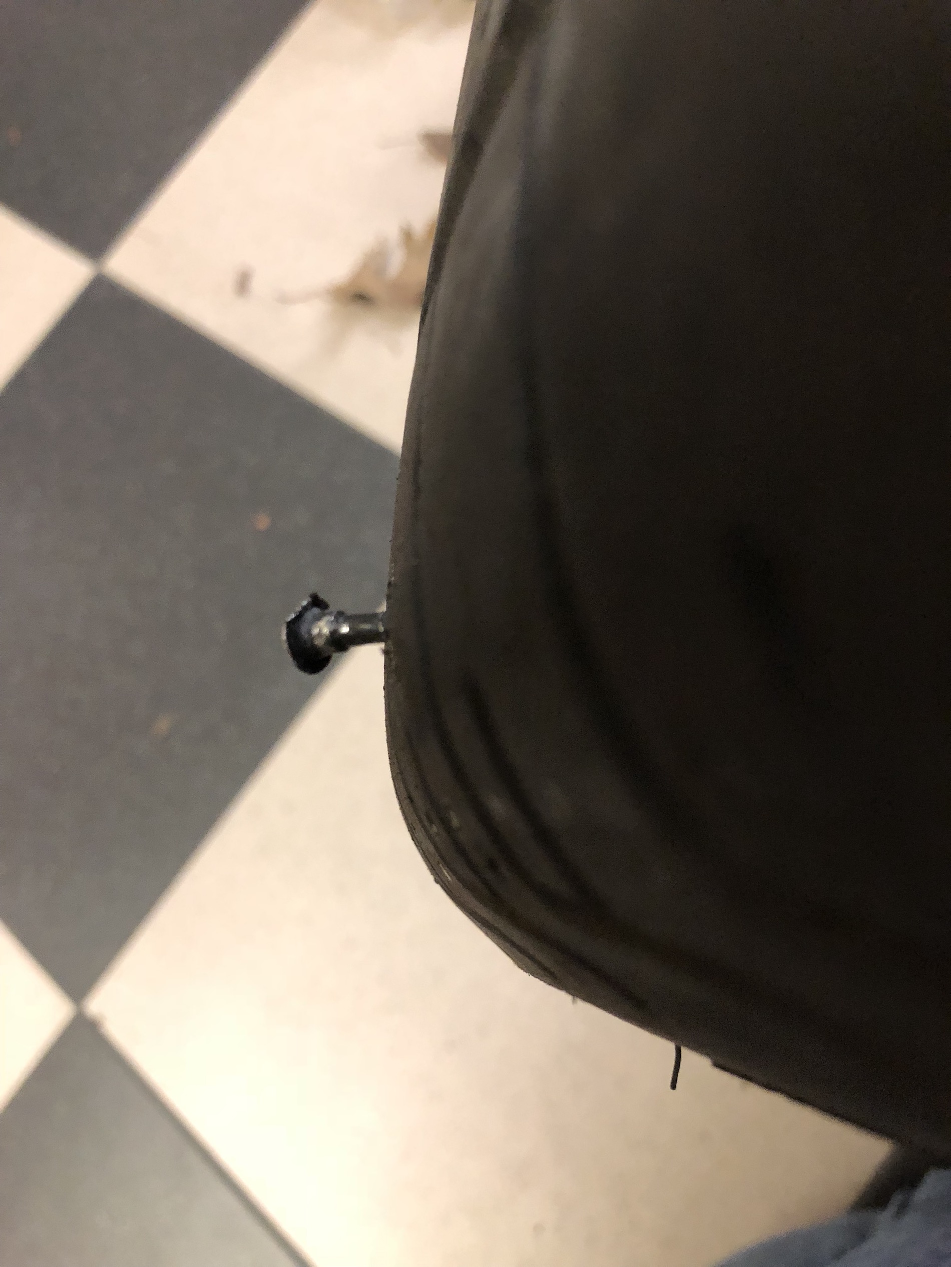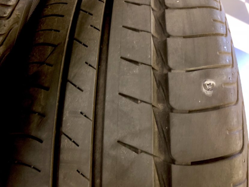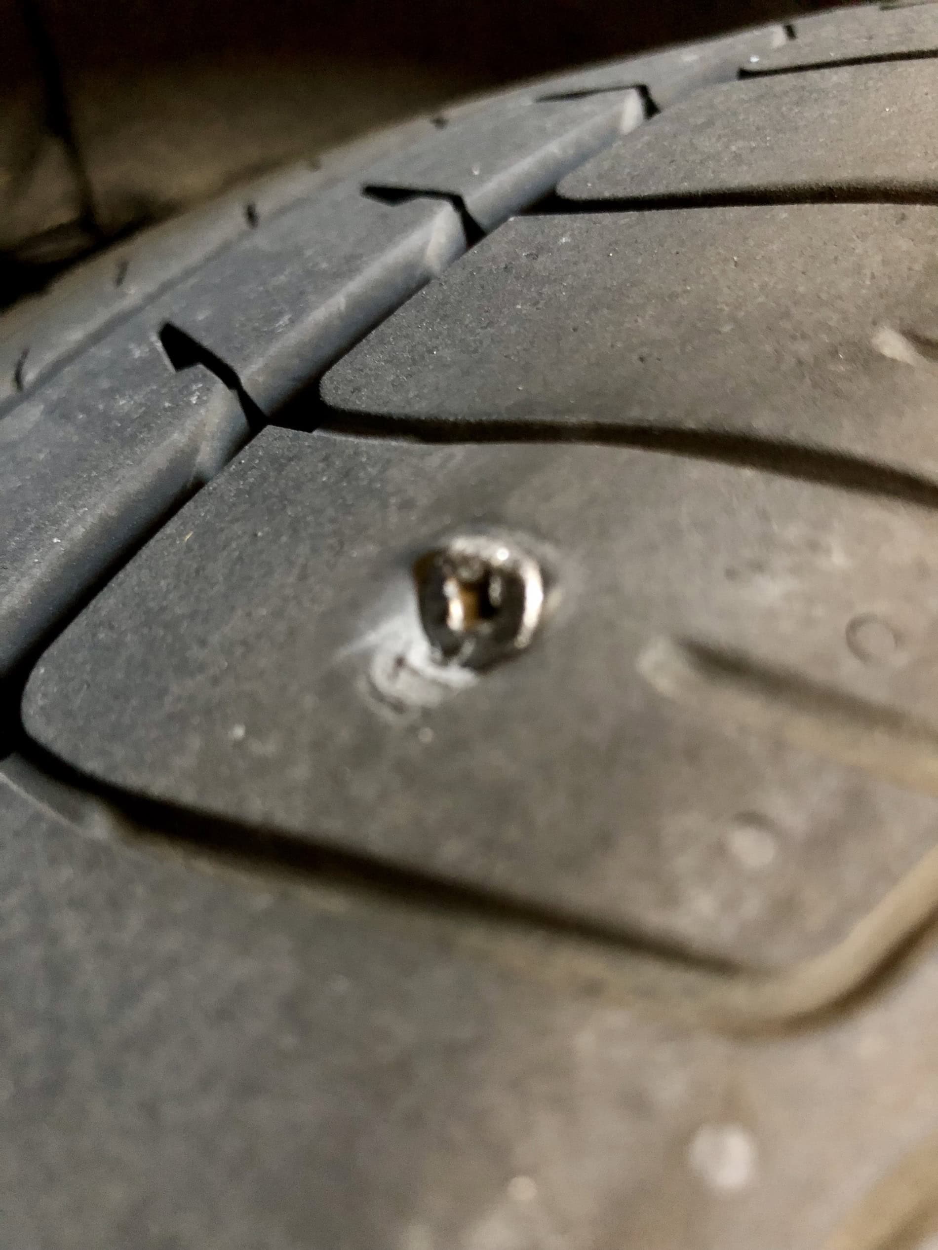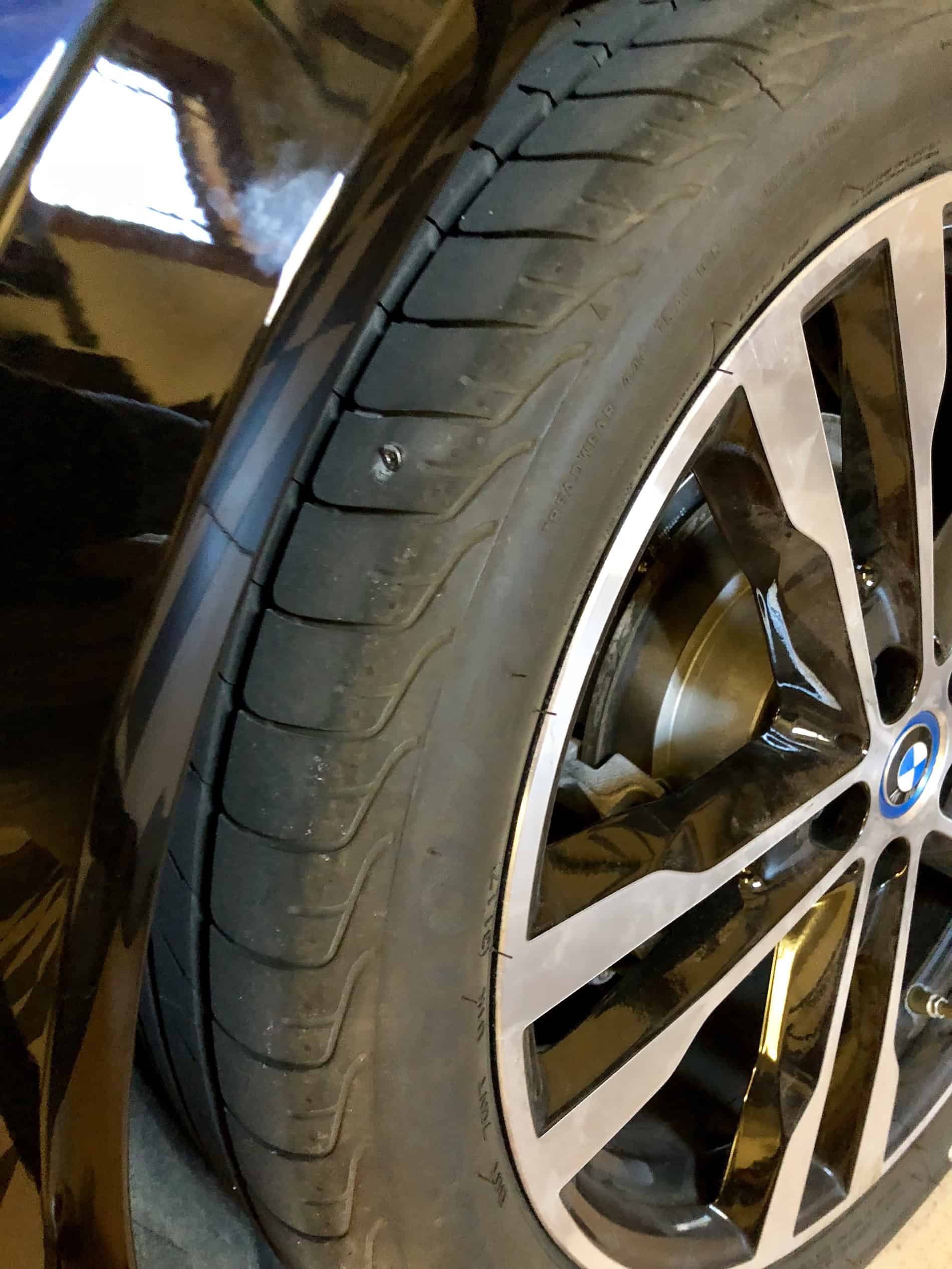 Our 2018 i3s’s first flat occurred in February when we were leaving work. At 2088 miles the driver’s rear tire was half the pressure it was supposed to be, 20 psi instead of 41. So we topped the tire up with air at a local gas station and crutched it home, watching a live read out of the PSI in the tire the whole way. This flat caused a loss of 20 psi in about 8 hours. When I took the wheel off the car at home, I found a screw in the tread.