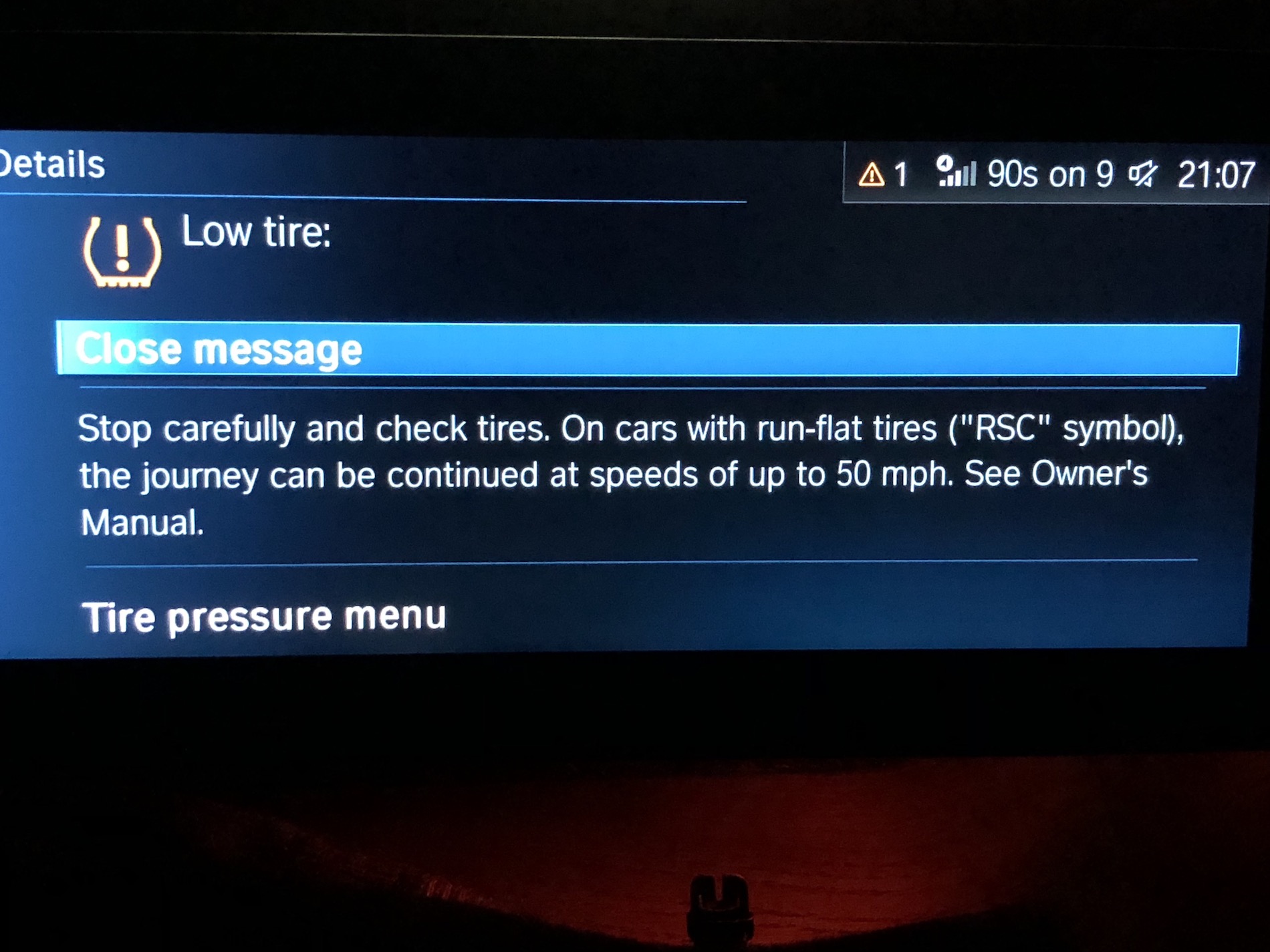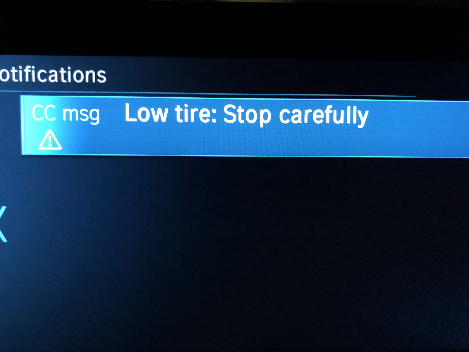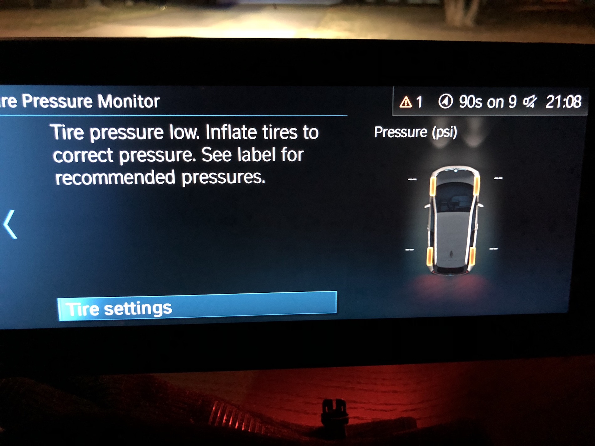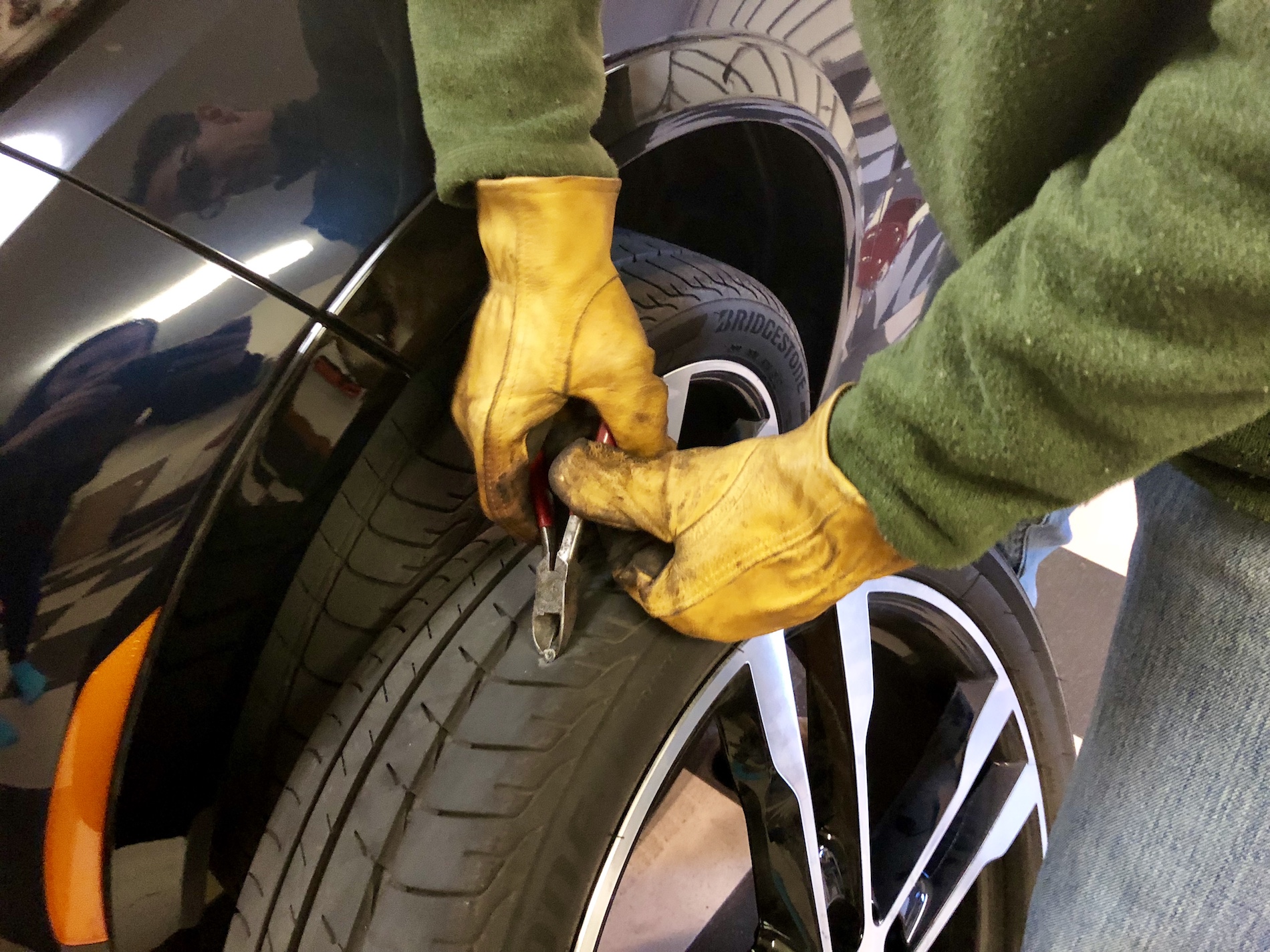 Our 2018 i3s’s first flat occurred in February when we were leaving work. At 2088 miles the driver’s rear tire was half the pressure it was supposed to be, 20 psi instead of 41. So we topped the tire up with air at a local gas station and crutched it home, watching a live read out of the PSI in the tire the whole way. This flat caused a loss of 20 psi in about 8 hours. When I took the wheel off the car at home, I found a screw in the tread.