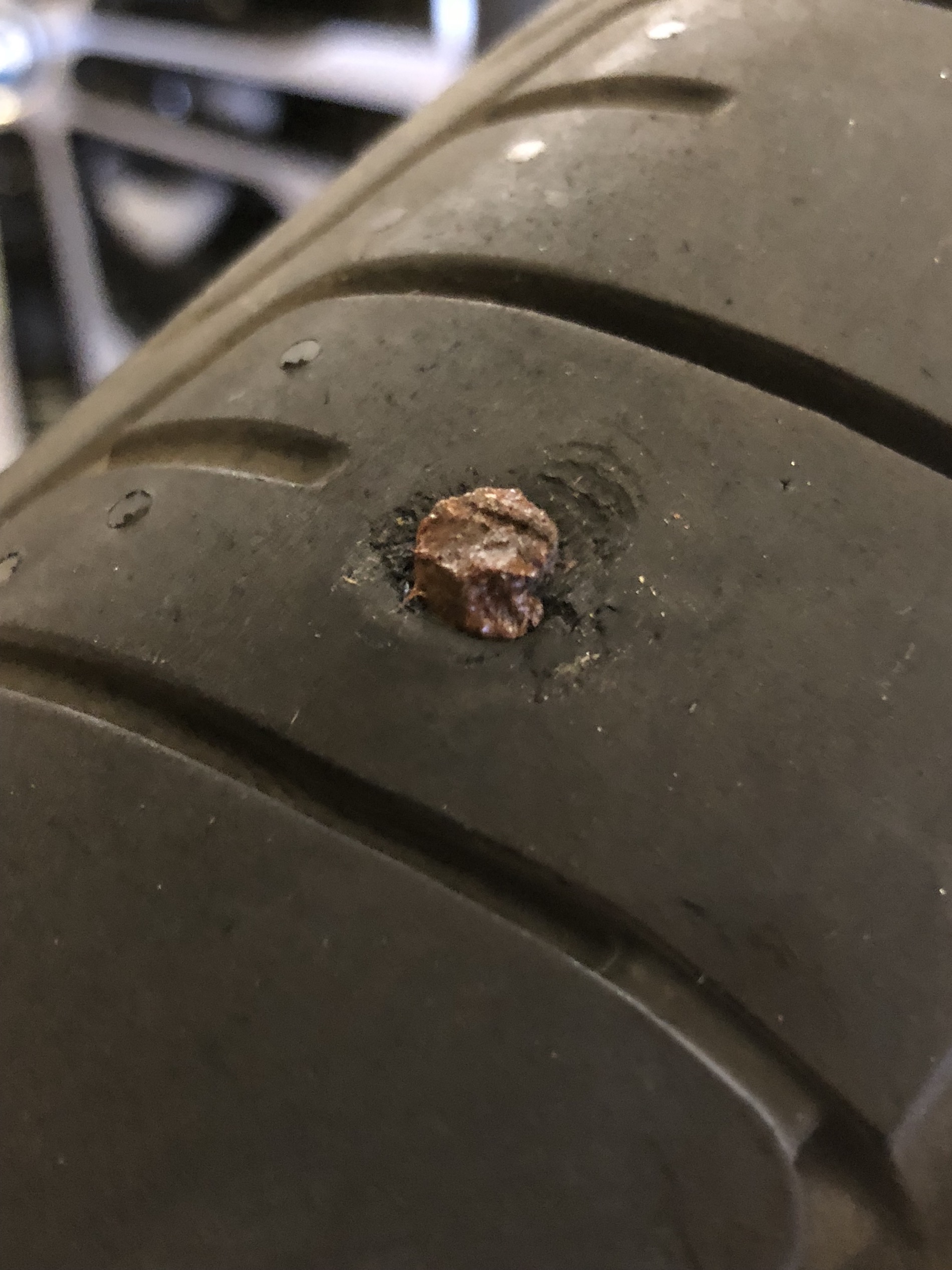 The second flat we got on our 2018 i3s came at 4700 was caused by a thin nail in the passenger rear. This one was a little harder to find as it started as a slow 3 psi/week leak. I pulled the rear tire off and searched the tread for the culprit, finding a small nail in the center.