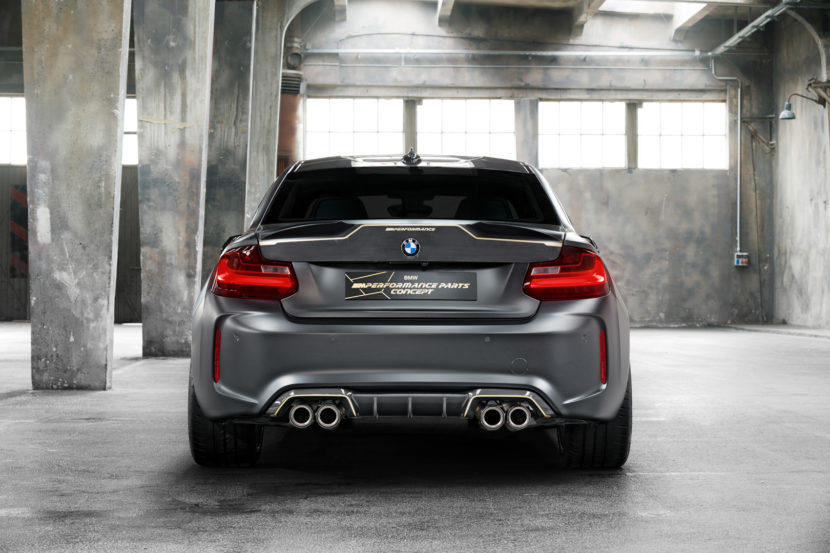 While this exact car won’t become a production car, many of its parts will be available for M2 owners by the end of this year. Those parts include the carbon fiber kidney grilles, hood, side panels and even the rear trunk lid. The M Performance carbon fiber tailgate (expected to be available from 11/2018) weighs five kilograms less than the standard part. The M Performance carbon fiber rear diffuser reduces the car’s weight by 0.5 kilograms.
