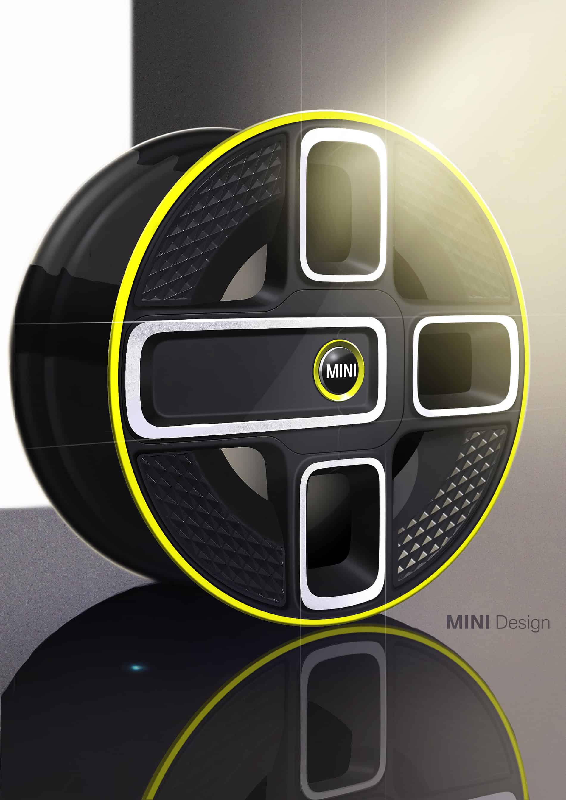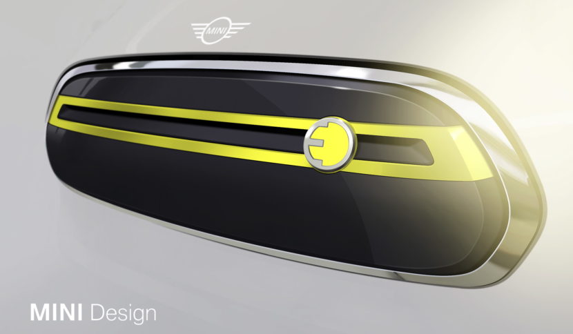 The sketches show the car’s grille. Its hexagonal form is a signature MINI design element, but the closed-off interpretation is all new. Behind the grille, cooling elements are conspicuous by their absence – which means the grille can stay closed and therefore improve airflow. A yellow accent bar with an E badge in the same colour produces a powerful contrasting effect and identifies this as an electric MINI.
