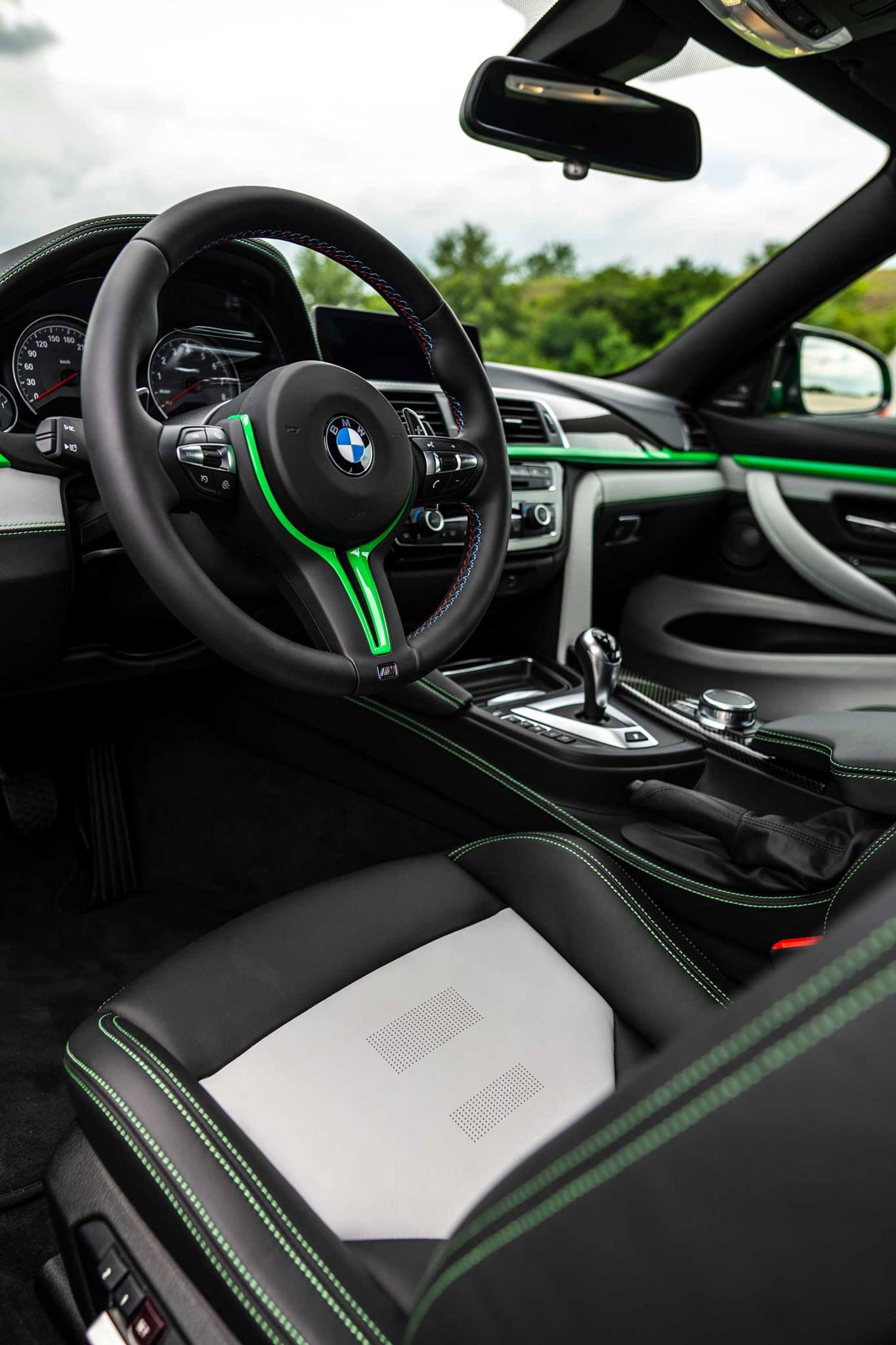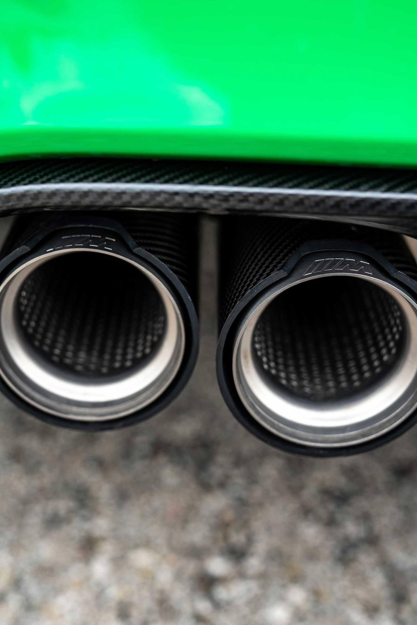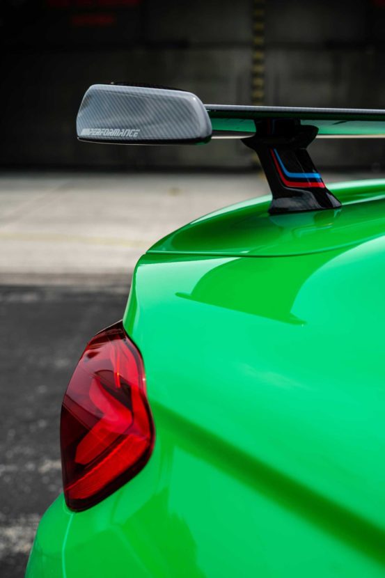 Not only the standard carbon roof and the star-spoke alloy wheels, but also the tuning accessories from BMW M Performance set dark accents in the livery of Signal Green. Front apron attachments, front splitter, exterior mirrors, rear diffuser and tailpipe covers made of carbon are just the prelude, the highlight is undoubtedly the big BMW M Performance Carbon Fiber rear wing.