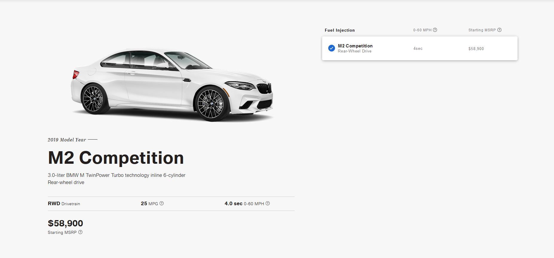 BMW M2 will start at $58,900, which is only a few thousand dollars more than the standard M2 car. For that extra money, you get an upgraded engine, which is now a 3.0 liter twin-turbo I6 with 405 hp and 406 lb-ft of torque. It also is supposed to be sharper and more aggressive to drive than the standard M2