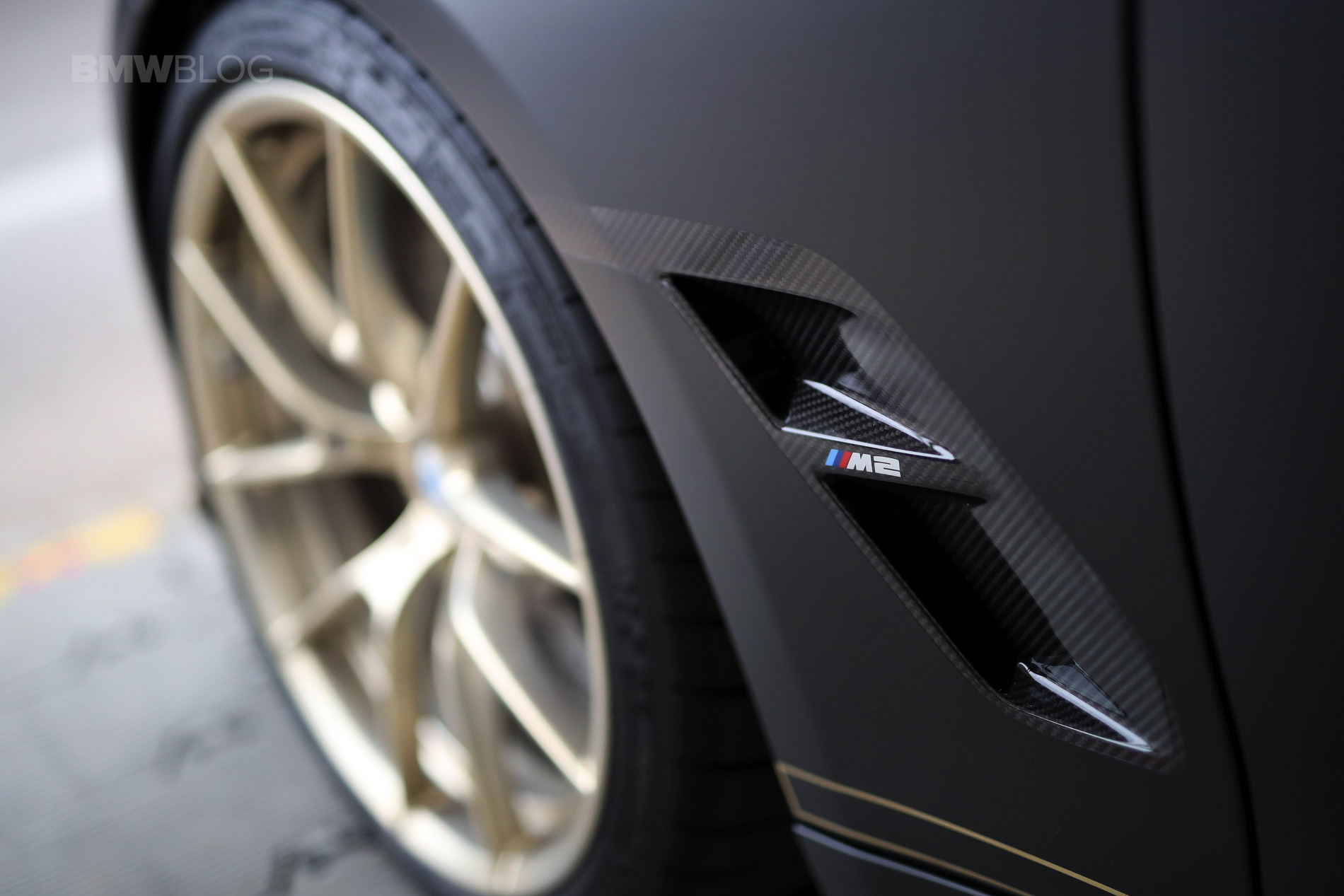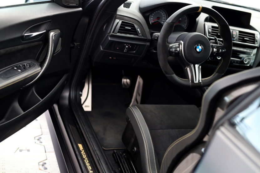 The M2 Concept with M Performance Parts feature a Frozen Black finish with gold M Performance decals that give the car a motorsport-inspired look. It also gets a carbon fiber hood with a power dome, a carbon fiber roof finished in a glossy clear finish, a completely new trunk lid with an integrated carbon fiber spoiler and new gold wheels.