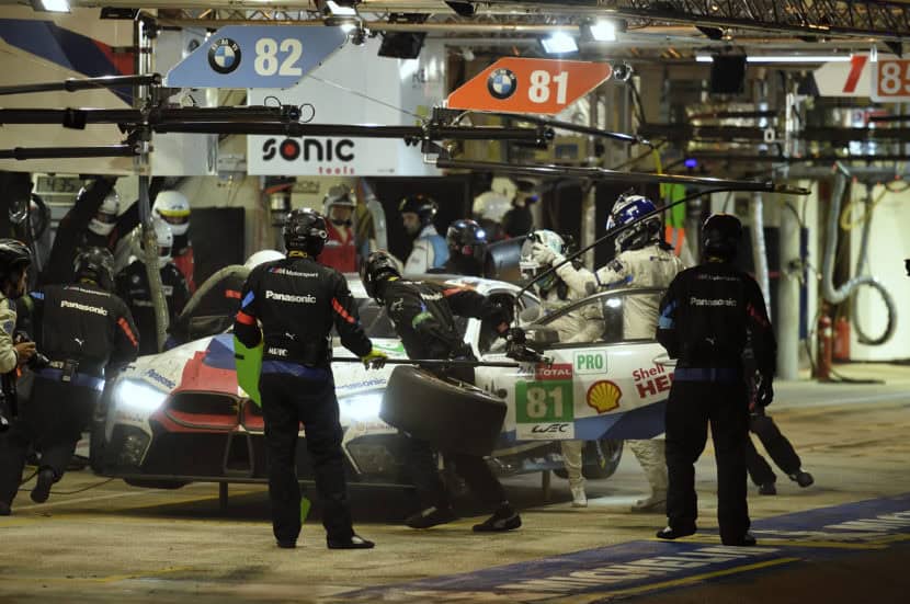 In the FIA World Endurance Championship things are a bit different. In this case the BMW M8 GTE is the weapon of choice and the car is stationary for about 35 seconds, depending on the volume of fuel being injected back into the tank. There are 8 people involved: 4 mechanics, 1 lollipop man, 2 refuellers, 1 fire extinguisher. The procedure involves a refuel, tire change and check at the same time, parallel driver change, where applicable. The speed limit is 60 km/h no matter the track.