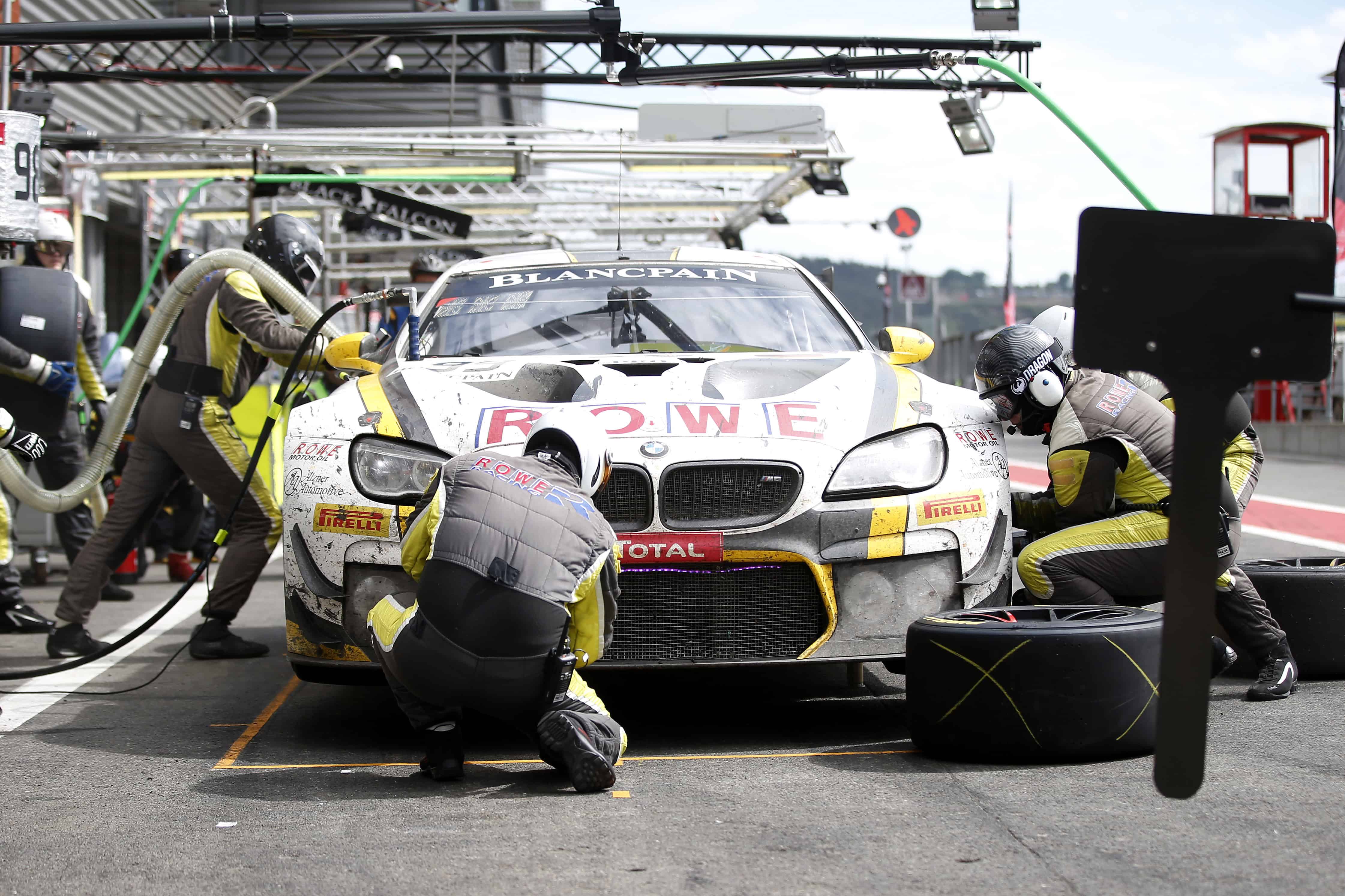 In the Blancpain GT Series, namely the 24-Hour race of Spa-Francorchamps, the challenge is sticking to the predefined minimum pit stop times as closely as possible so that you don’t lose any time, and timing the pit stops in the race to perfection strategically and tactically, for example during yellow flag or safety car periods. This applies to the predefined technical stop between the 10th and 15th hour of racing, which must take a total of five minutes, including entry and exit, and ideally is used to change the brake discs. Also, in each quarter of the race (once within six hours), the team has a joker pit stop, for which no minimum duration applies. Ideally, you can gain 10 to 15 seconds in these stops.