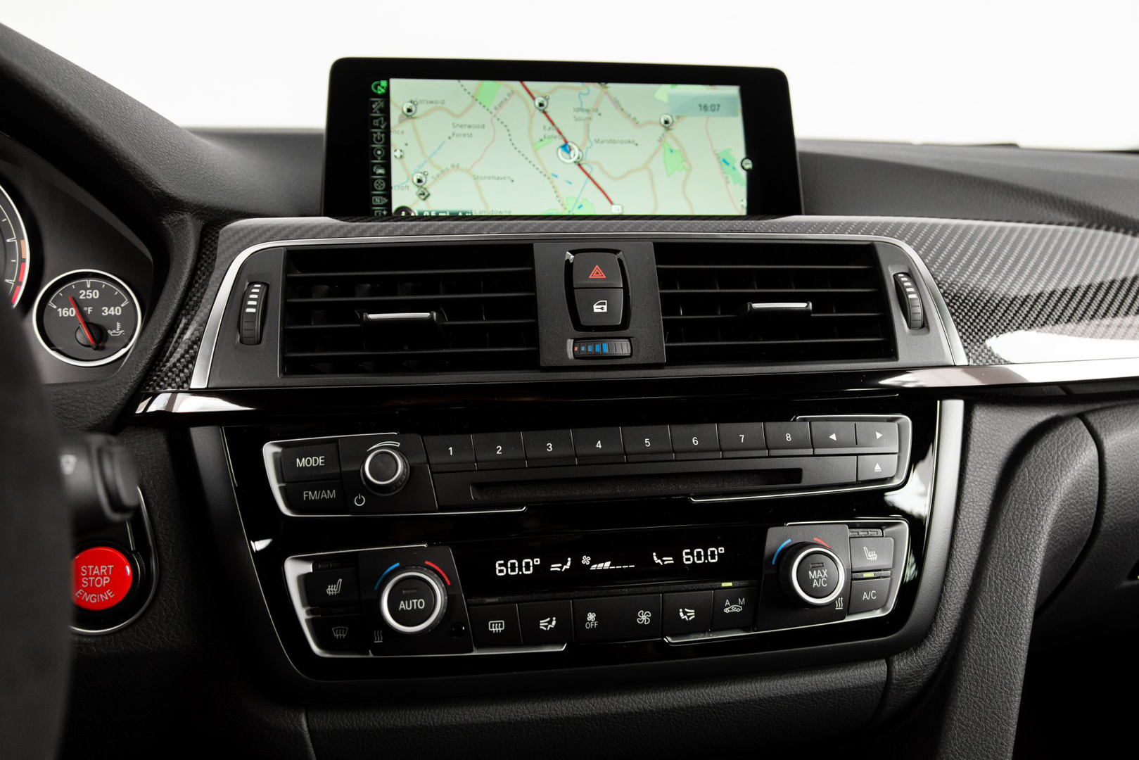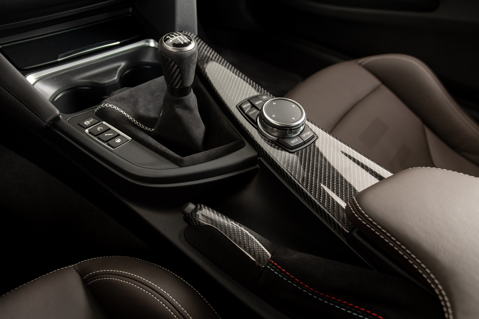 Inside, this BMW M4 gets another Individual option, the Cohiba Brown leather, which looks absolutely spot on in contrast with the San Marino Blue paint. We also see more M Performance Parts inside, such as the Display Steering Wheel, with glossy carbon fiber, Alcantara and M-colord contrast stitching. The Display wheel looks very cool, though it is a bit odd to hold. More importantly, it gets a new shift lever for its six-speed manual gearbox. It’s another M Performance Part and it’s a stubby little knob with carbon fiber inlays that looks fun to throw.