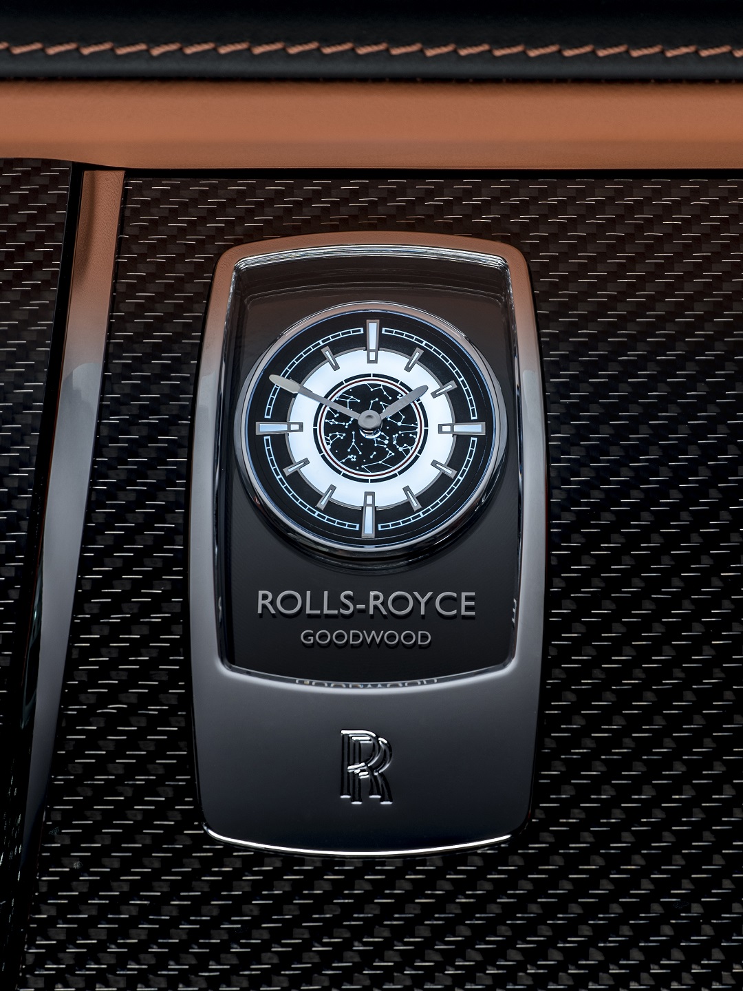 The Rolls-Royce clock embodies the Nebula theme in miniature. A depiction of a portion of the night sky in the Northern Hemisphere in March are back-lit on the clock’s face, encircled in the accent ‘Sunset’ color, providing the impression of viewing the stars through the window of a spacecraft. A repeated hexagonal motif has been embroidered into the rear of each motor car, reflective of the honeycomb structure used in some of the most ambitious and technologically advanced aerospace developments, from space telescope mirrors to space station windows. Speaker covers most commonly bestow a jewelry-like impression on the interior of a Rolls-Royce, however in this iteration, they have adopted a blackened aesthetic, to further the technical feel once more.