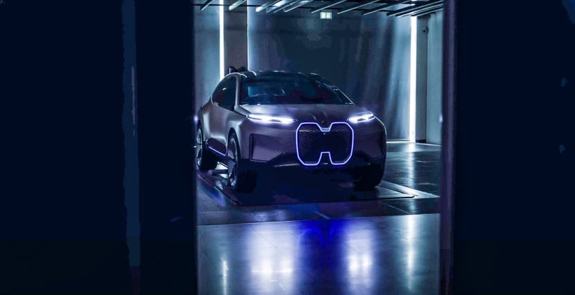 The front end is completely exposed, showing off its massive, tall Kidney “Grilles”, which aren’t really grilles, obviously, as it’s an electric car. They’re huge and tall and trimmed in blue lighting. In design, they look a lot like the ones shown on the Vision iNEXT Concept from a year ago, only bigger and, frankly, worse.