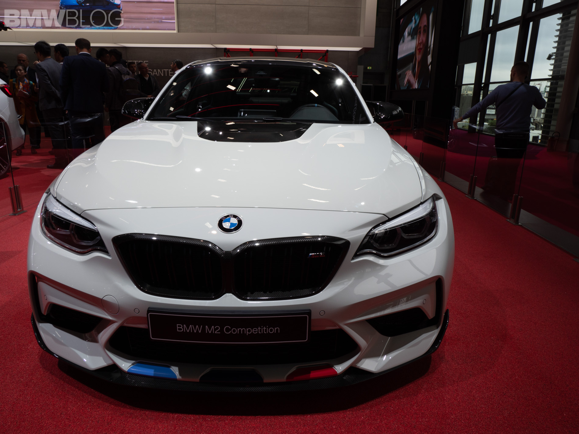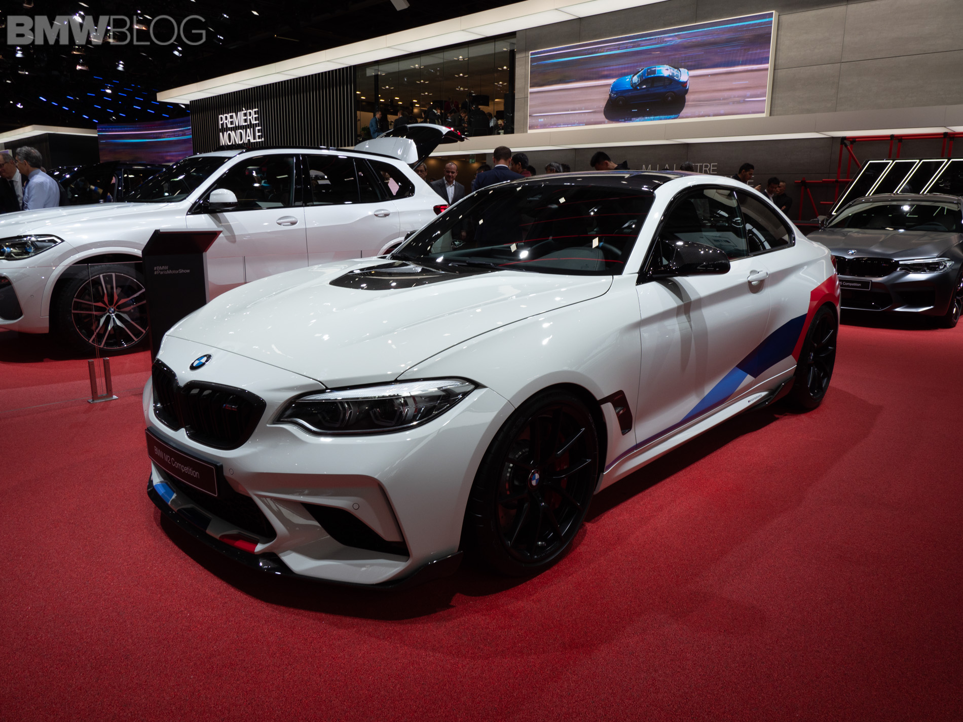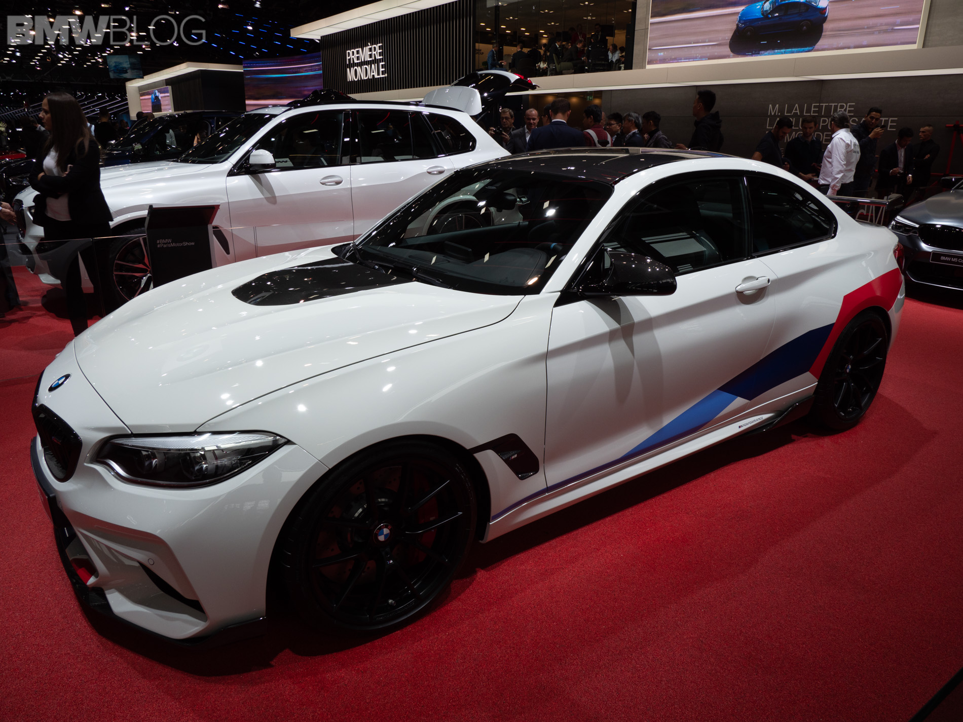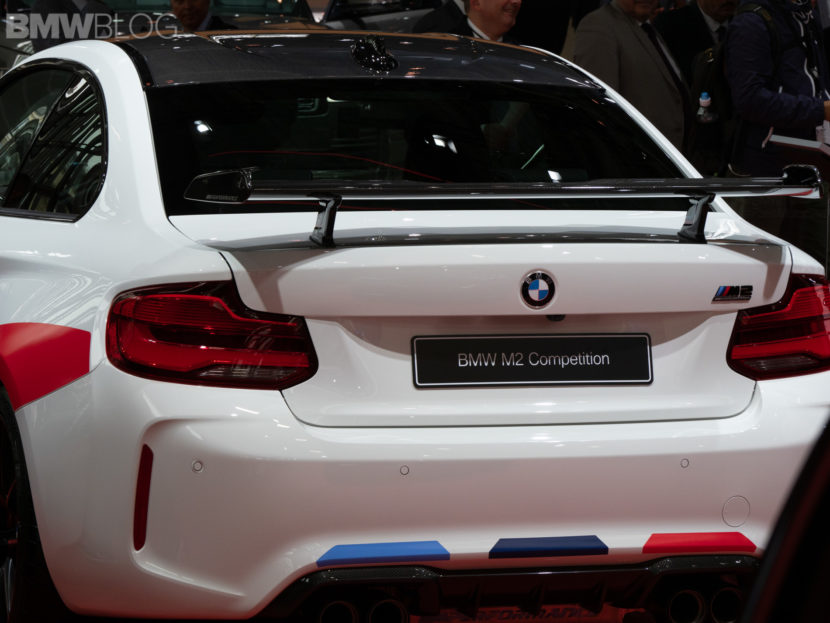 Seen here at the 2018 Paris Motor Show is the BMW M2 Competition wearing M Performance parts and they turn its fury up to eleven. At the front, it gets gloss black Kidney Grilles, a carbon fiber front lip and, interestingly, a gloss black hood bulge, which looks different on an Alpine White M2 Competition with M Performance livery.