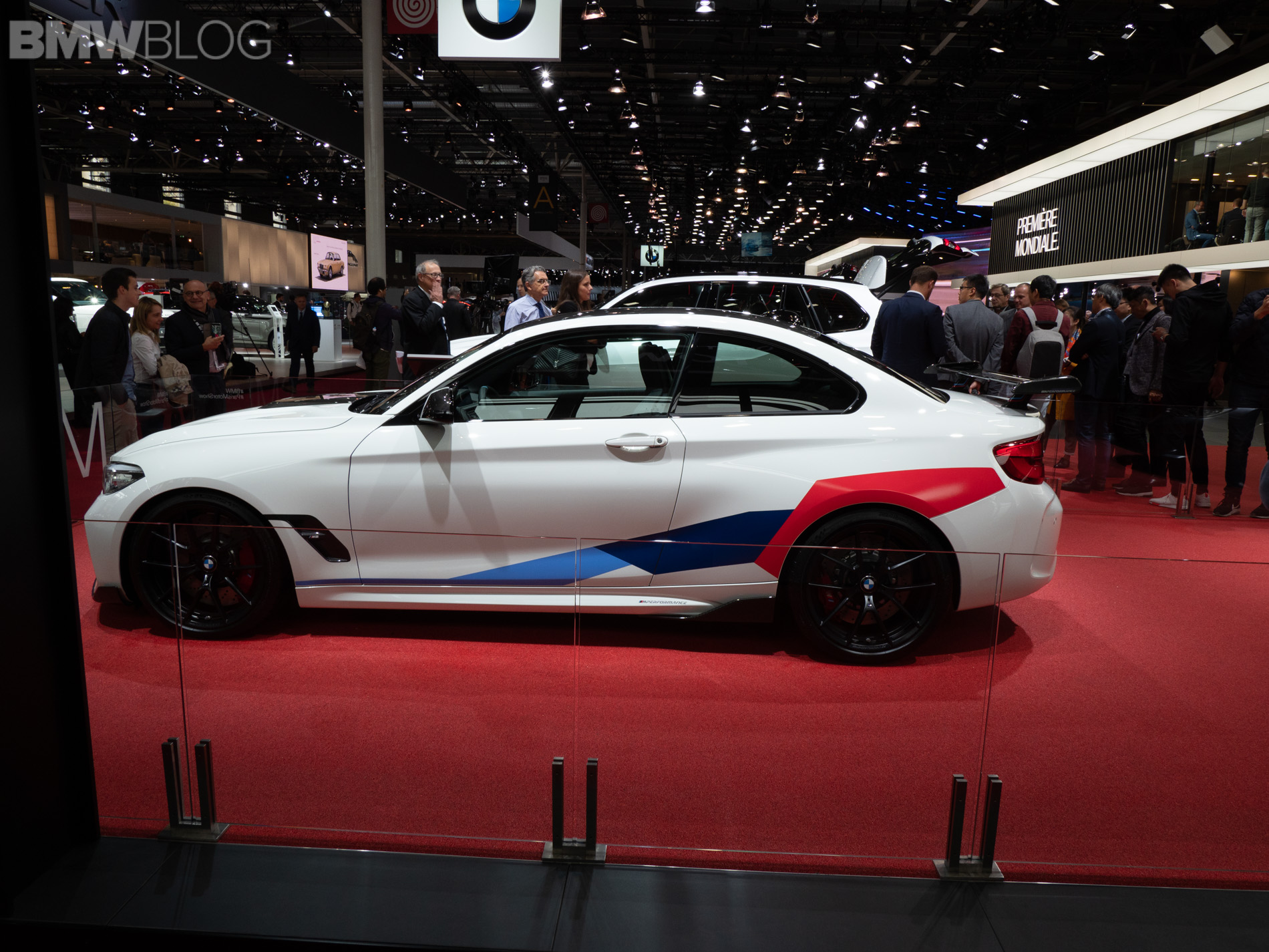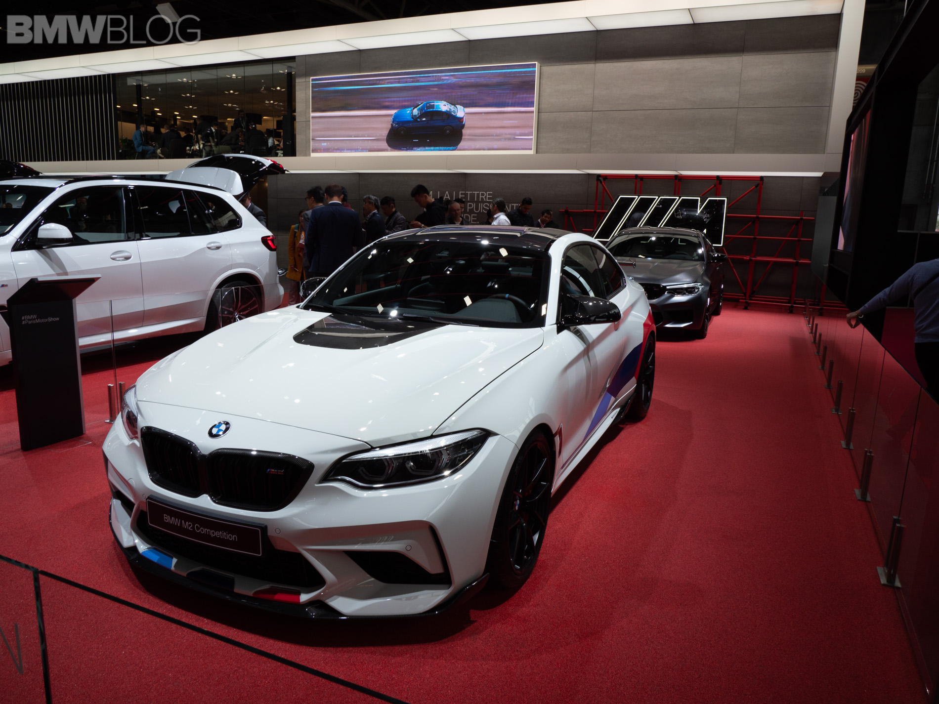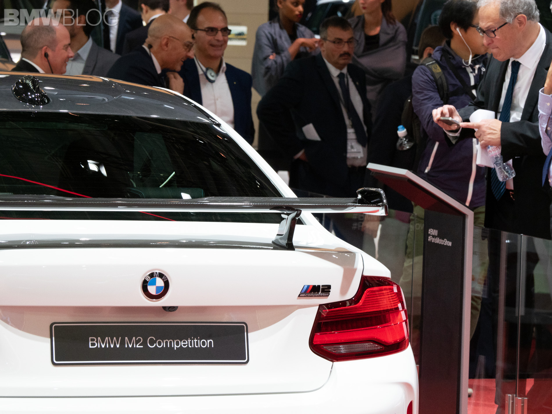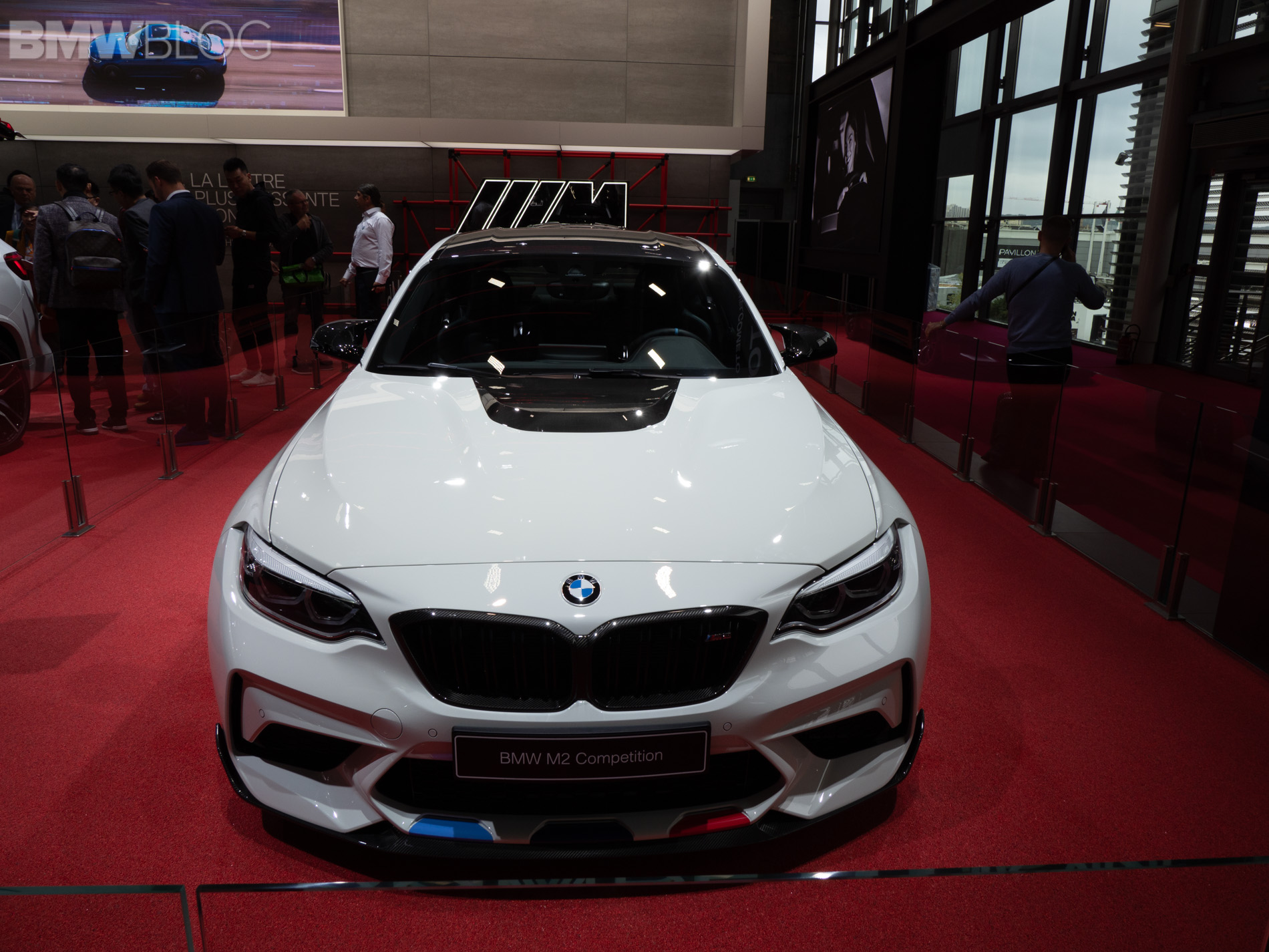 Seen here at the 2018 Paris Motor Show is the BMW M2 Competition wearing M Performance parts and they turn its fury up to eleven. At the front, it gets gloss black Kidney Grilles, a carbon fiber front lip and, interestingly, a gloss black hood bulge, which looks different on an Alpine White M2 Competition with M Performance livery.